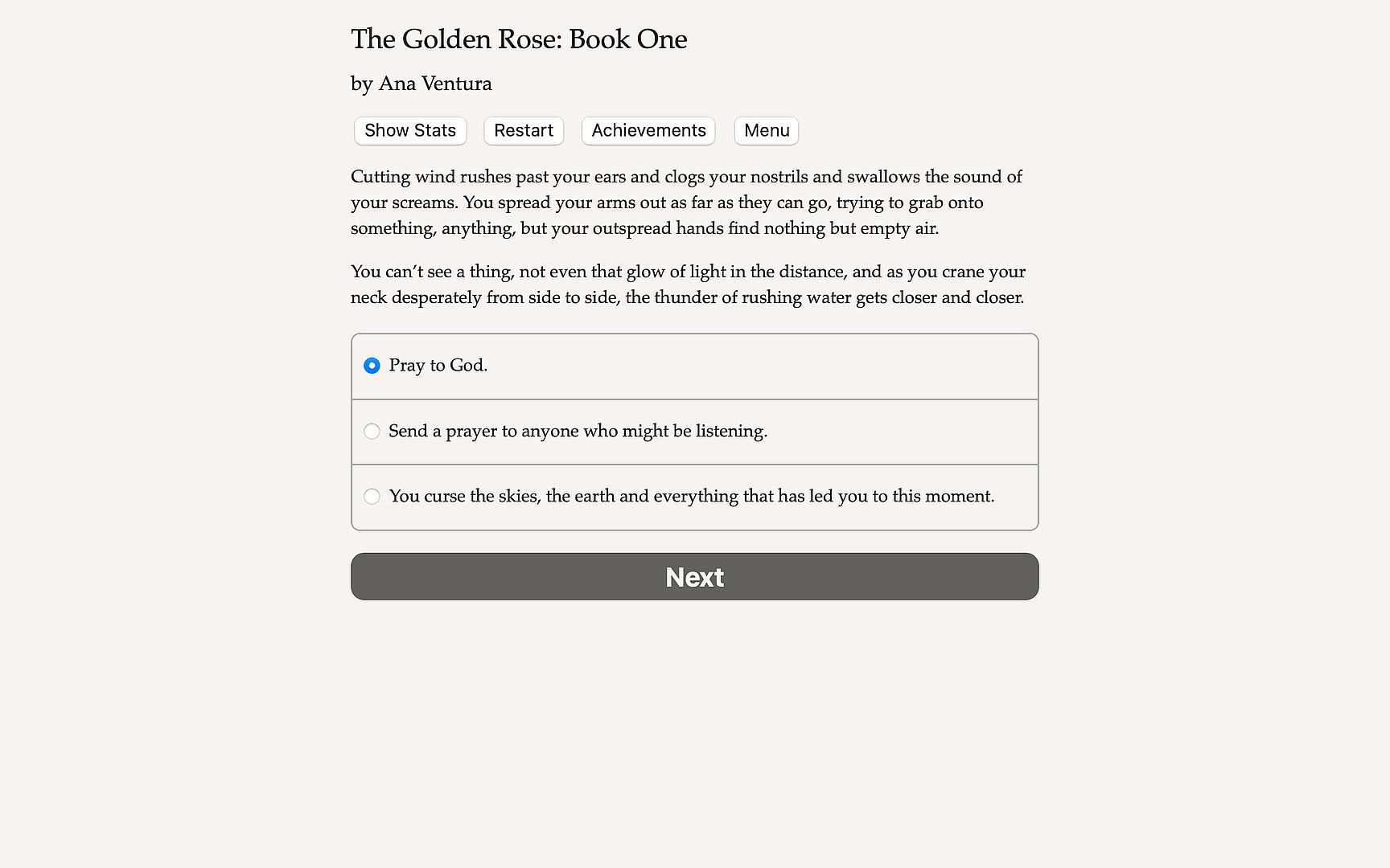"The Golden Rose: Book One" is a thrilling 1.2-million-word interactive fantasy novel by Ana Ventura, where your choices control the story. It's entirely text-based—without graphics or sound effects—and fueled by the vast, unstoppable power of your imagination.