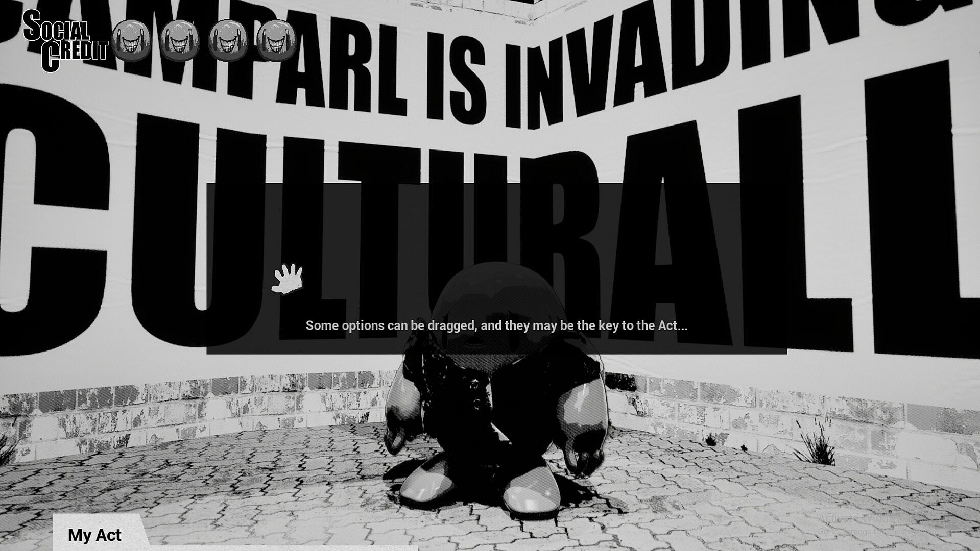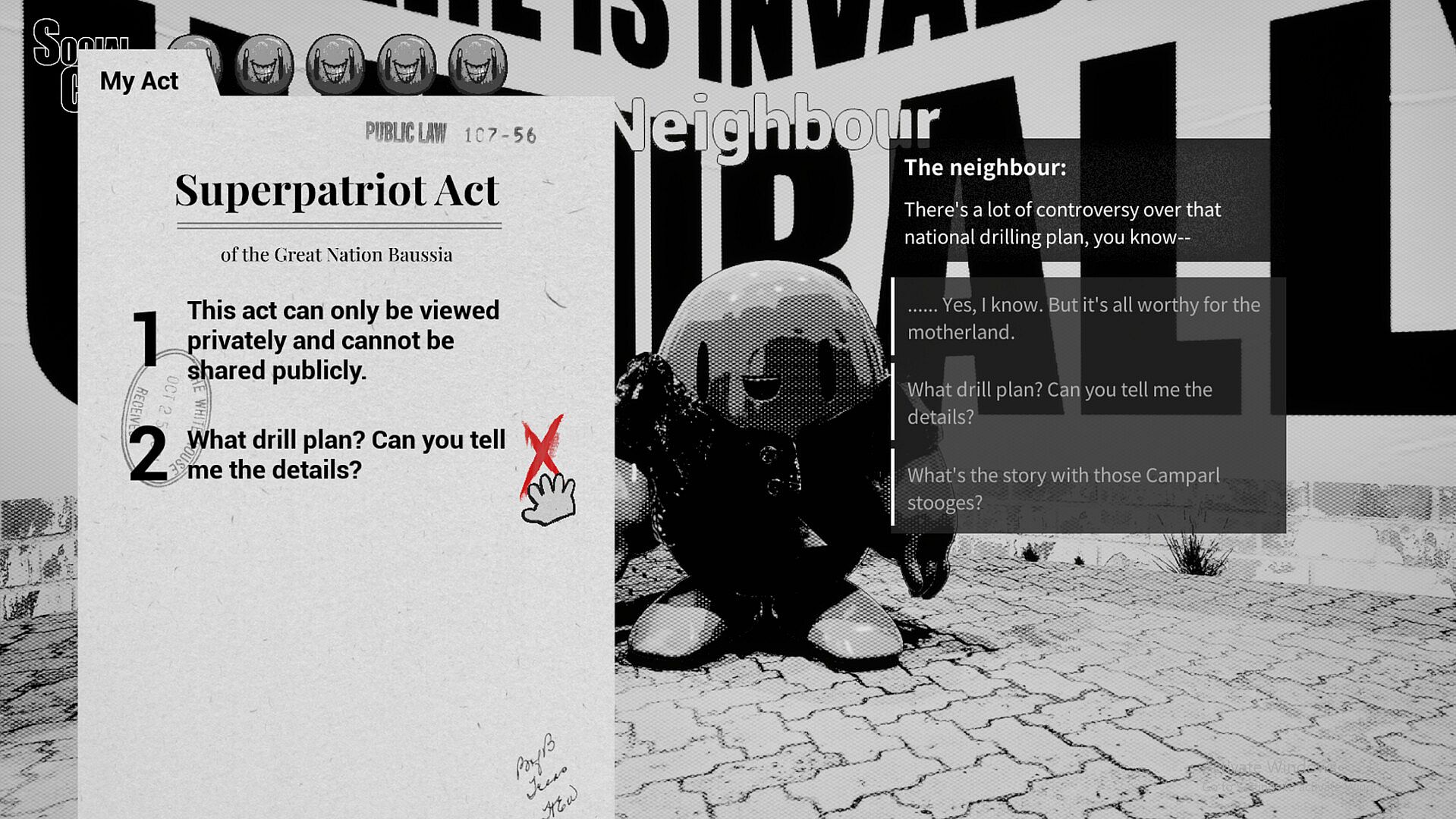 The Great Report Era is a 3D RPG political-simulating game, which displays the reflection of 5 different characters after the government of “Baussia” enacted the “Superpatriot Act” – a nationalist anti-espionage bill. The main gameplay (mechanism) is to collect the possible articles from dialogues, and to use your articles (from your own Superpatirot Act) to report other NPCs to the authority; meanwhile, the player will dig out the truth of “Great Drill Plan” through this process.
