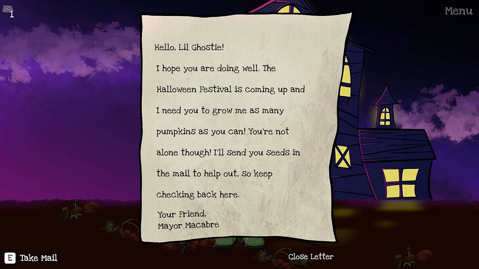 The Hallowed Garden is a simple, cozy farming game with a Halloween aesthetic. You play as Lil Ghostie, a farmer hard at work on their pumpkin patch. The mystical Mayor Macabre has asked you to grow jack-o'-lanterns for the Halloween Festival. Check your mailbox for enchanted seeds, plant them, water them, fertilize them, and watch them grow! As your garden grows, you will unlock new areas, new equipment, new music, and more story. This farming game was designed to be a calm, atmospheric way to enjoy the Halloween season in a cozy way instead of having to be scared.