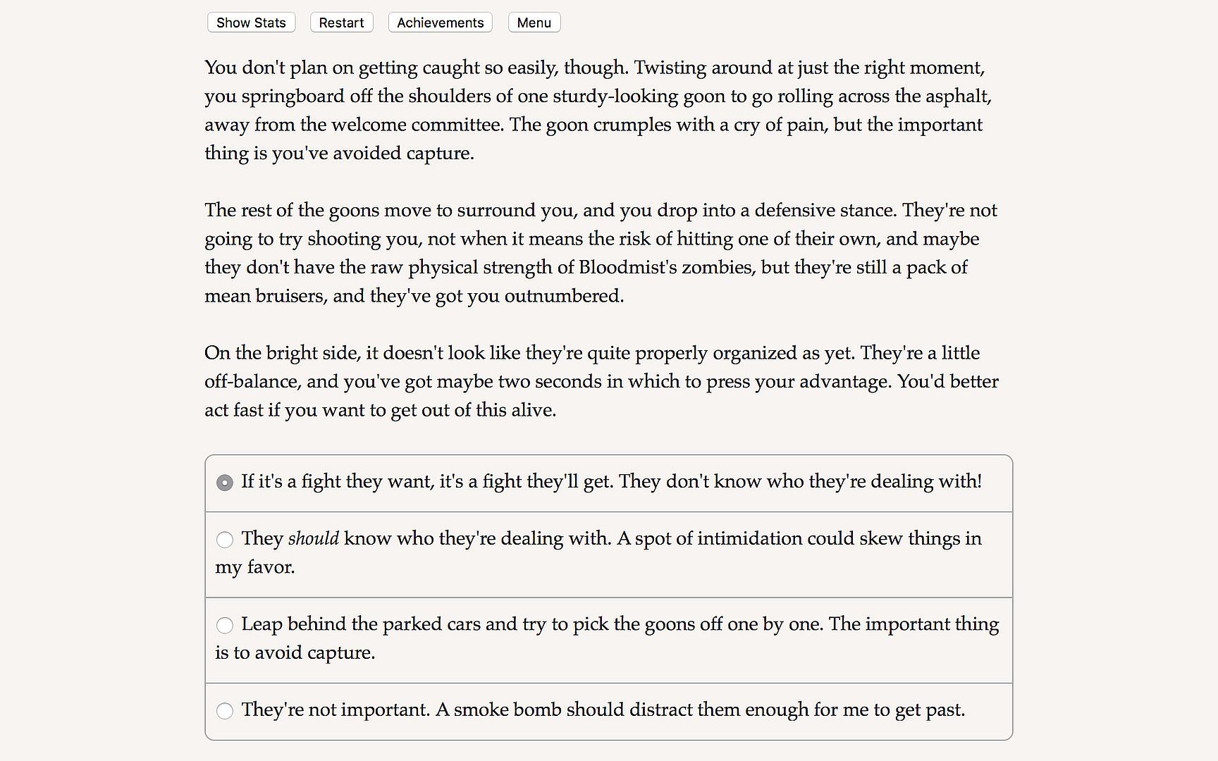 The Hero Unmasked is a 300,000 word interactive novel by Christopher Huang. It's entirely text-based, without graphics or sound effects, and fueled by the vast, unstoppable power of your imagination.