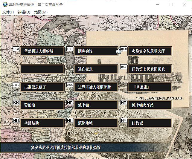 There are over 90 historical battles, such as Repel the Border Ruffians in Kansas (1854), Walker's Midnight Ride (1855), Protection Free Negro (1855), Battle of Black Jack (1856), Battle of Fort Franklin (1856), Fort Bain (1857), Set the slaves free (1858), Harpers Ferry (1859), Beating back the slave traders (1860), Bull Run (1861), Glorieta Pass (1862), Gettysburg (1863), New York City Draft Riots (1863), Wilderness (1864), and Appomattox (1865).