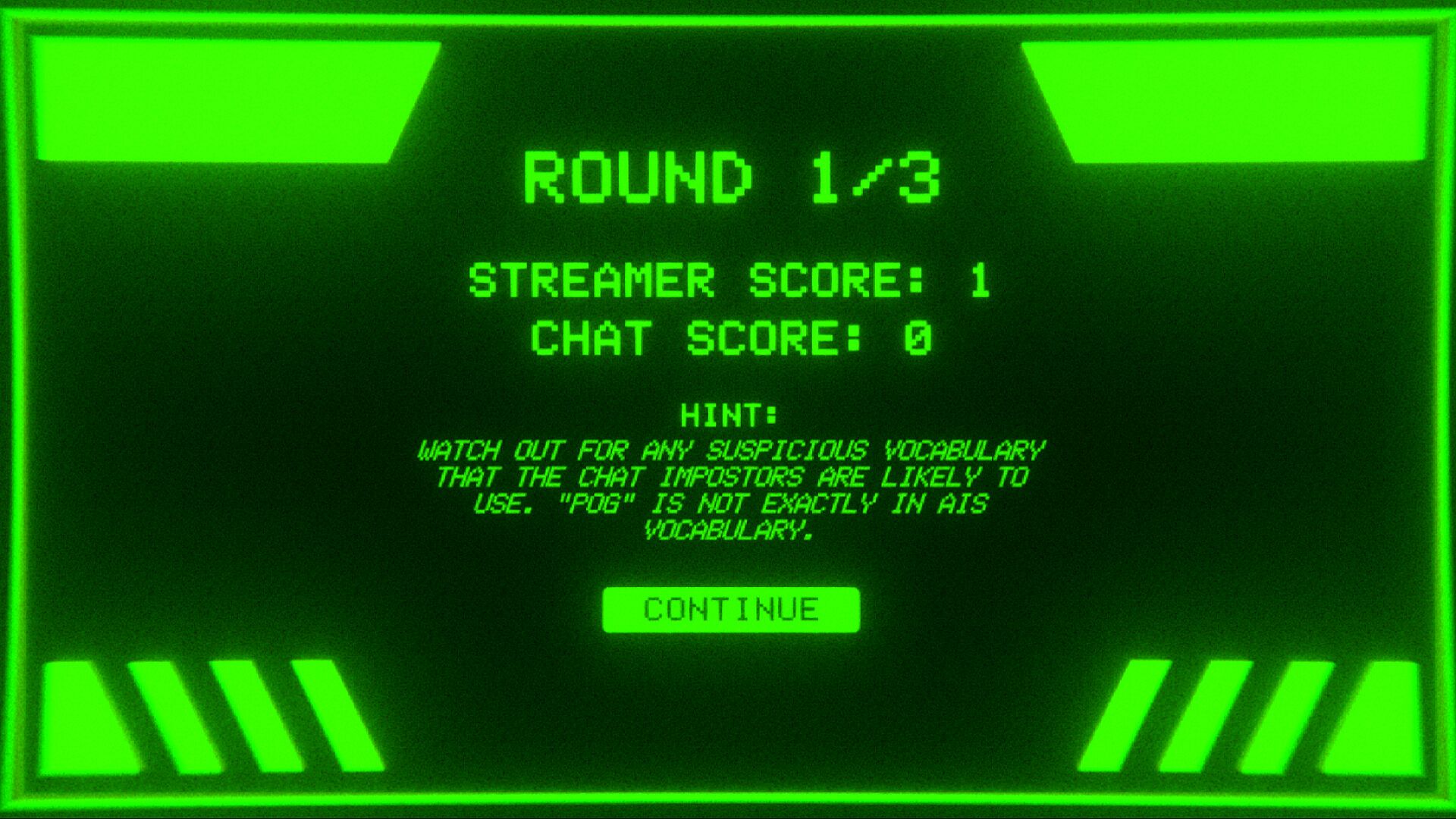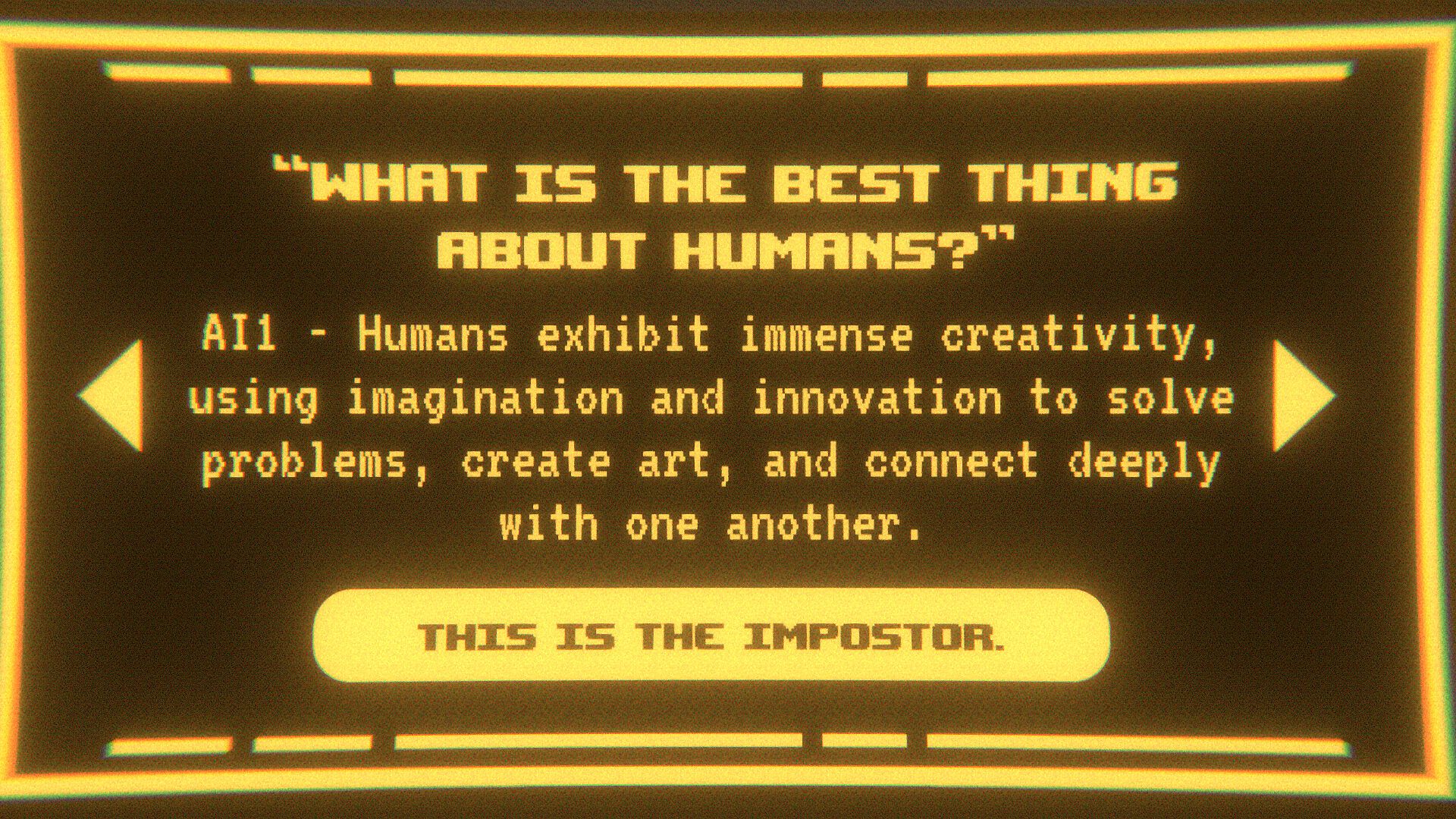 The detective picks a question for the impostor to answer. The impostor must write an answer which will sound like it is AI-written. The impostor loses the round if he is exposed.