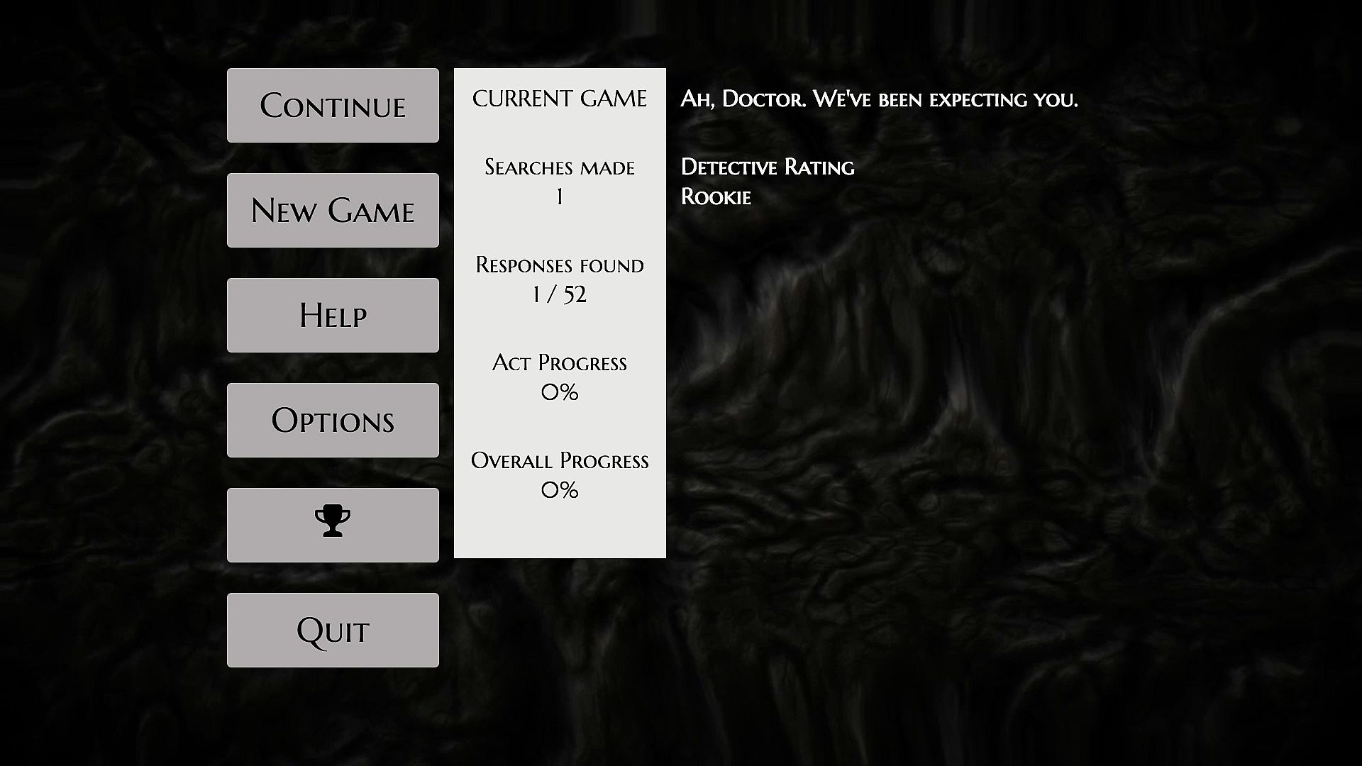 The Infectious Madness of Doctor Dekker is a Lovecraftian FMV murder mystery, which gives players full freedom to question suspects by typing their own questions instead of picking them from a predetermined list. There are no point and click puzzles to solve, just questions to ask and evidence to inspect.