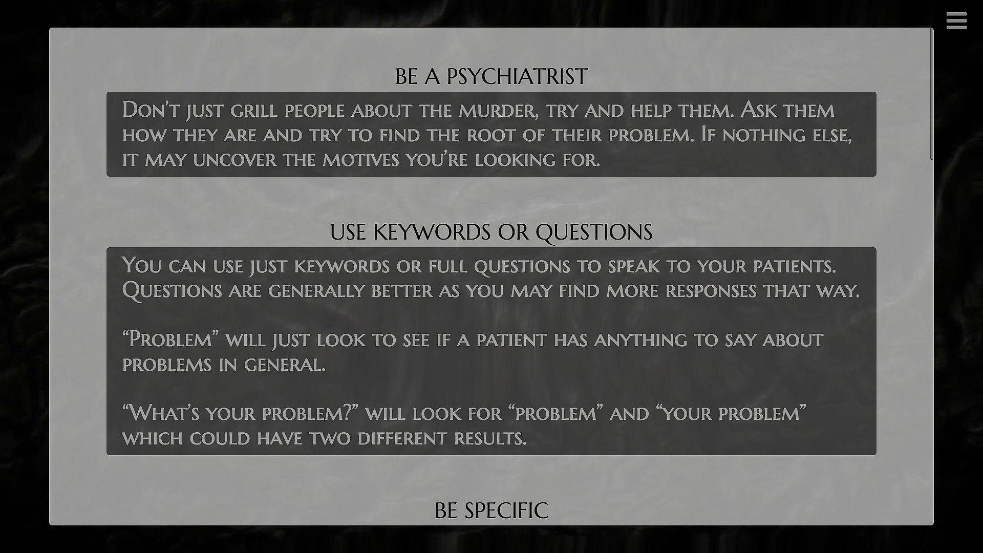 No. A lot of the time you might get "don't know" answers to your questions, because there are only 1600+ actual filmed responses in the game. Listen to what patients say and follow their lines of conversation to stay on track. Responses are keyword based, so literally typing words patients have already used will do half the job for you.