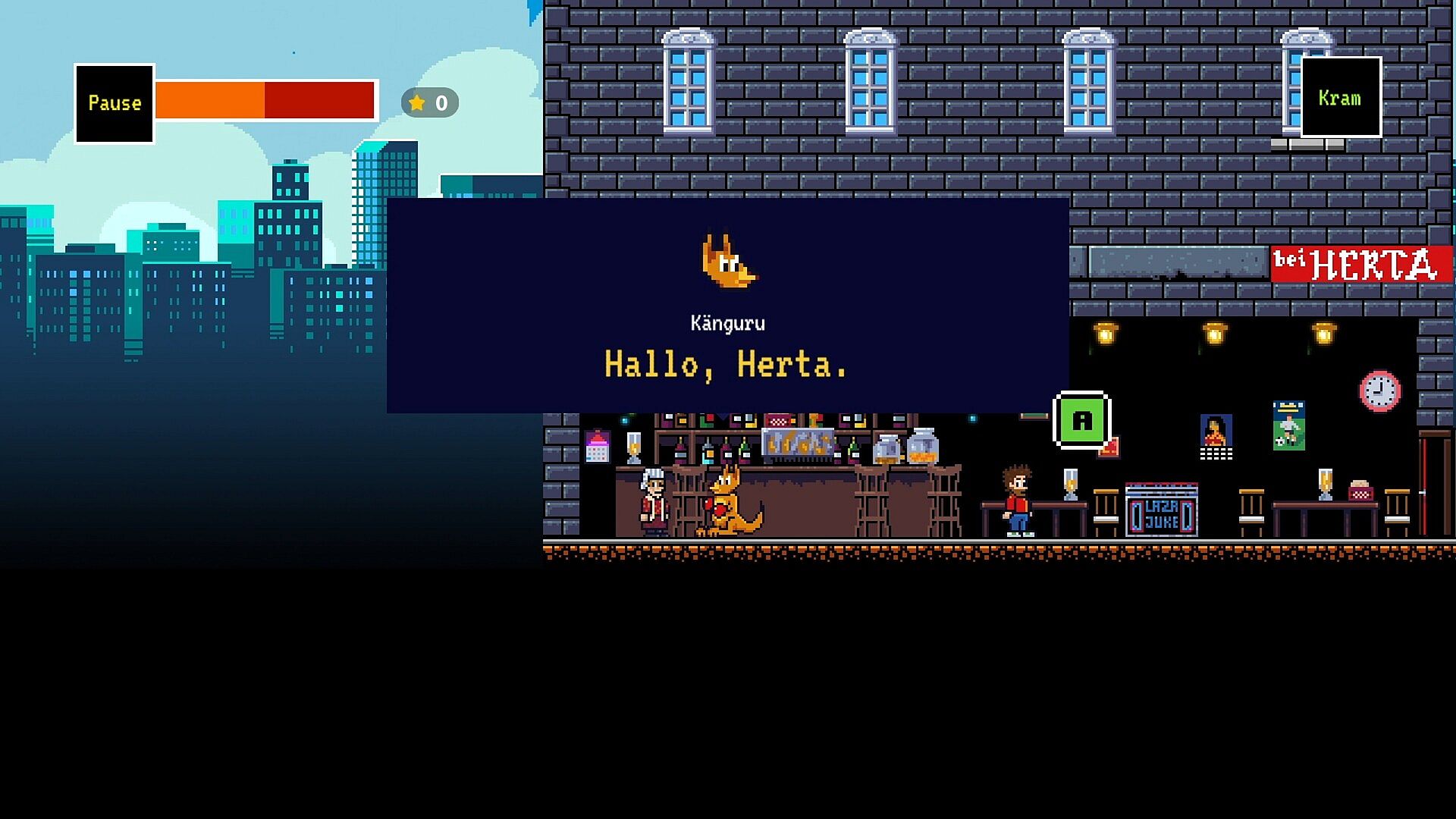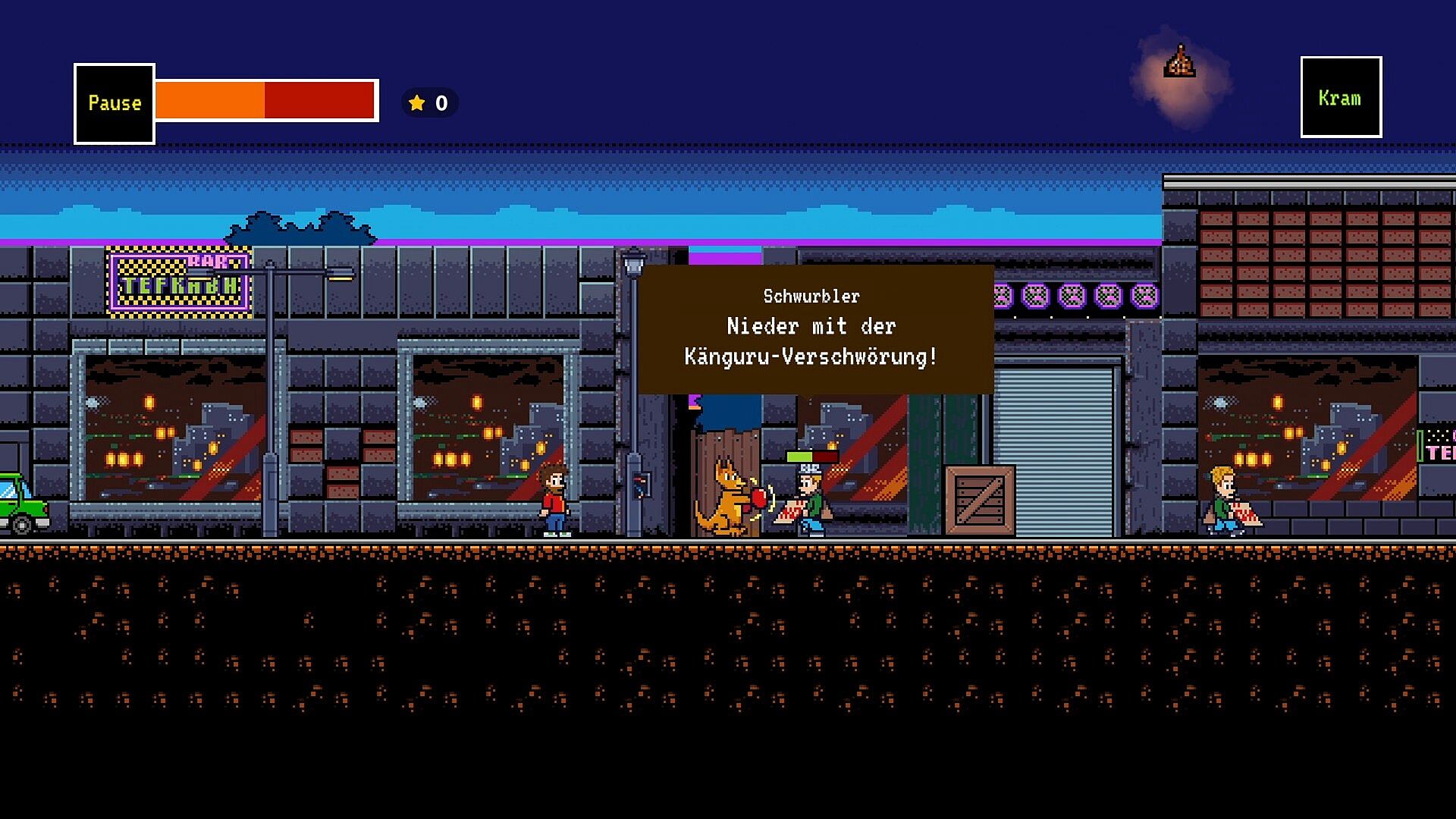 It’s a retro-inspired pixel-art jump’n’run adventure, following the surreal plot of the film: Marc-Uwe (the human) and the Kangaroo (the marsupial) get sucked into a conspiracy — and also, a computer game. That’s not a metaphor. They literally become pixel characters and must fight their way out while battling conspiracy theorists, questionable logic, and their own meta-commentary.