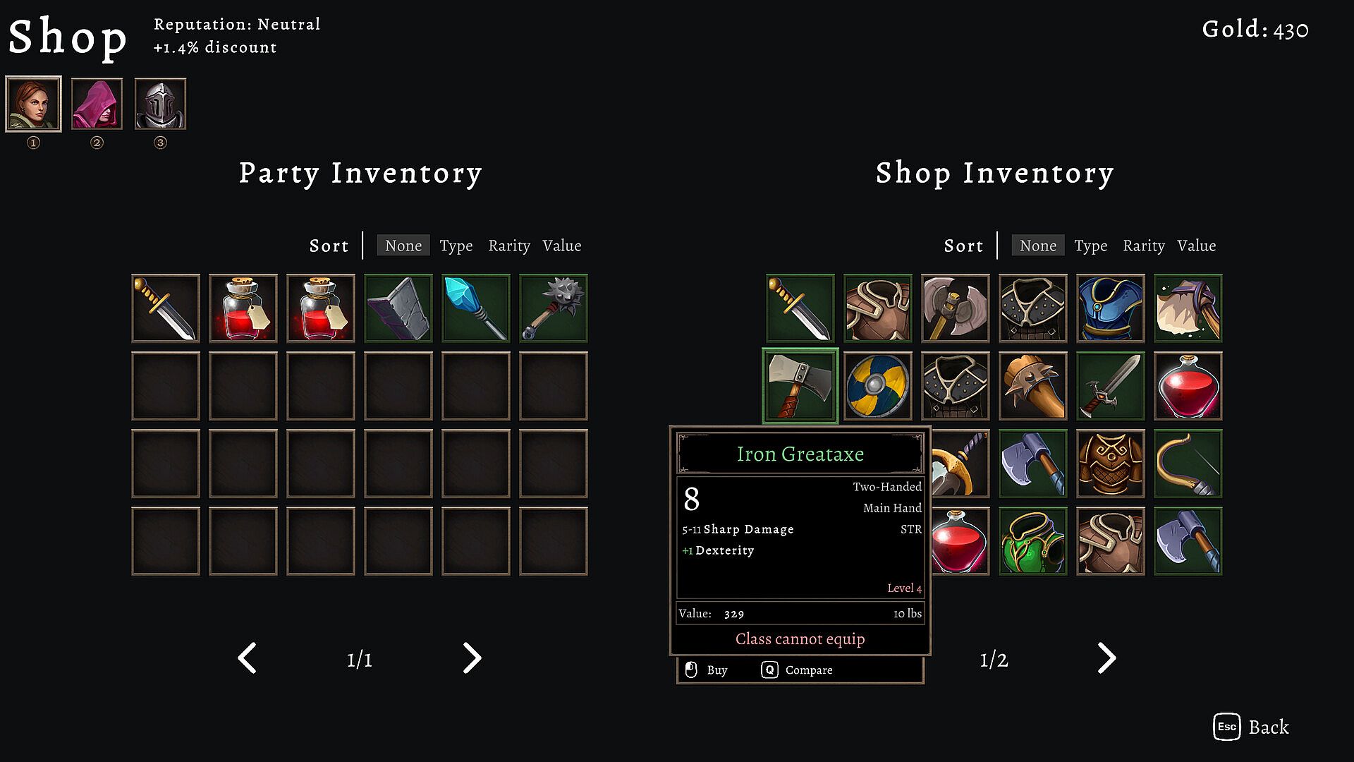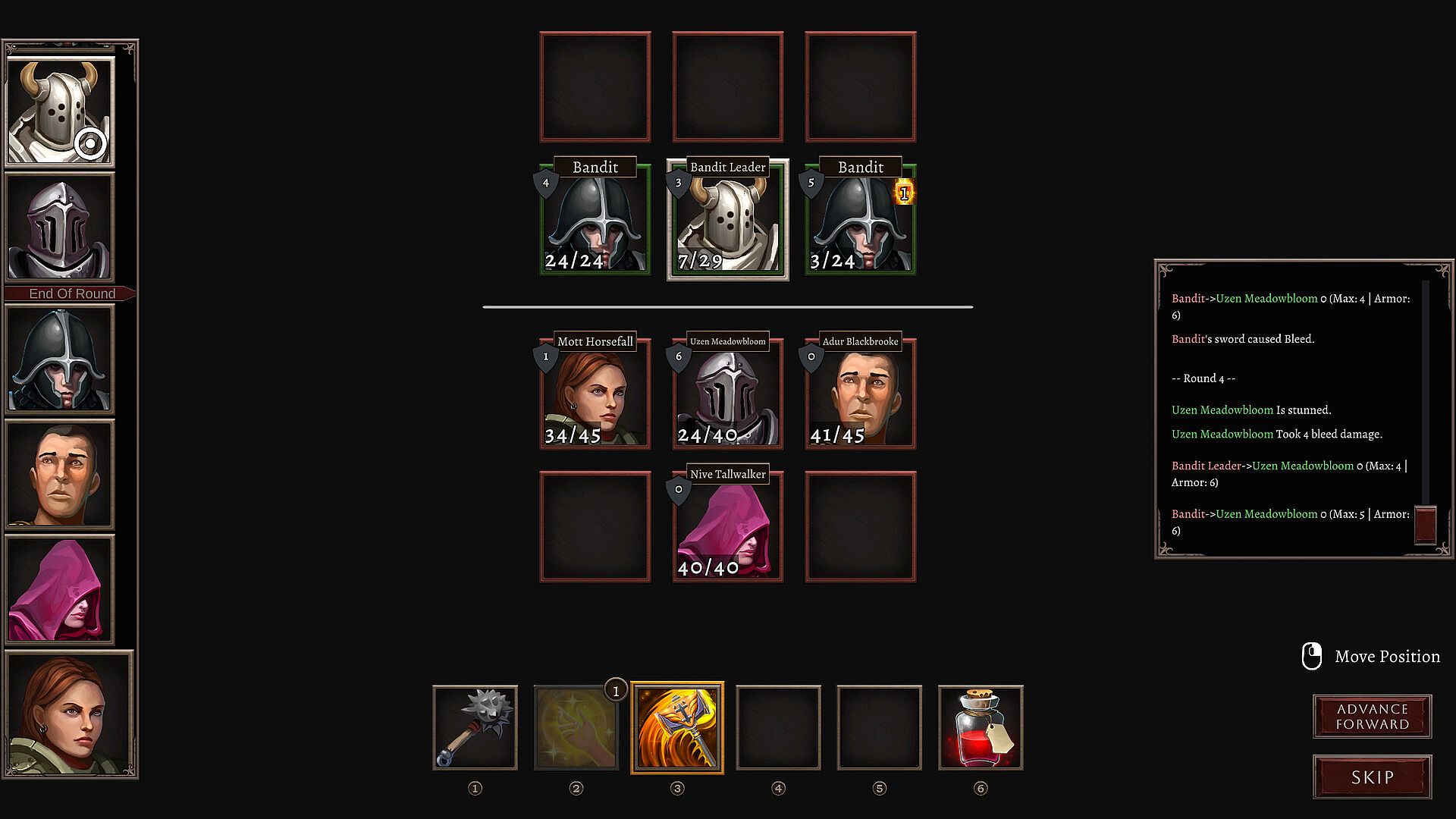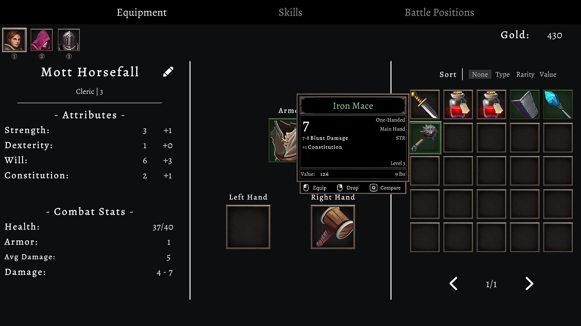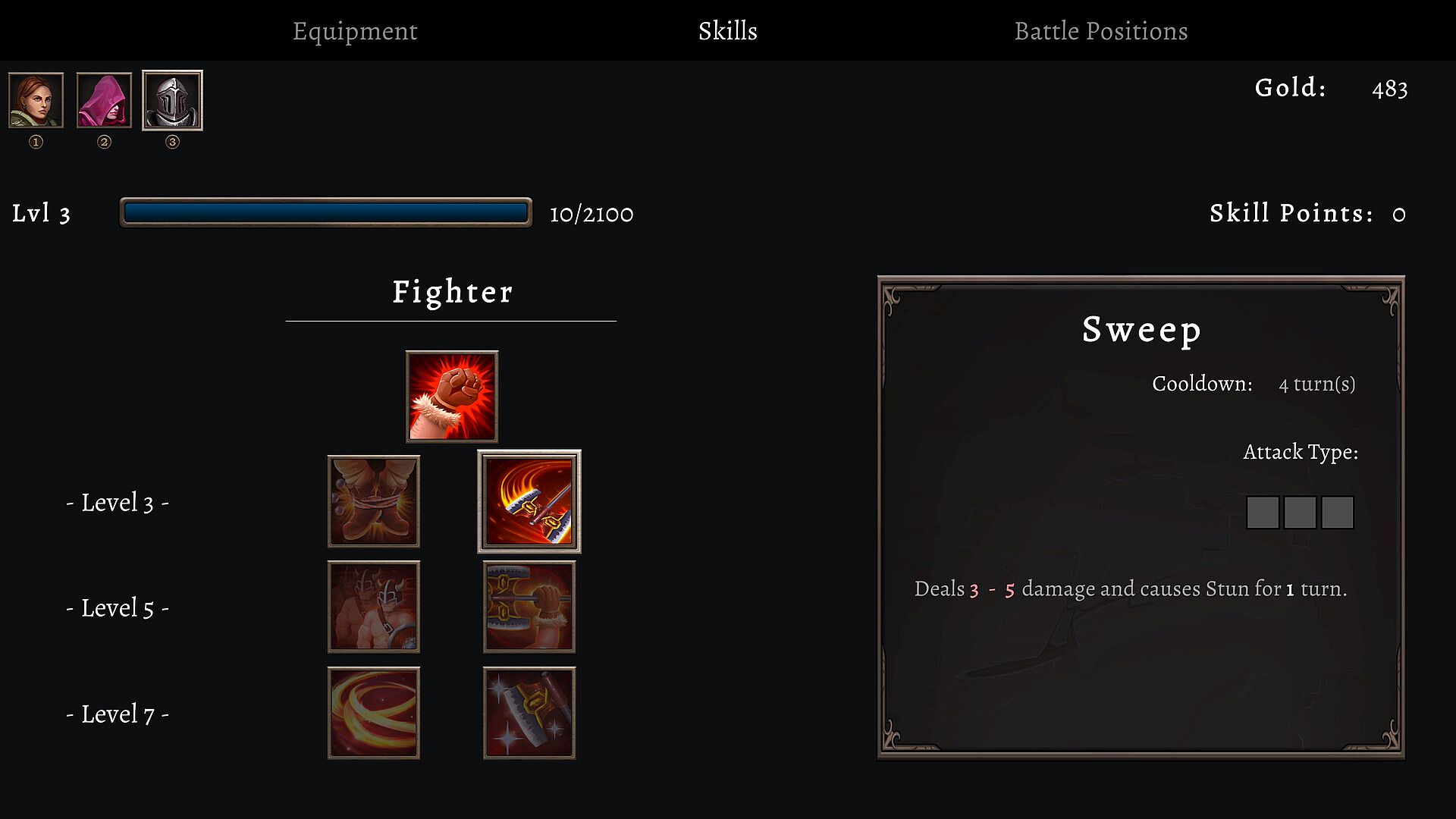 Buy gear at the store to make heroes stronger, or use loot from enemy drops. The store's items refresh every time the heroes rest so there's always something new and better to find. - Positioning plays an important role in battle