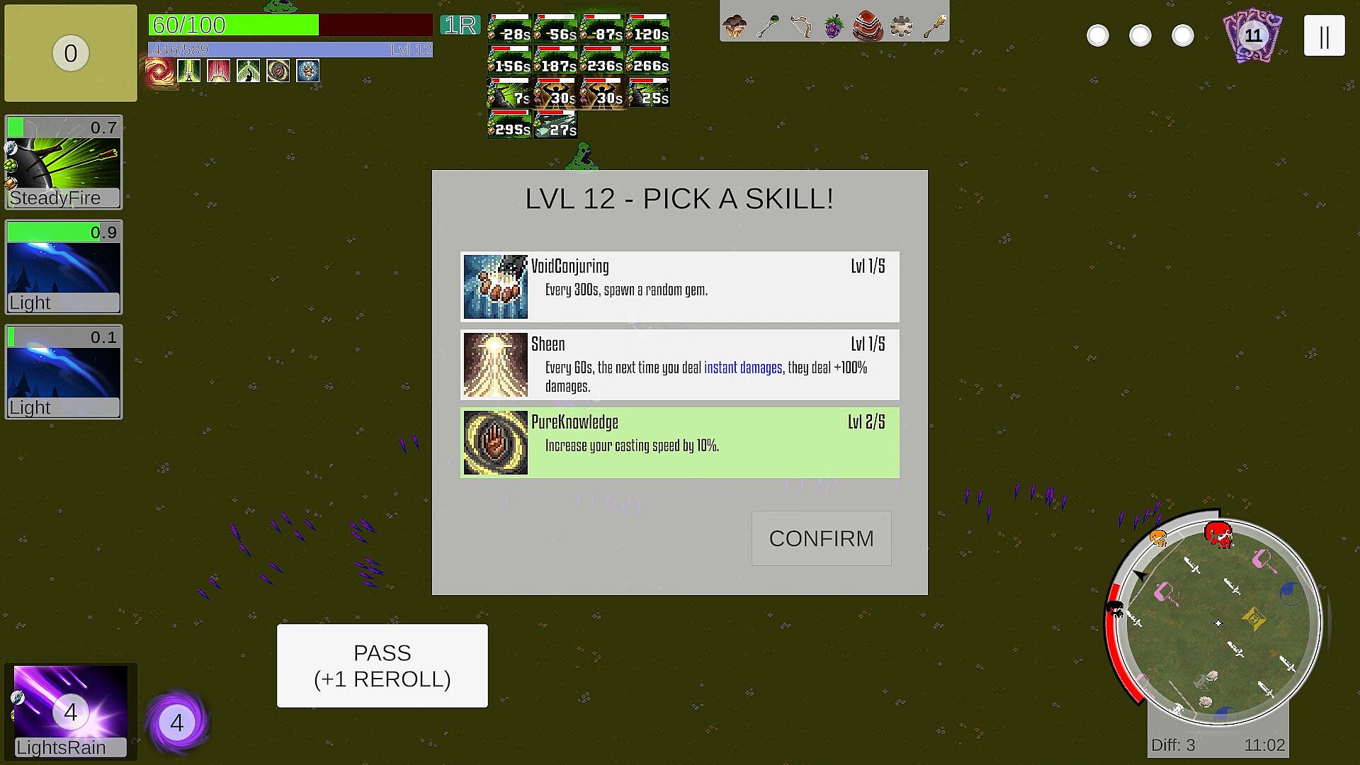 You start the game with 3 casting slots. When a slot is empty, it automatically draws a spell from your library. Each spell has its own preparation duration, that the spell must spend in a slot before it's cast for you. Meanwhile, focus on your movements and your positionning in order to deliver your most powerful attacks on the right targets.No spell on its own will carry you through the game. Building your deck, as spells are offered to you through your run, is the most important task you'll have if you want to be able to react to the various threats awaiting for you on your path. It's a tight balancing act that can lead, if successful, to game breaking builds!