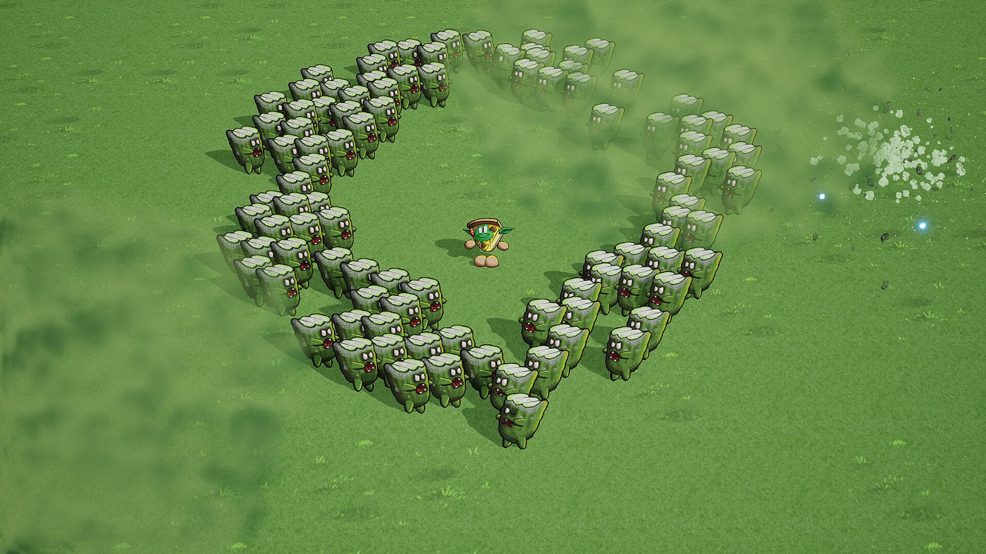 Gain power to pulverize hordes of rotten food. Play as iconic characters, referencing various pop culture universes, with their own unique skills, and complete the ultimate battle of Kichman, the last slice of quiche that can unite all powers!