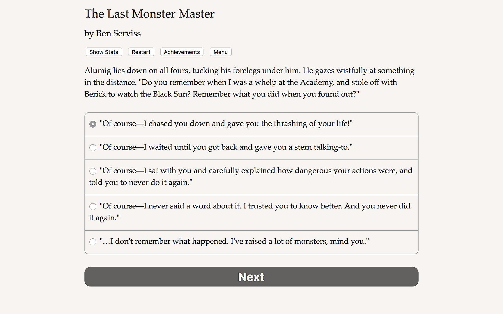 The Last Monster Master is an epic 250,000-word interactive fantasy novel by Ben Serviss, where your choices control the story. It's entirely text-based—without graphics or sound effects—and fueled by the vast, unstoppable power of your imagination.