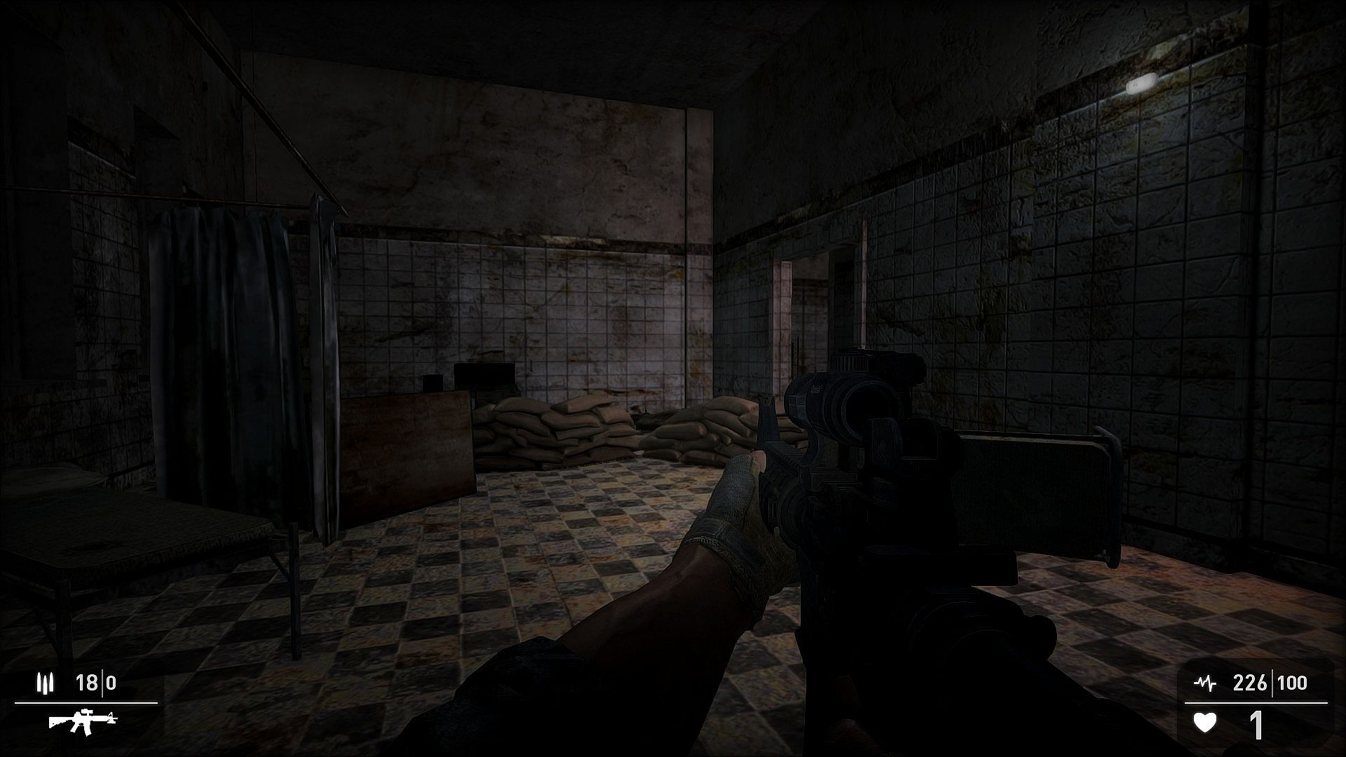 After a jobbed stress you are in the hospital. But the situation there is even worse. As a result of the spread on an unknown virus, all visitors have been turned into zombies. Doctors managed to escape and call army to eliminate the epidemic. You are the last patient, who was able to survive and not become infected. Your task is to find a way out, but it's complicated by the fact that zombies are wandering around the hospital wards, and the military perceive you as infected and are also trying to kill you. In order to survive you will have to find weapon and keys, to destroy zombies and break through the military cordon.
