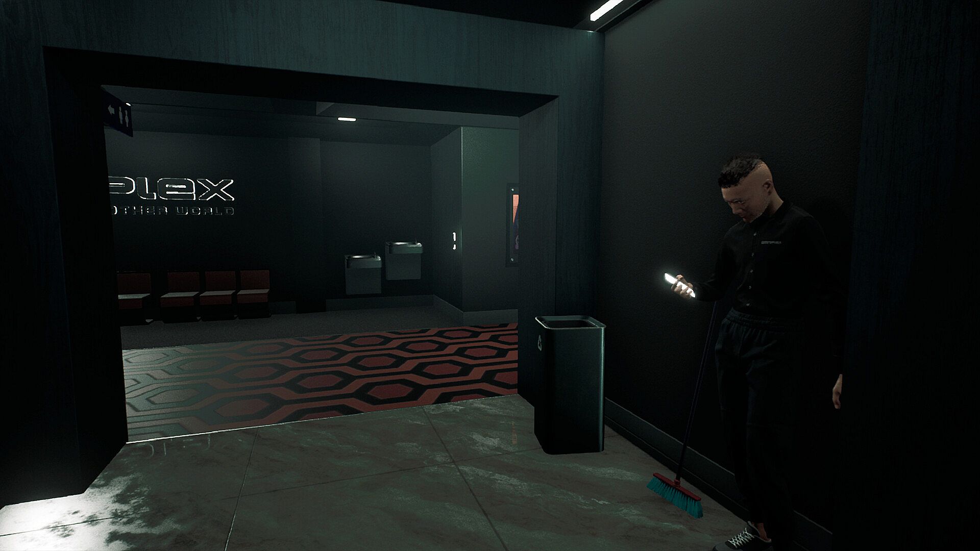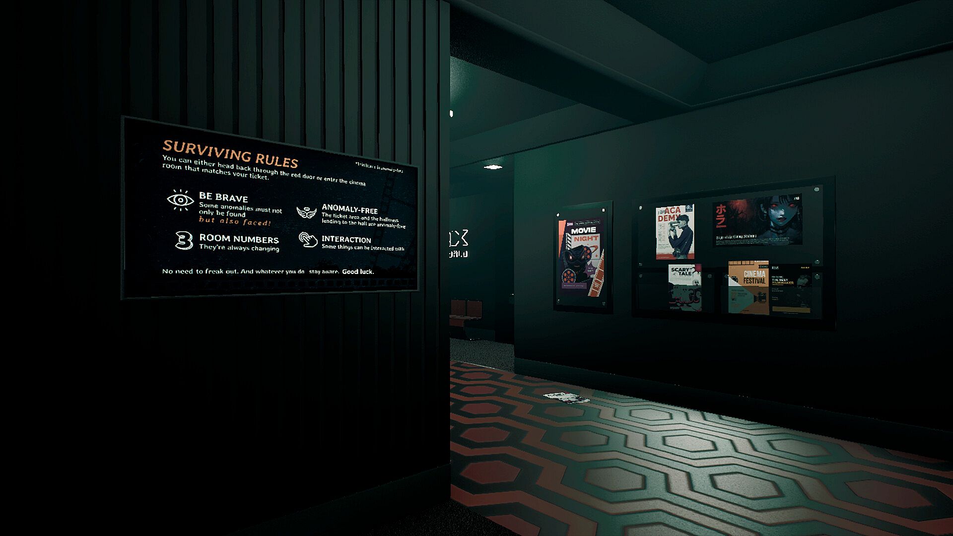 The Last Screening is inspired by find-anomalies games that present liminal spaces and psychological horror walking simulators, like 'The Exit 8', 'The Cabin Factory', 'Hospital 666', and the old goodie 'P.T.'.