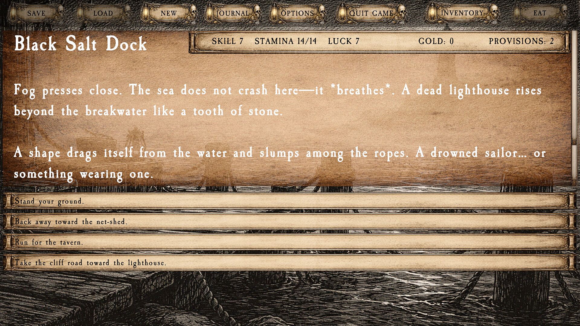 The Lighthouse of Black Salt is a dark fantasy interactive novel inspired by classic gamebooks in the style of Fighting Fantasy.
