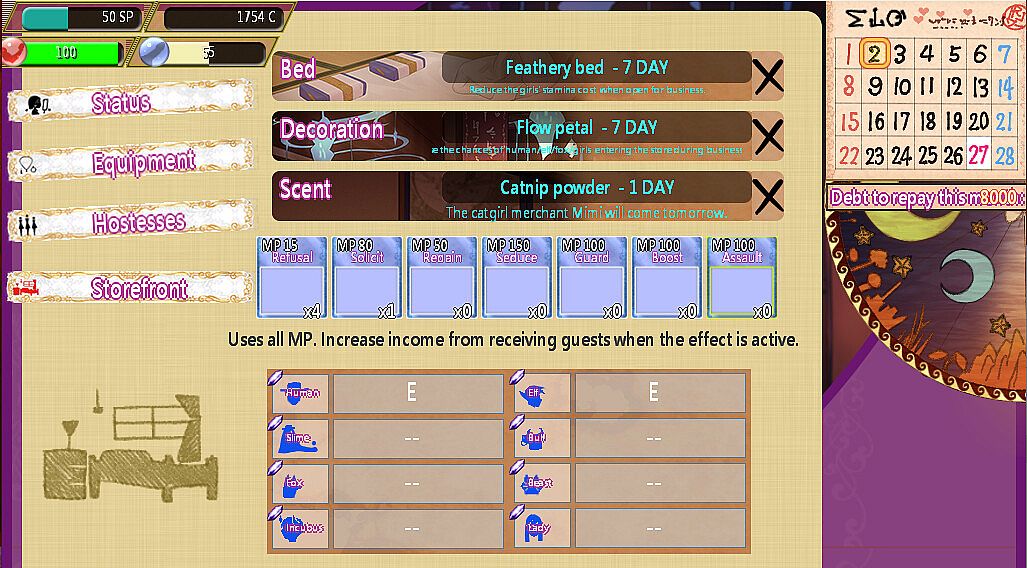 Normal mode: There is a monthly debt to be paid. The brothels are in danger of closing if the reincarnator's brothel continues to attract your customers.