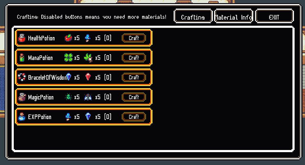 - collect crafting materials and craft rare potions and gear at the crafting shop
