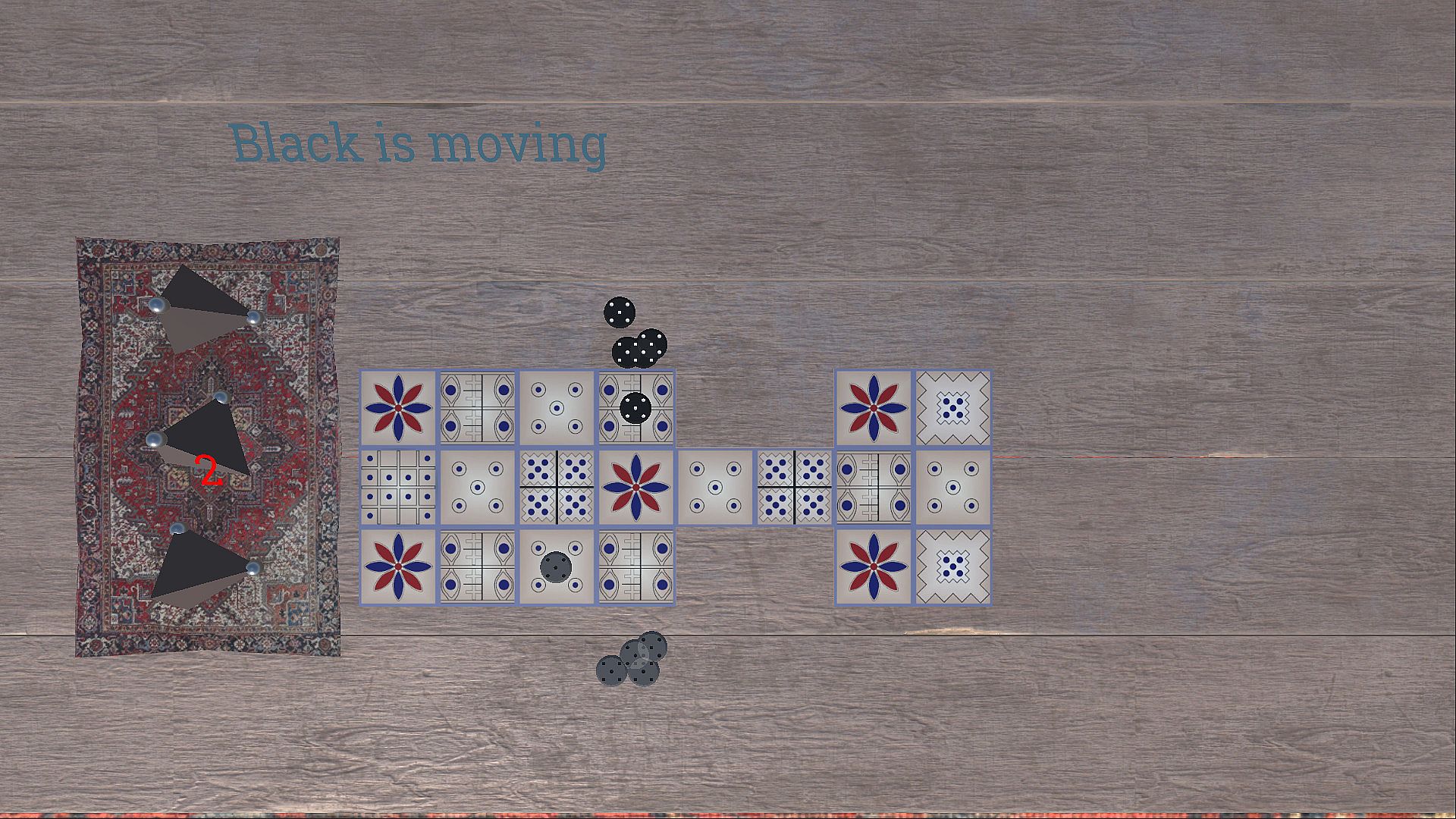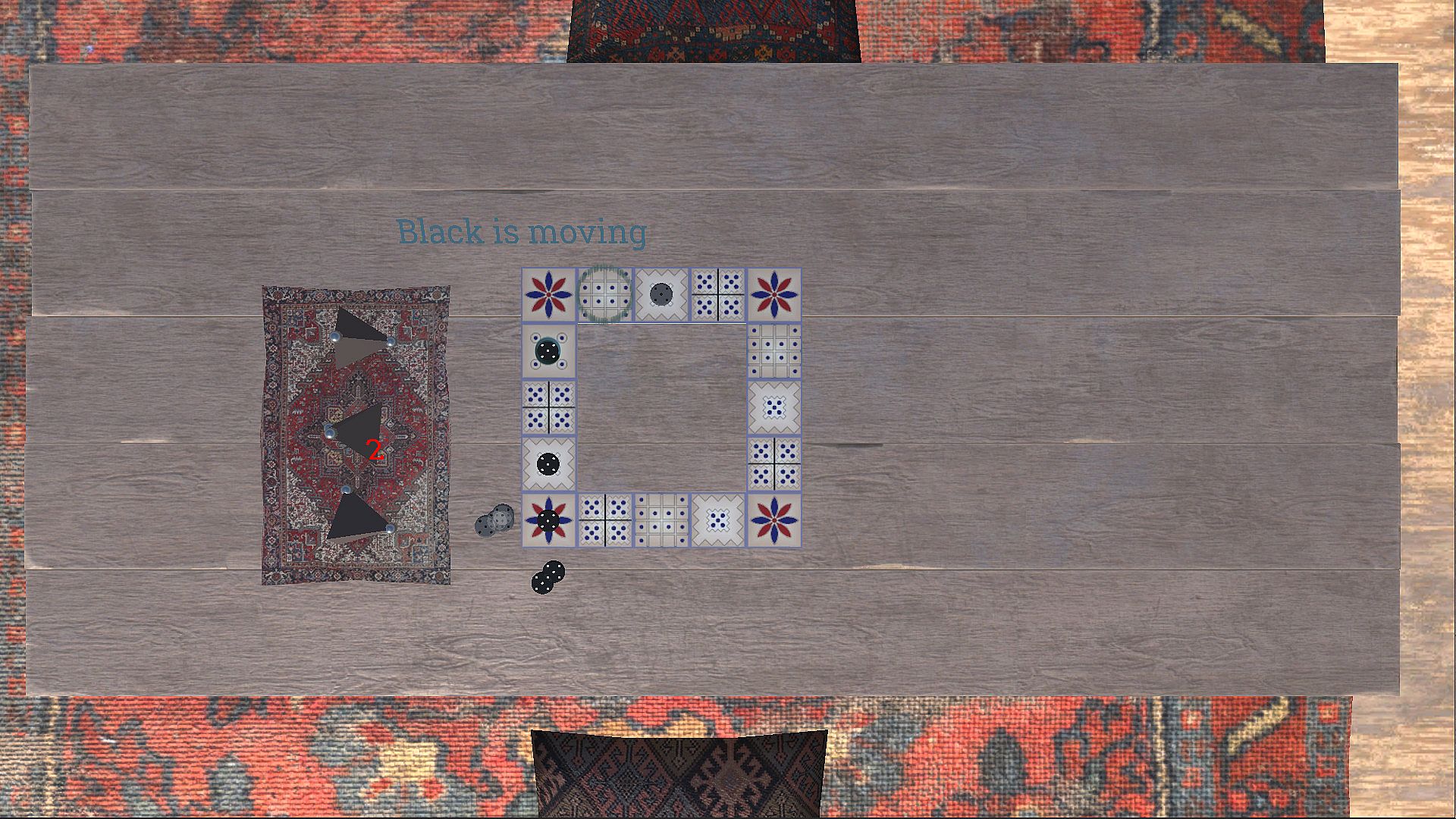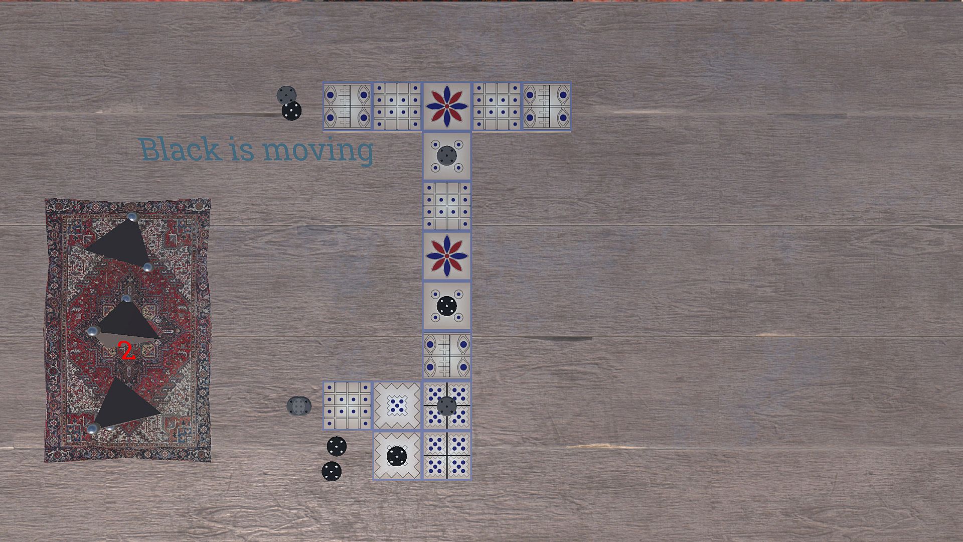 The Royal Game of Ur is not very hard to learn. Each player rolls three tetrahedra die where 2/4 points of each dice have silver markings. After rolling three dice, count the number of dice that landed with a silver marking at the top (the game does this for you) - that's the number of tiles you can move a piece. Moving where? Well, The Royal Game of Ur is really a racing game, where two players race to get all their pieces to the end of the board.