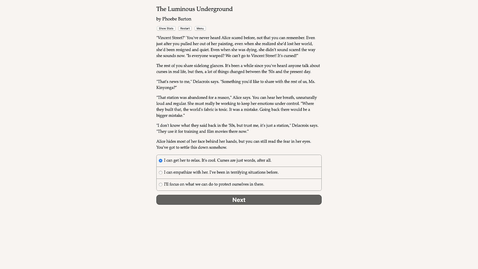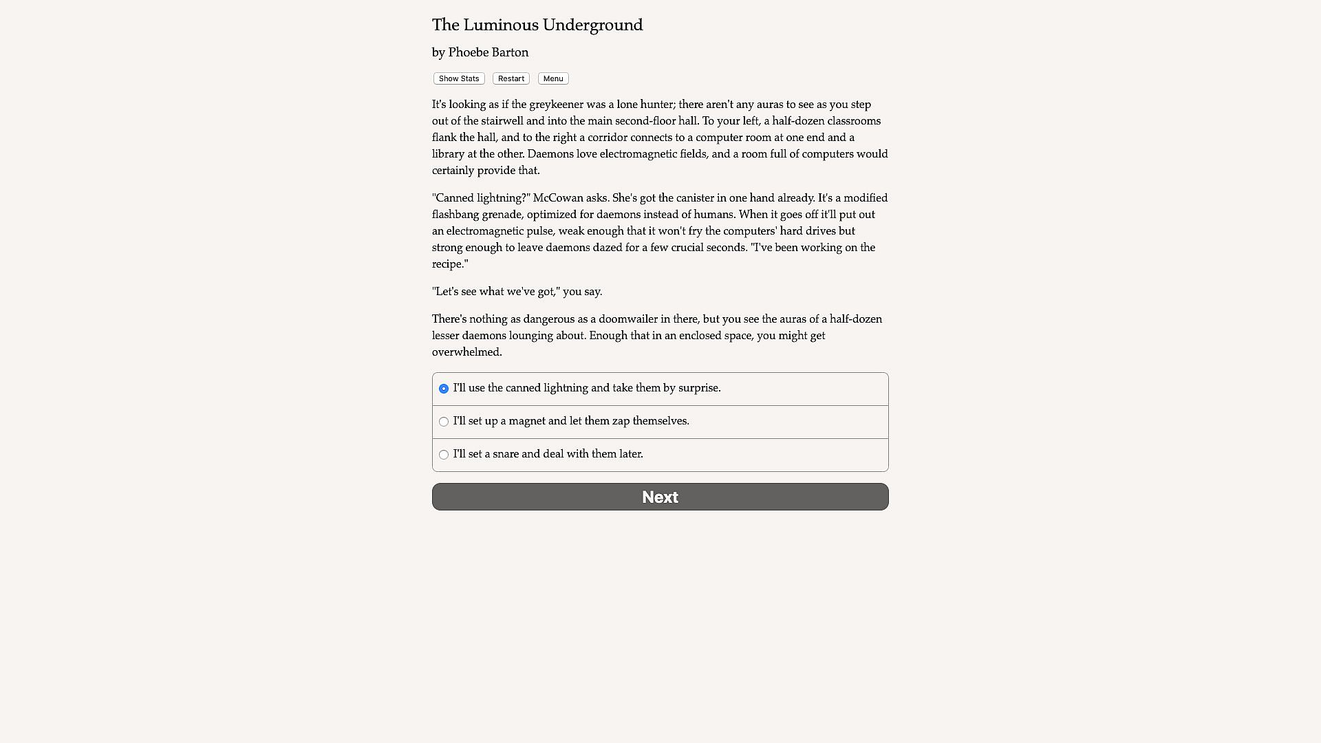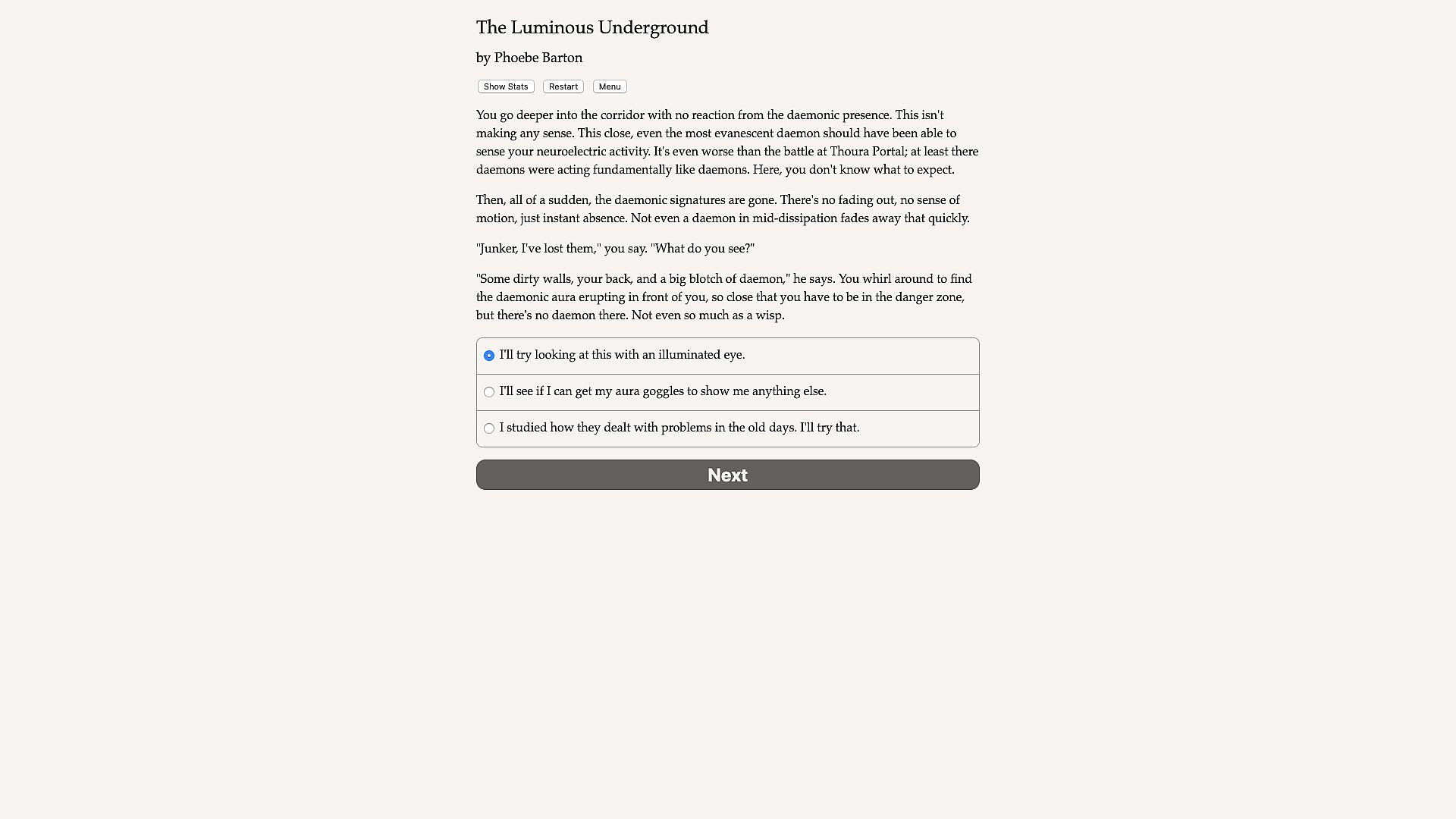 The Luminous Underground is a 660,000-word interactive secondary-world science fantasy novel by Phoebe Barton, where your choices control the story. It's entirely text-based—without graphics or sound effects—and fueled by the vast, unstoppable power of your imagination.