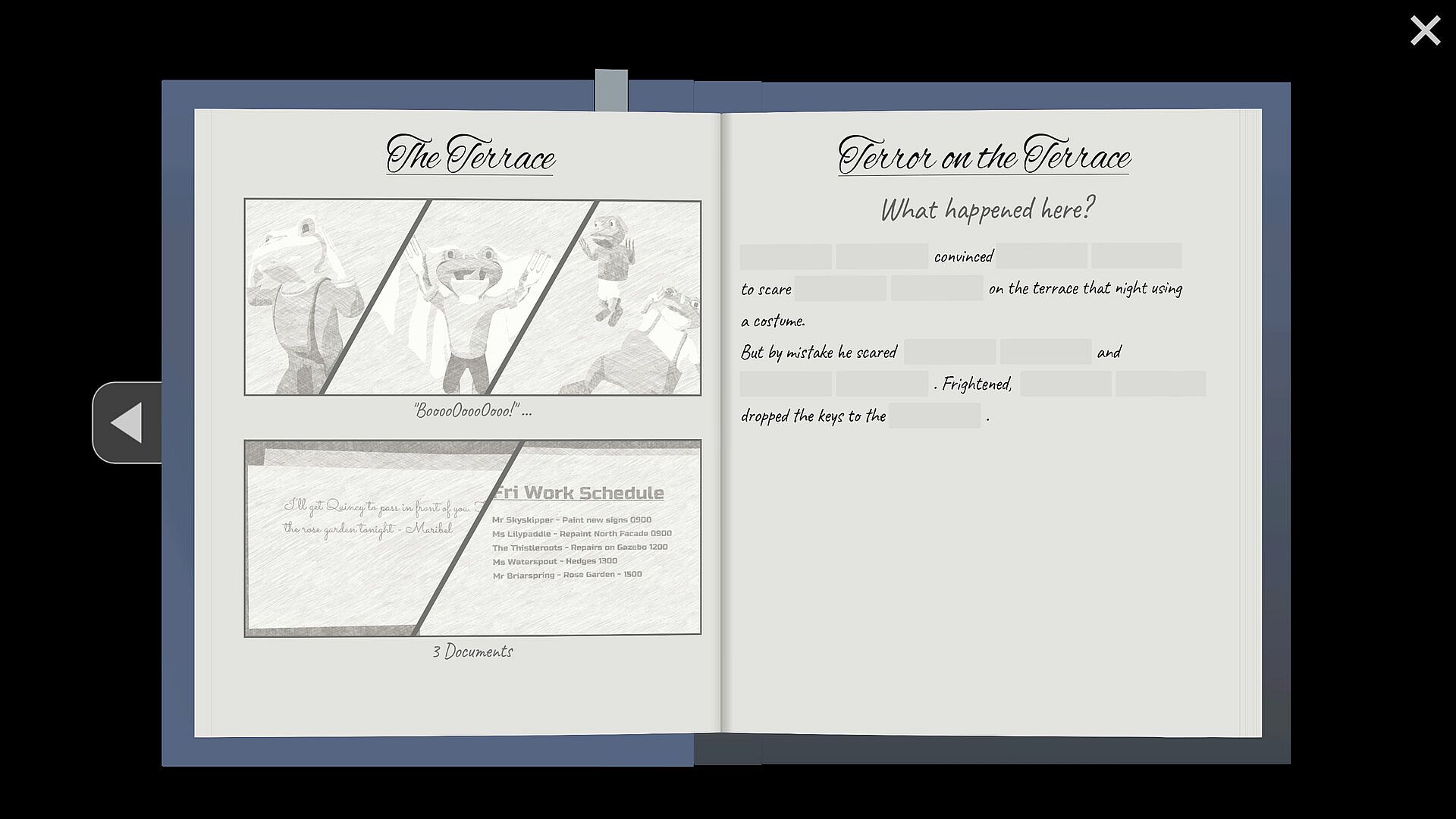 Over twenty handcrafted puzzles requiring you to fill in the blanks or decipher codes