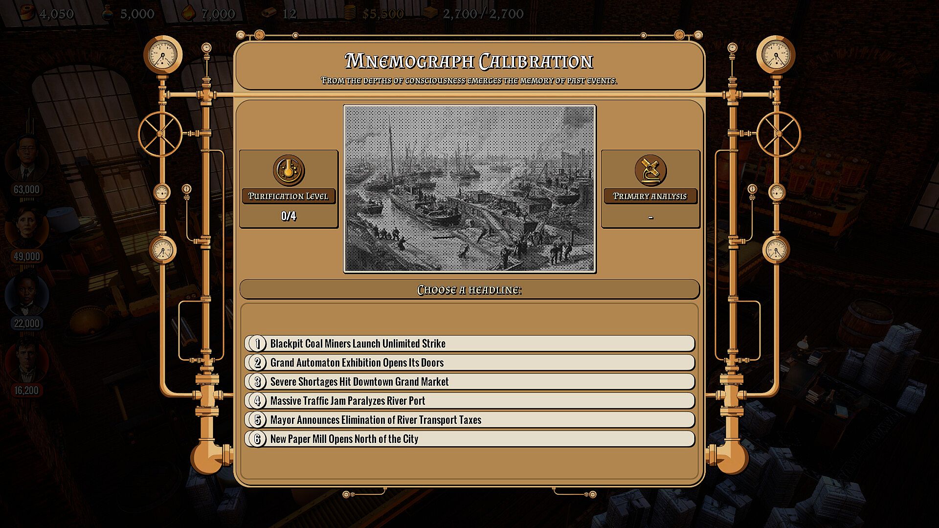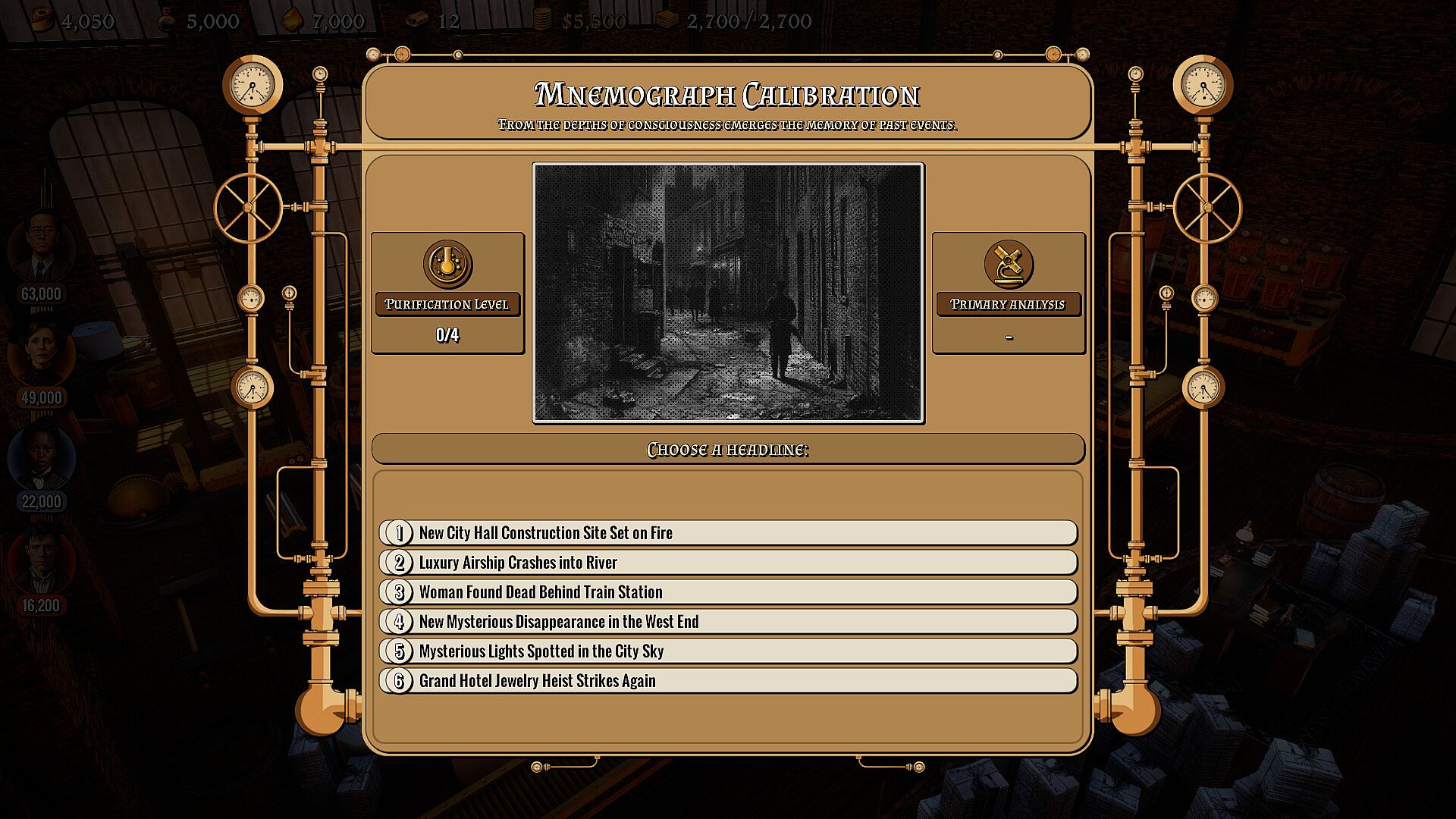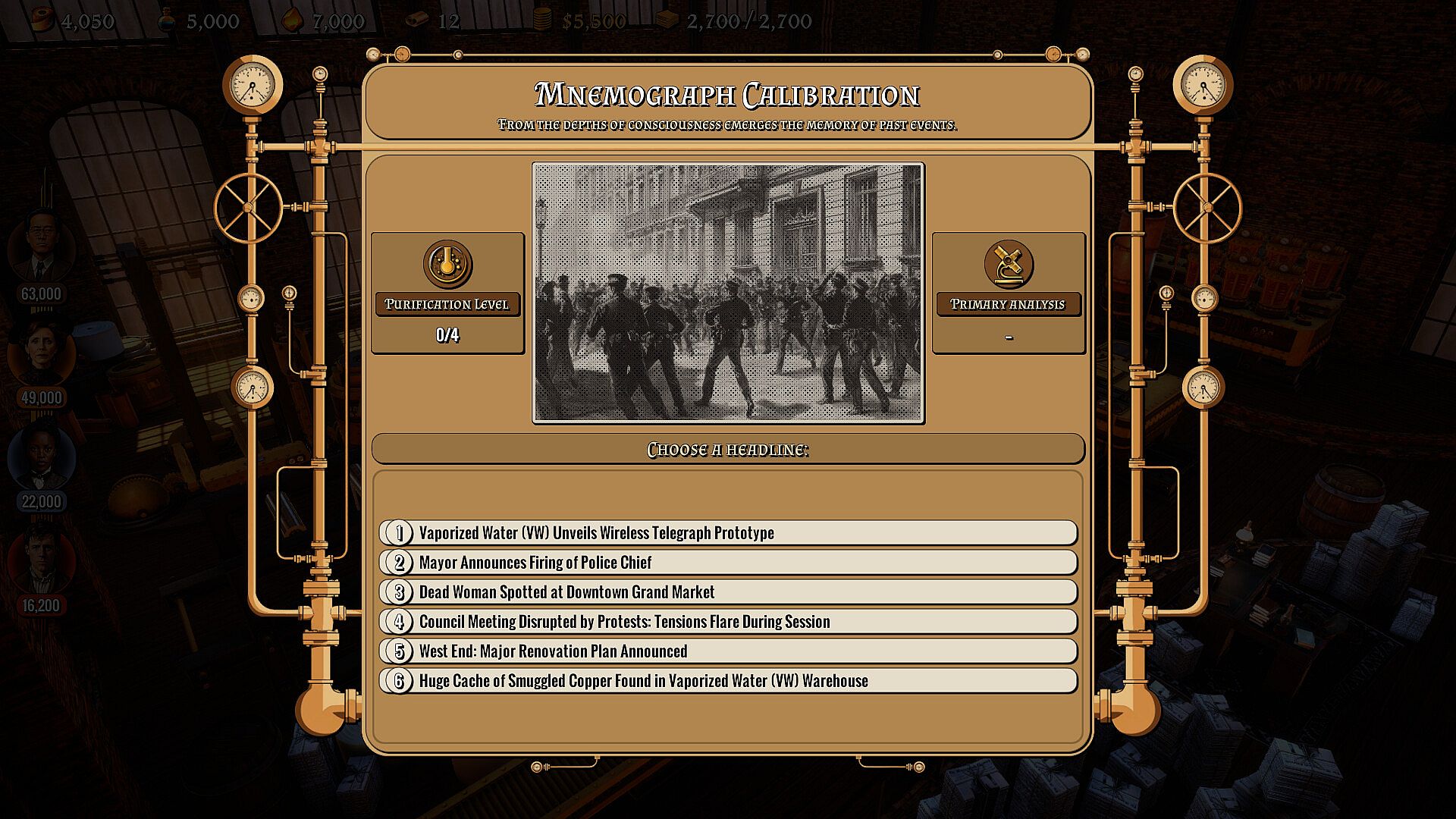 The Council has just lifted the press ban. Four newspapers compete to dominate the city, including yours. But The Mnemograph Chronicle isn’t an ordinary daily—it’s written by a machine that extracts the memories of the dead: The Mnemograph.