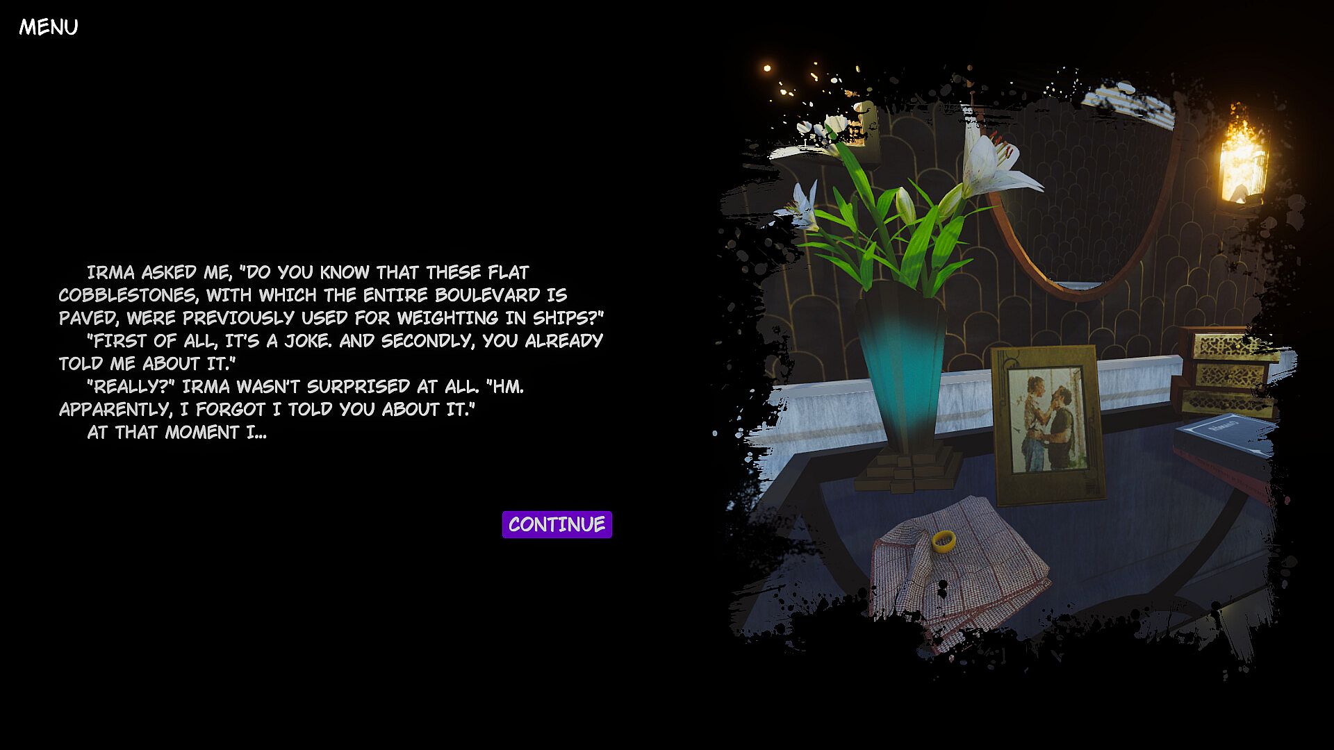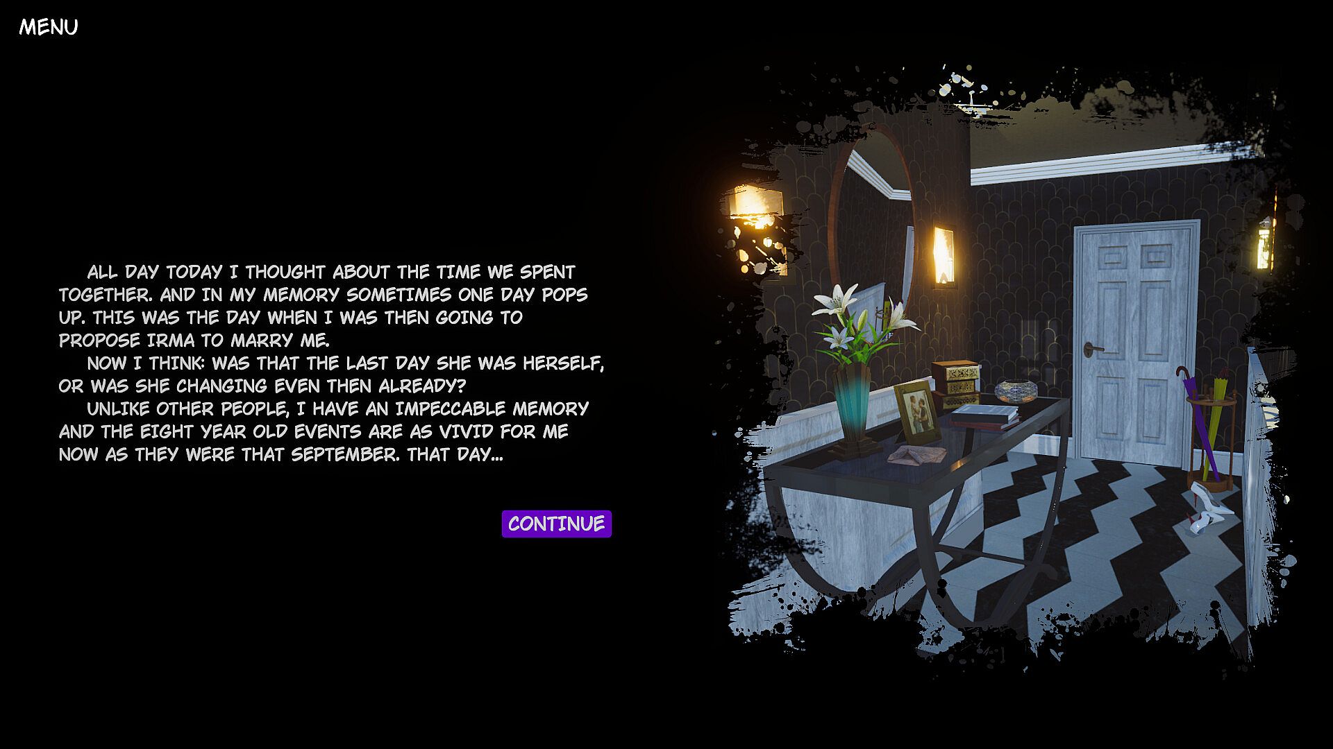 Play as an unnamed man who suspects his wife Irma of something odd, reliving memories from the day he planned to propose. Your choices shape the plot in this thriller adventure blending romance and mystery, with branching paths that hinge on prior decisions and luck. Read text, select options with your mouse, and watch 3D scenes unfold alongside the story-no saves or rewinds allowed. The game runs 40 to 70 minutes, packing 80-90 pages of dialogue, varied responses, and three luck-based mini-games. Choices matter without rewarding only "positive" picks, leading to surprising endings. It suits players ready for one focused evening of interactive narrative on PC.