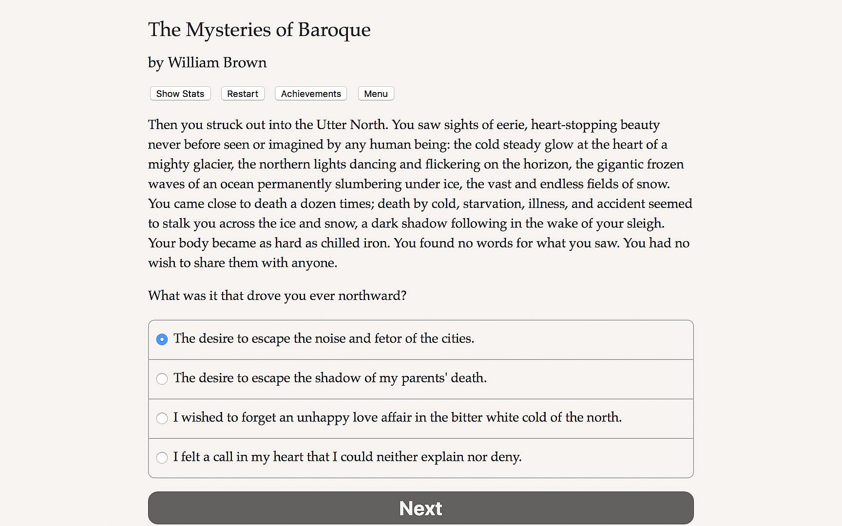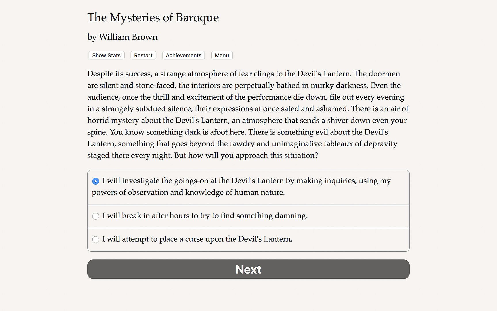 The Mysteries of Baroque is a 200,000-word interactive Gothic horror novel by William Brown, where your choices control the story. It's entirely text-based—without graphics or sound effects—and fueled by the vast, unstoppable power of your imagination.