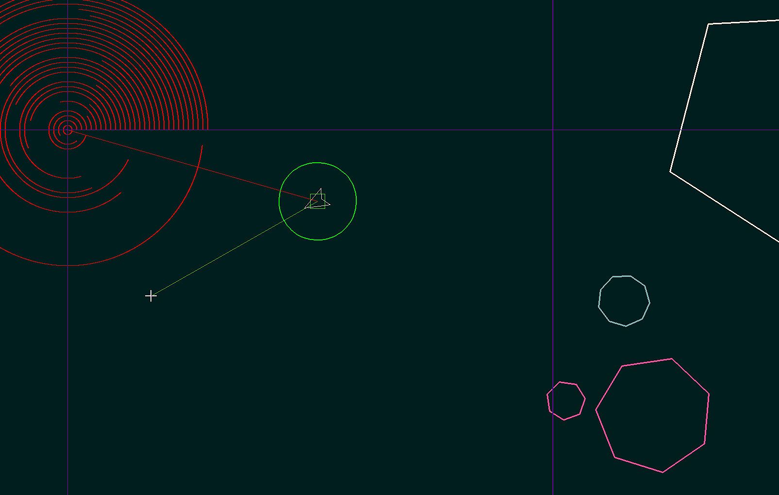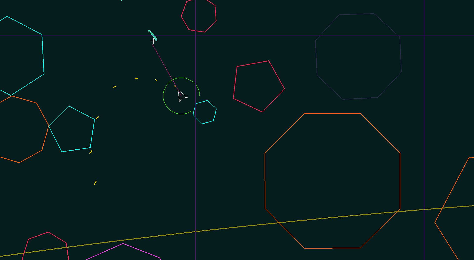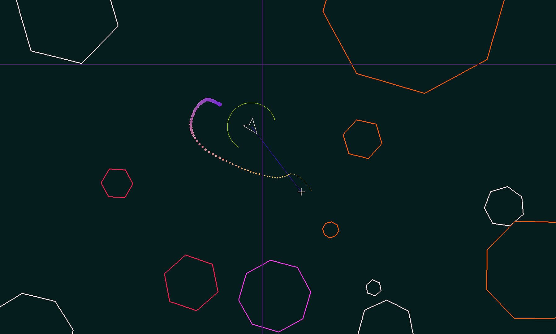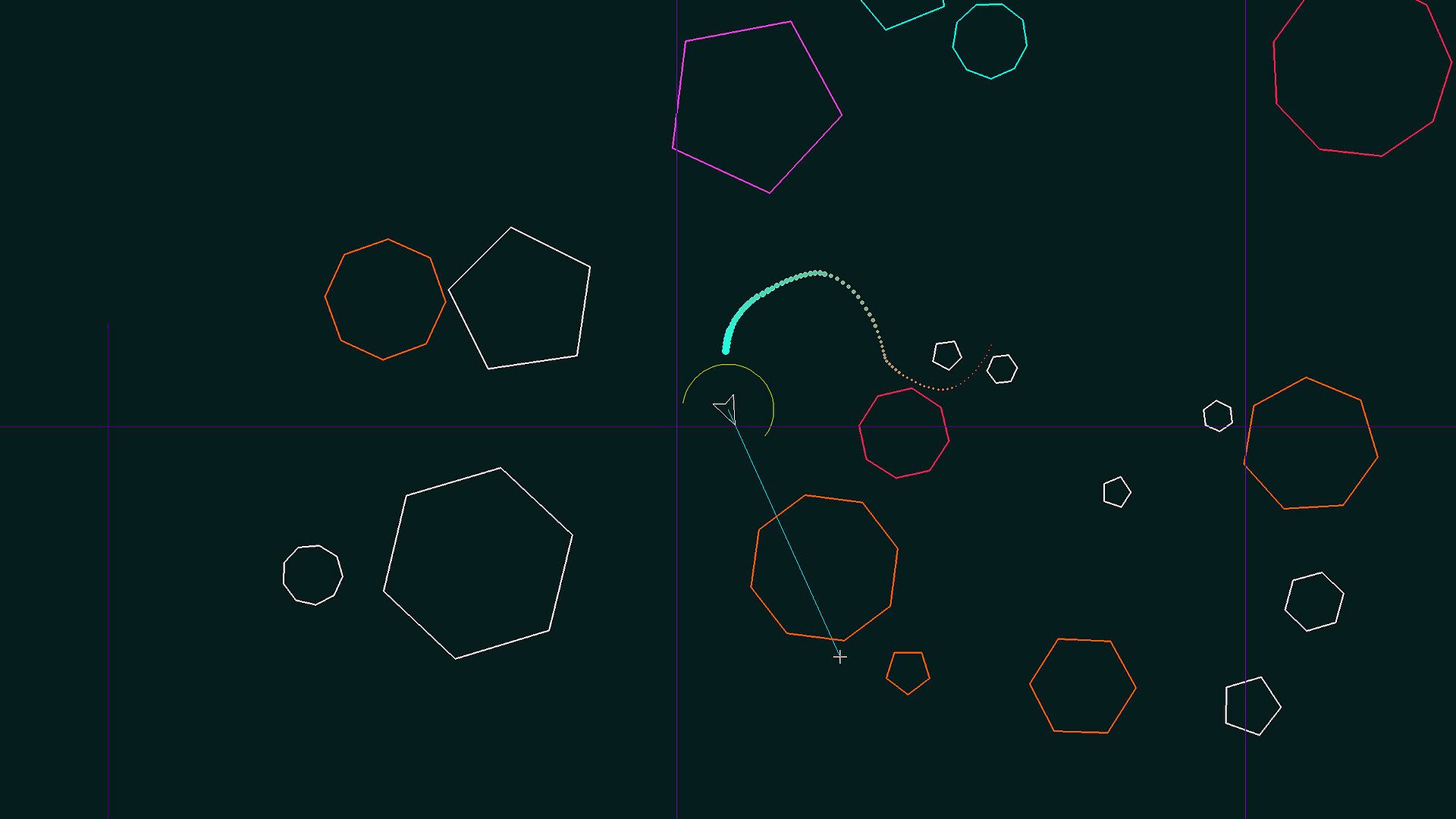 You start off in a quite empty two dimensional plane of space, you can move around any direction your facing. Then suddenly you are quite likely to encounter some polygon asteroids, make sure to not bump into these.