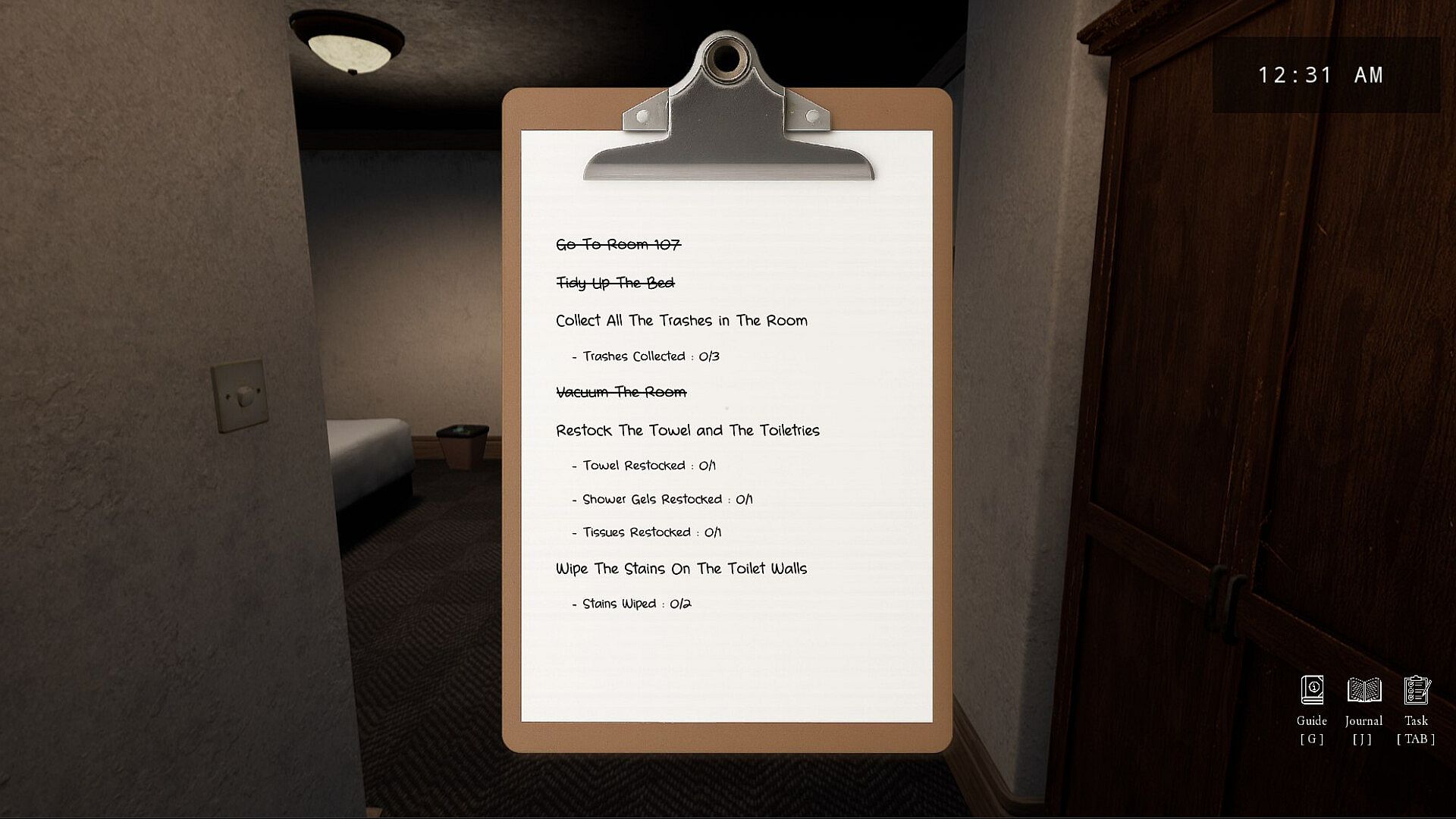 Move your housekeeping cart from room to room, and clean the rooms assigned to you. Different tools on the cart help you handle tasks, fix issues, and deal with certain entities. Stay focused.