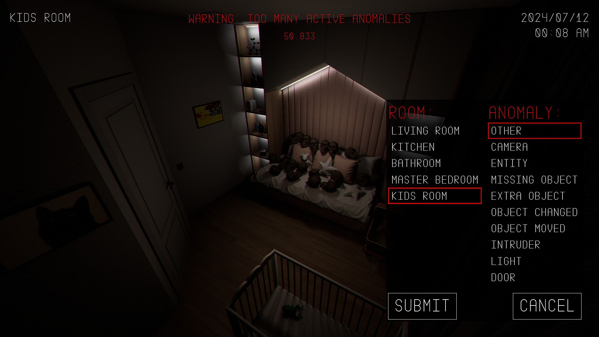 Work across four distinct levels, each with its own atmosphere and anomaly patterns. Reports are made by selecting the affected room and anomaly type from the menu - accuracy is key to maintaining containment. Every shift is different. Anomalies are randomized, requiring constant attention and sharp memory. Too many active disturbances at once, and containment systems will fail. Stay calm, stay focused, and don’t let the unknown overwhelm you.