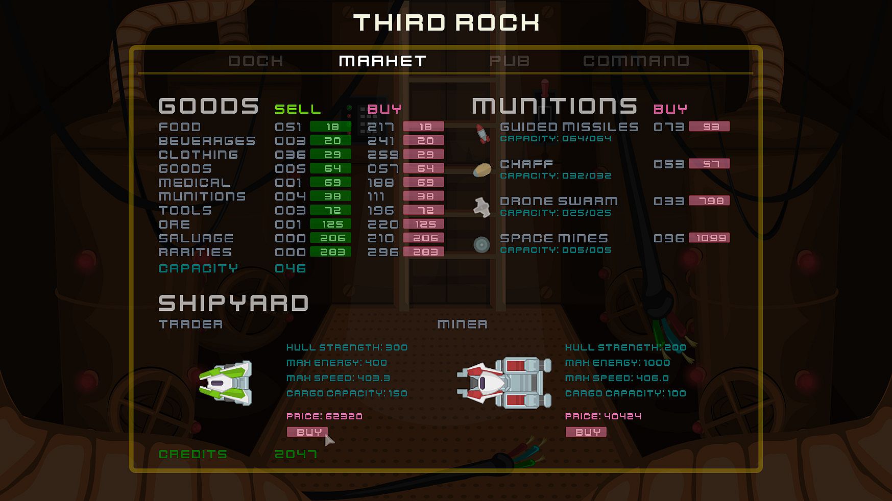 - Each playthrough is different - Missions, goods, and ships are randomly generated for each game.