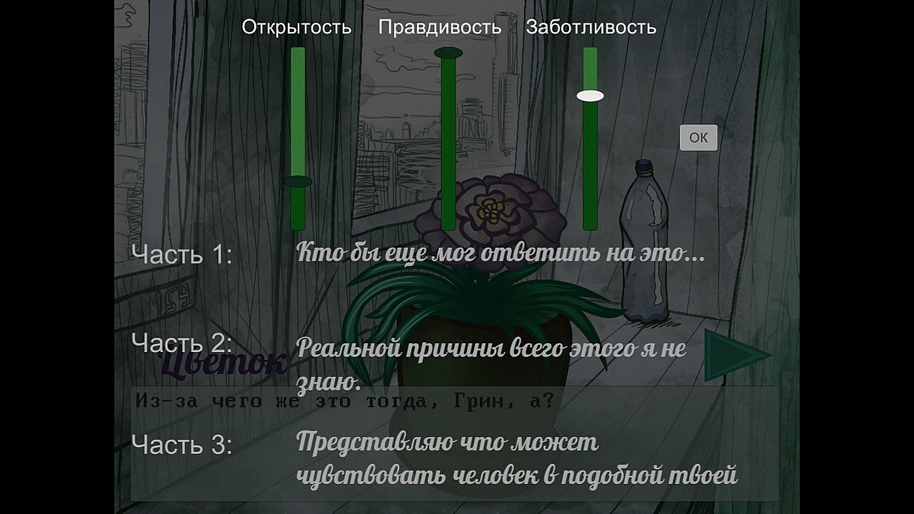 Интерактивная история про ученого, с которым заговорило его подопытное растение. Вы находитесь в комнате одного из многоэтажных домов. Общайтесь с цветком, заботьтесь о нём и делайте выбор в определенные моменты игры.