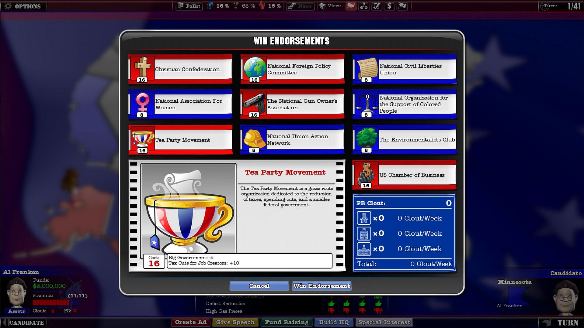 - Travel around the United States in your bid to win electoral votes.