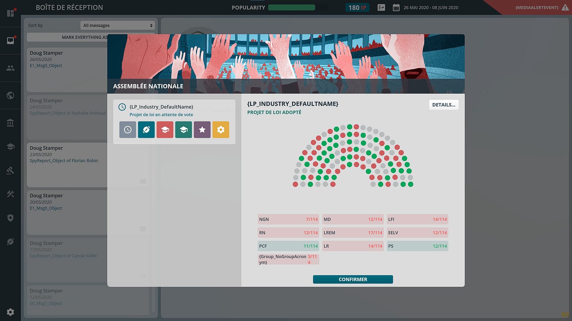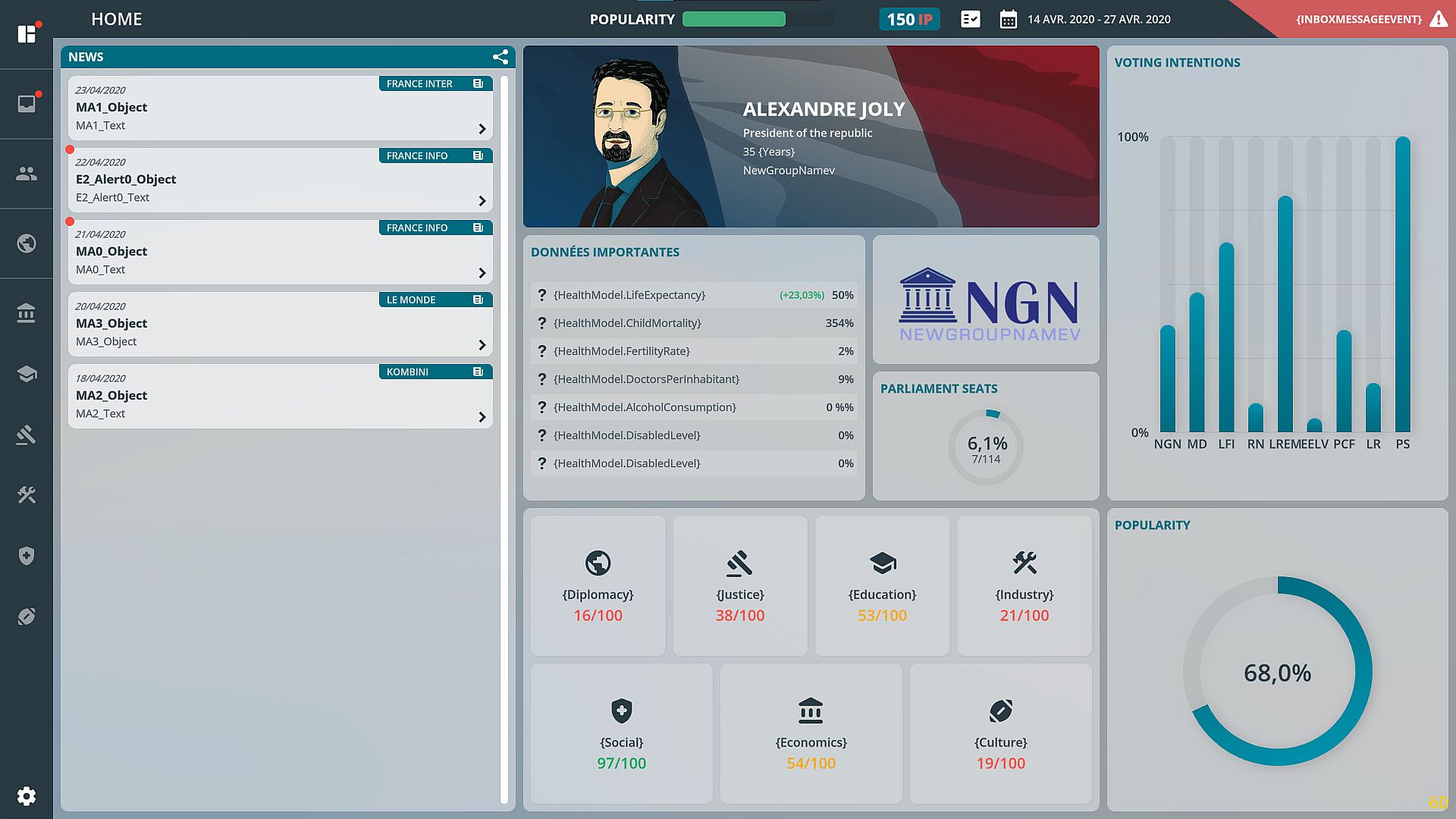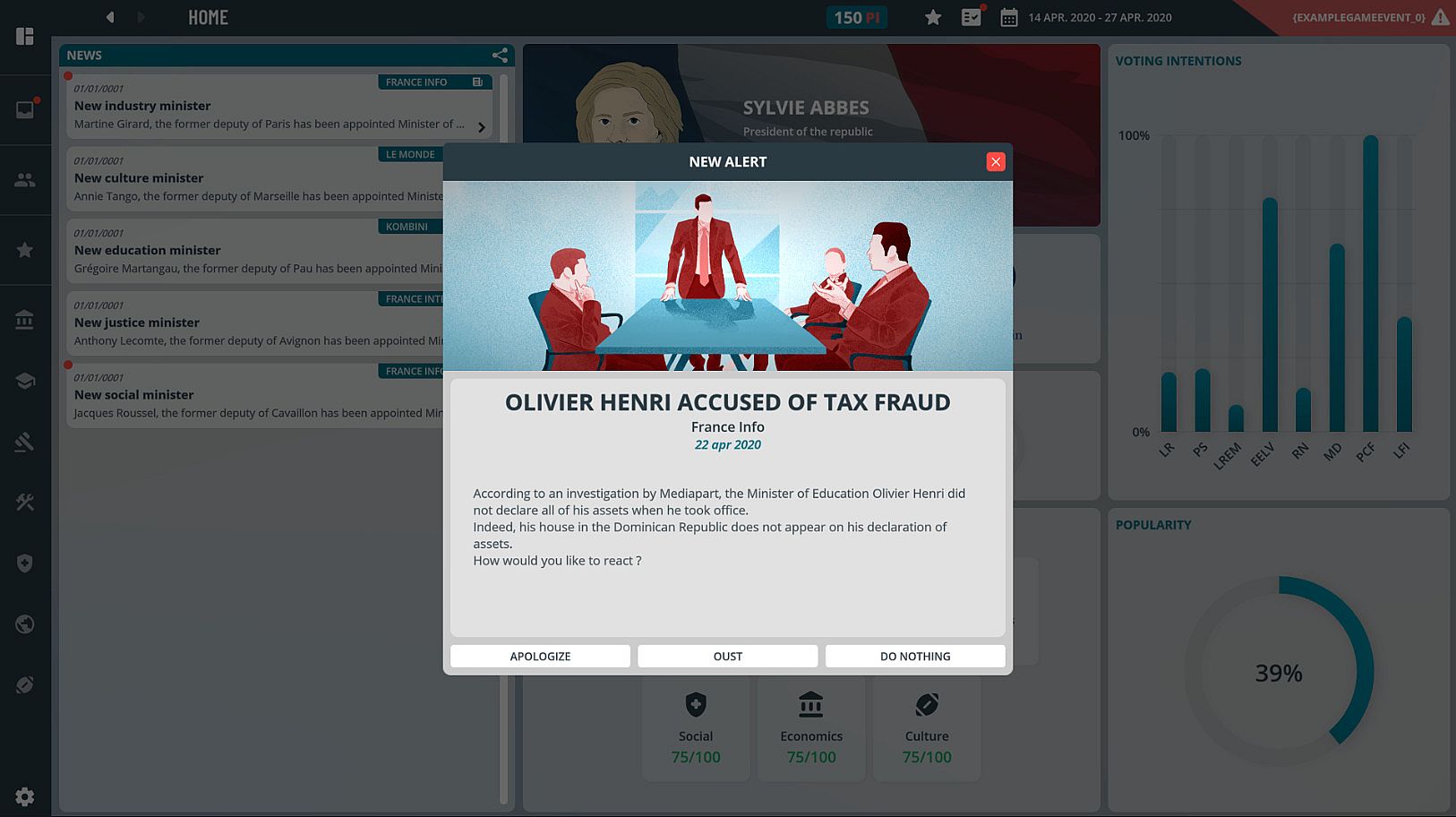 While the democratic process is not accurately portrayed, most of its components are retained, including the voting system. The interactions within political life are, however, fantasized. Scandals, often inspired by real political affairs, are a regular feature of the news. At each round, events have a probability of occurring. They can be random or linked to the player's previous actions. These events confront the player with a problem to which he must respond from among the multiple choices offered to him.