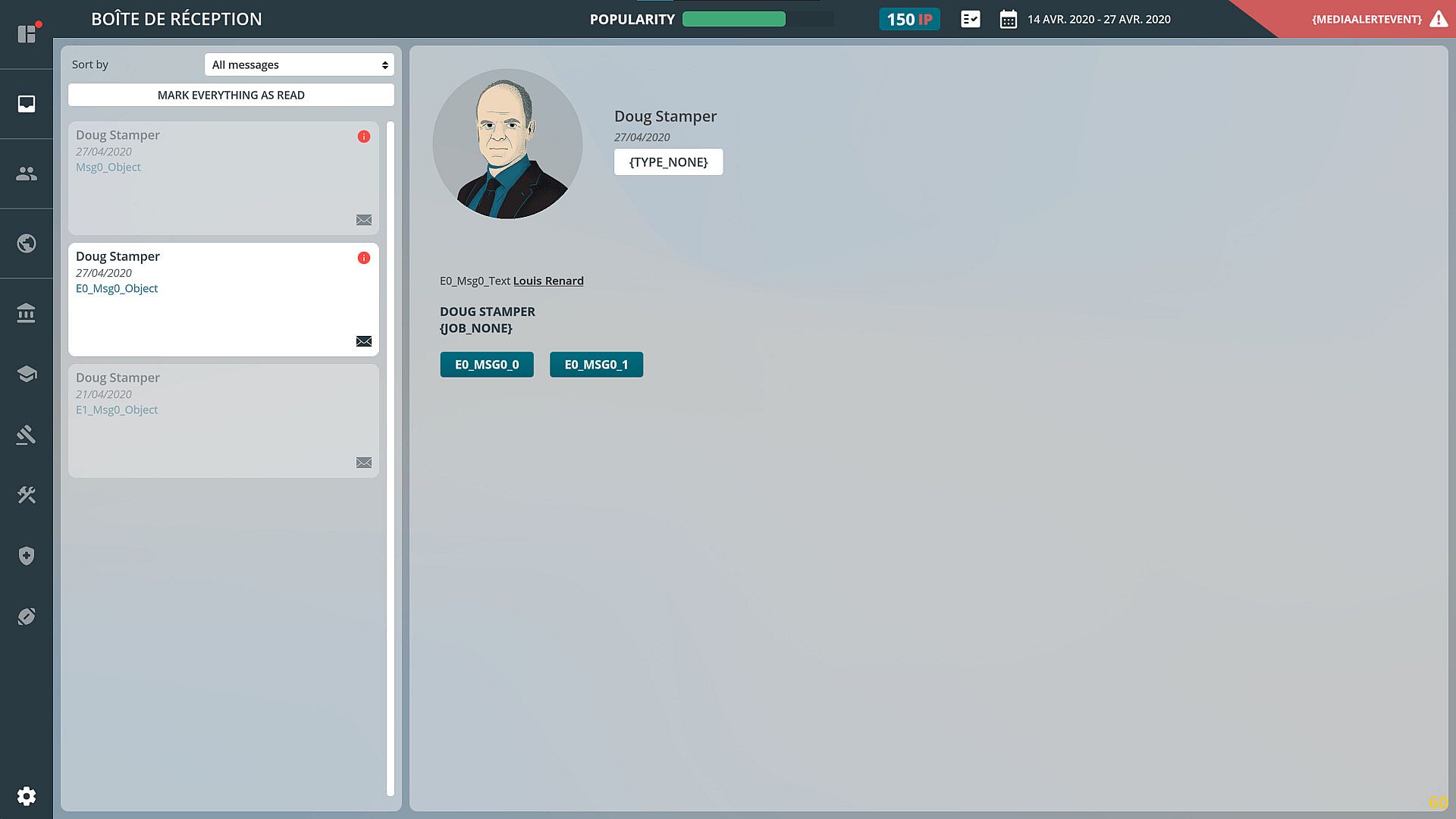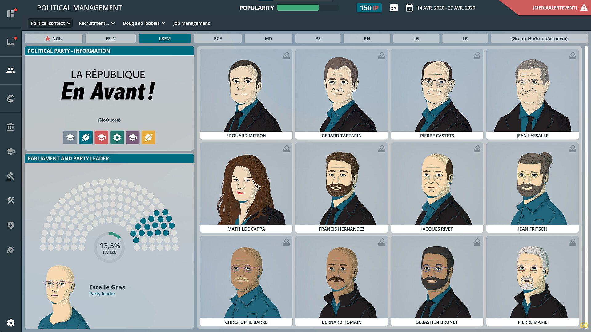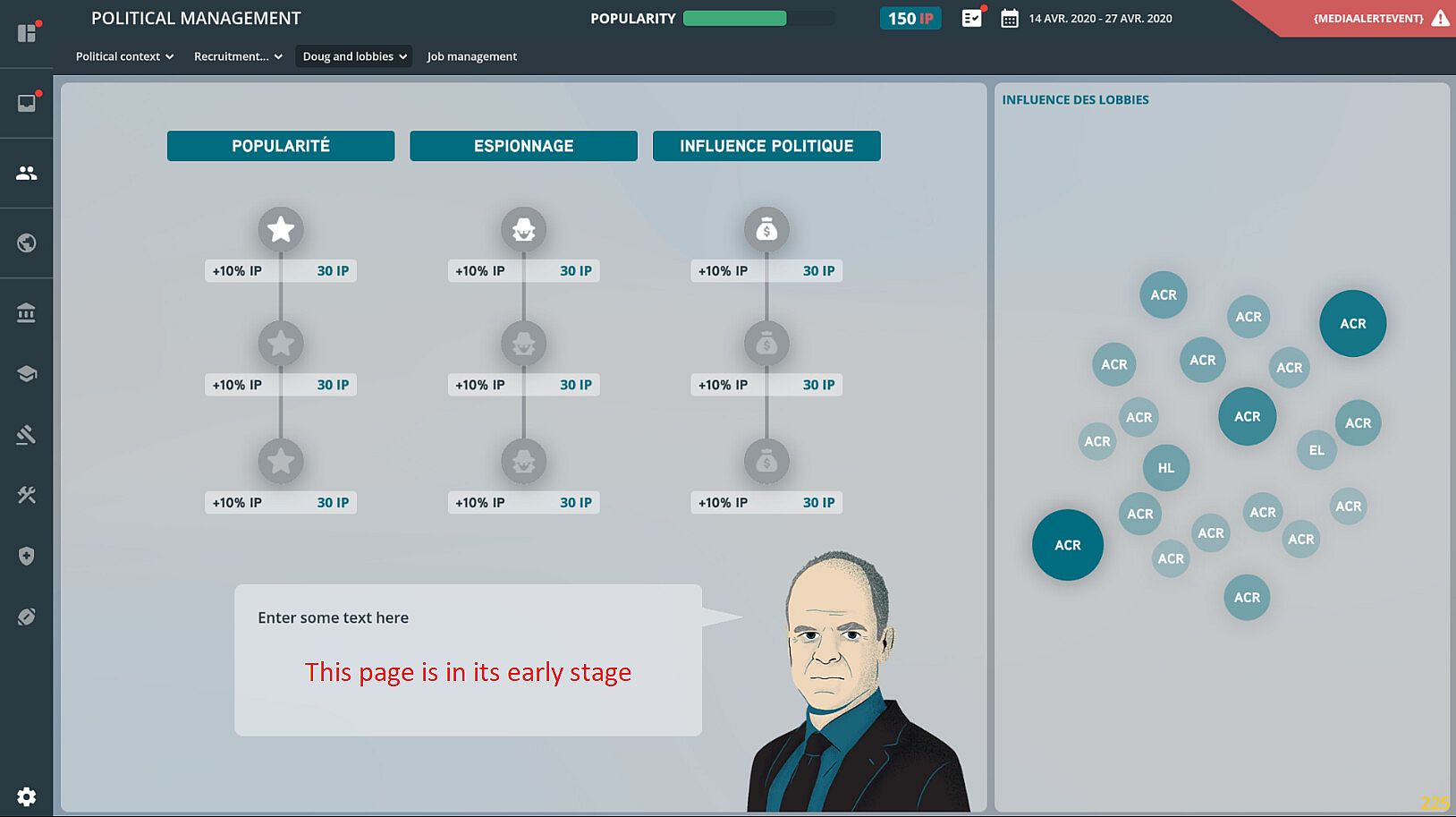 While the democratic process is not accurately portrayed, most of its components are retained, including the voting system. The interactions within political life are, however, fantasized. Scandals, often inspired by real political affairs, are a regular feature of the news. At each round, events have a probability of occurring. They can be random or linked to the player's previous actions. These events confront the player with a problem to which he must respond from among the multiple choices offered to him.