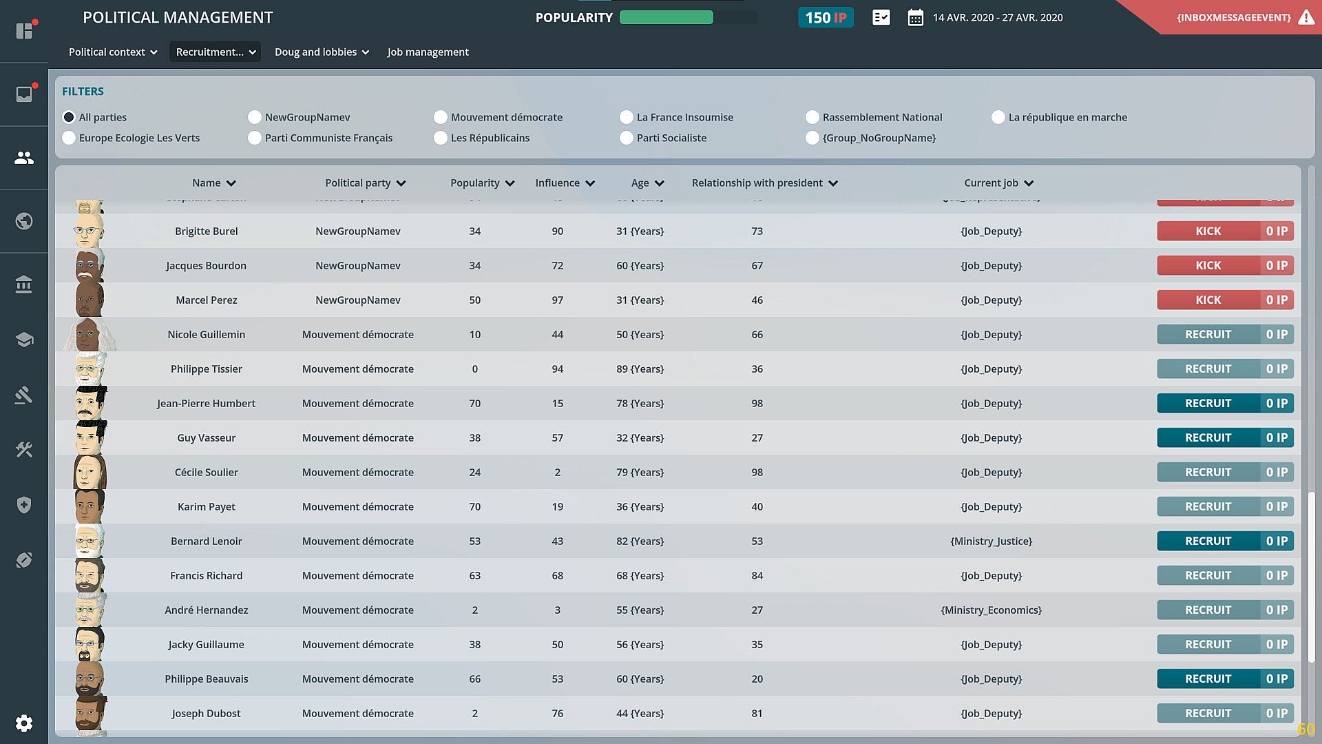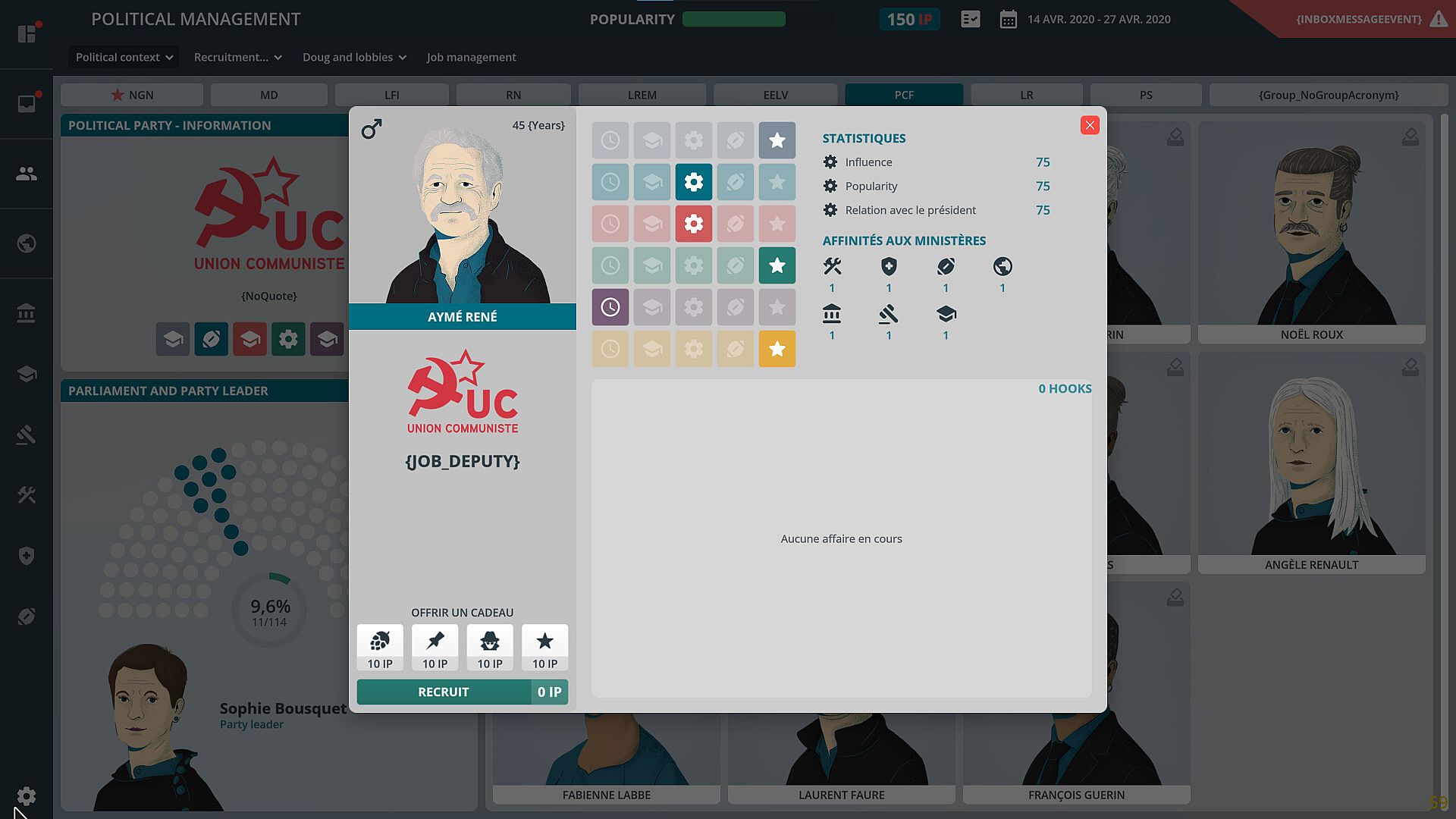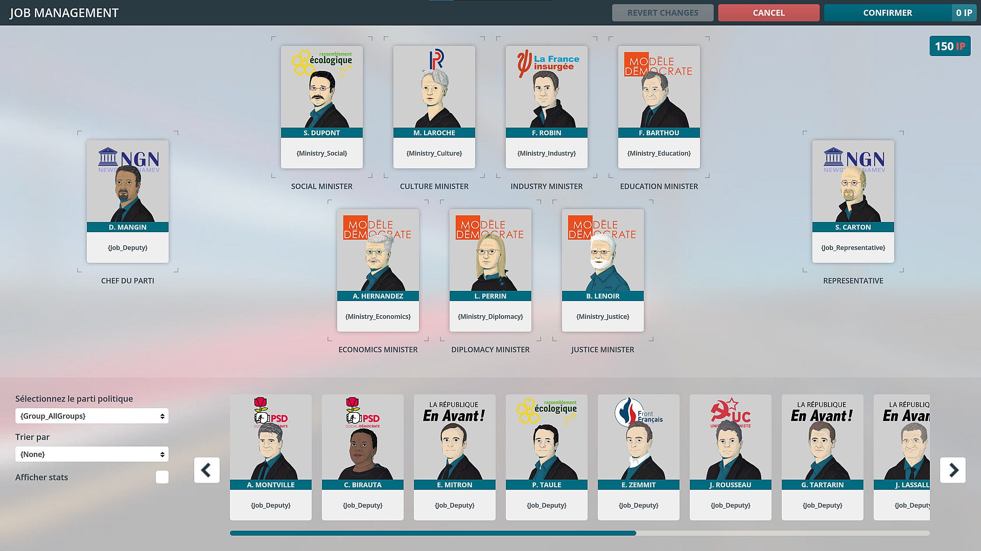 • The player can decide at any time on a ministerial reshuffle, or on a simple allocation of a position among a dozen to be filled.