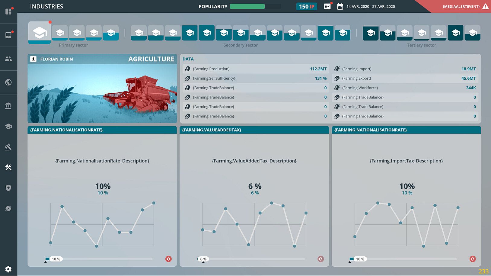 • In each round, events have a probability of occurring. They can be random or linked to the player's previous actions. These events confront the player with a problem to which he or she must respond from among the multiple choices offered.