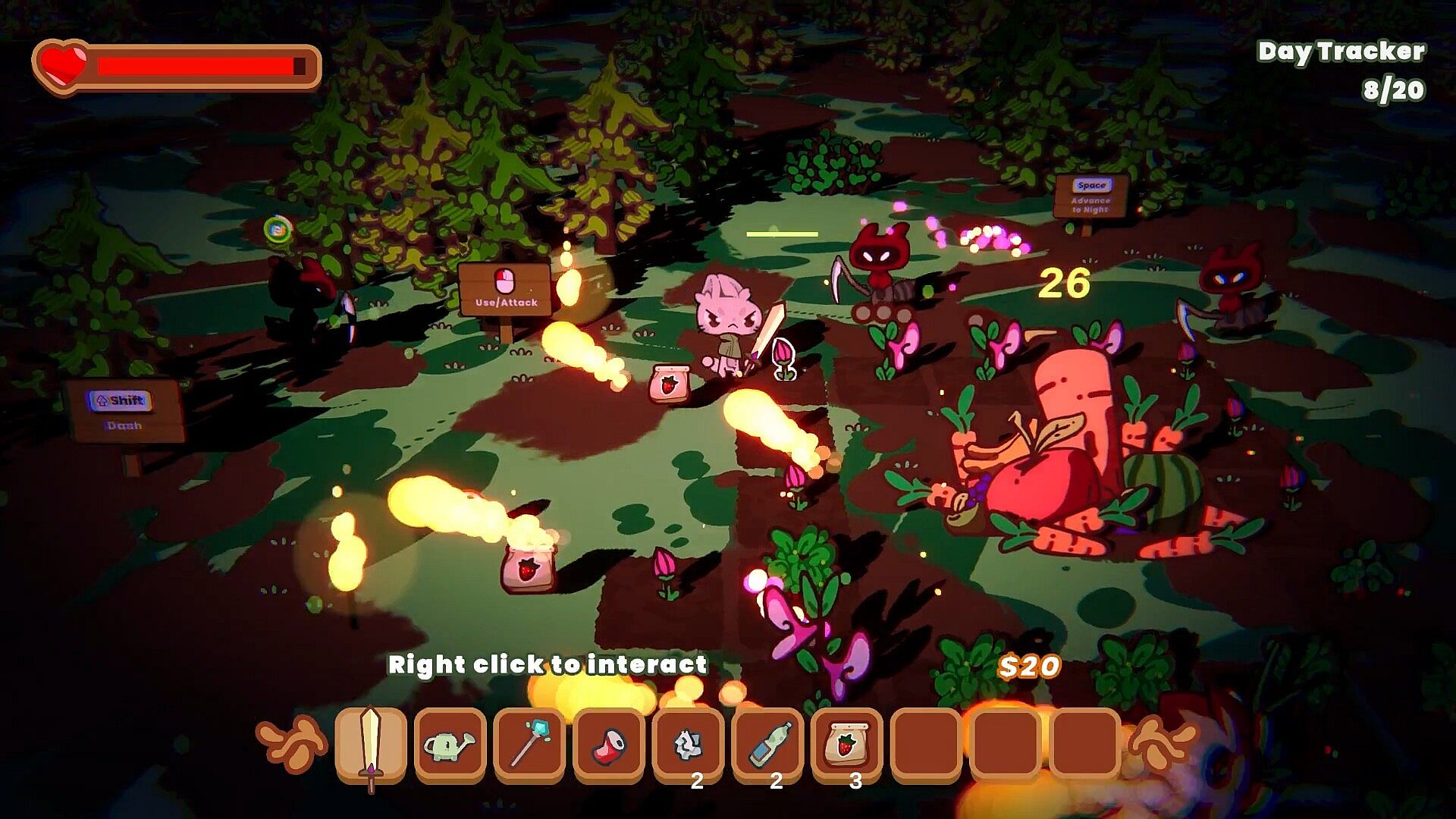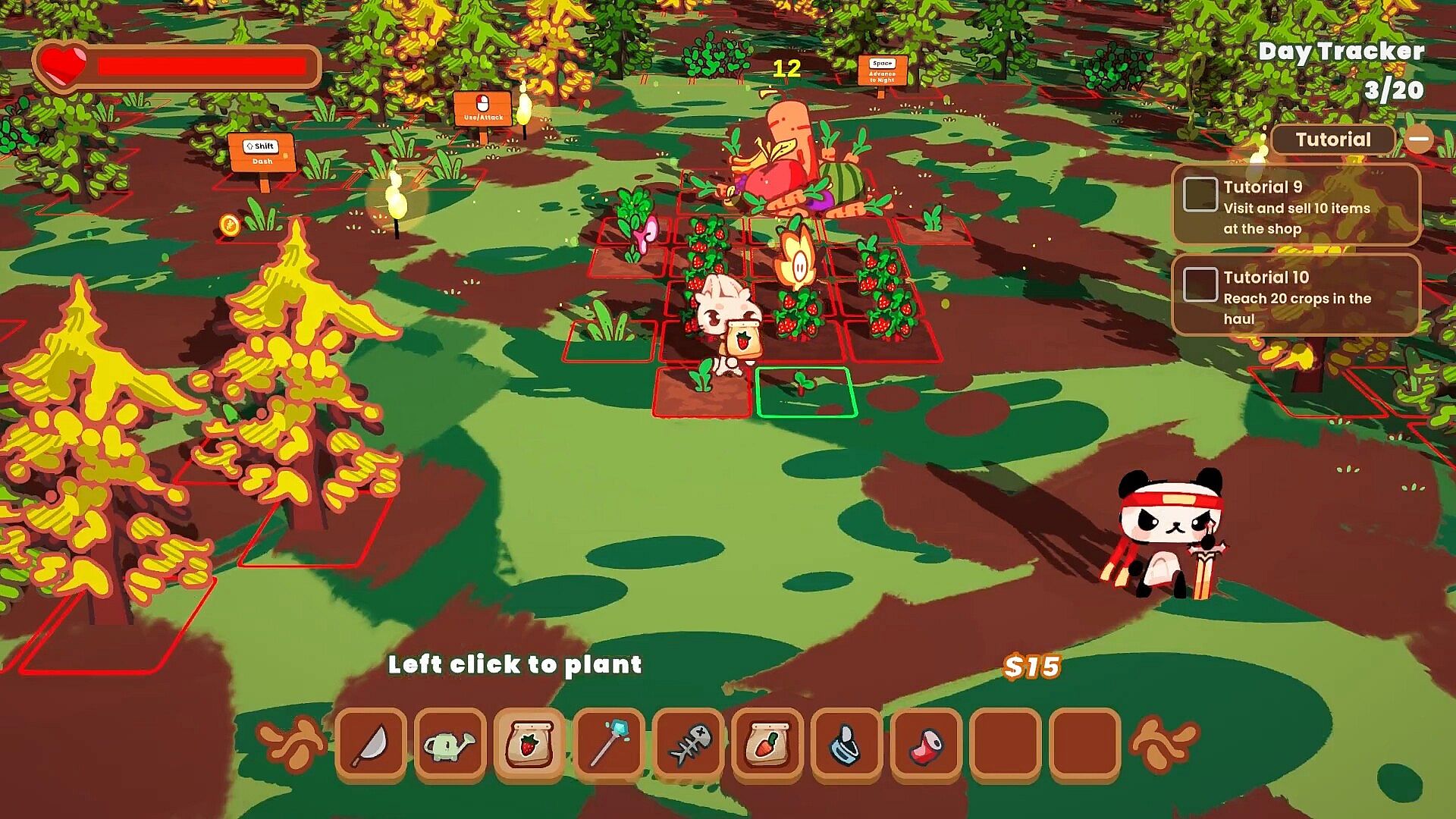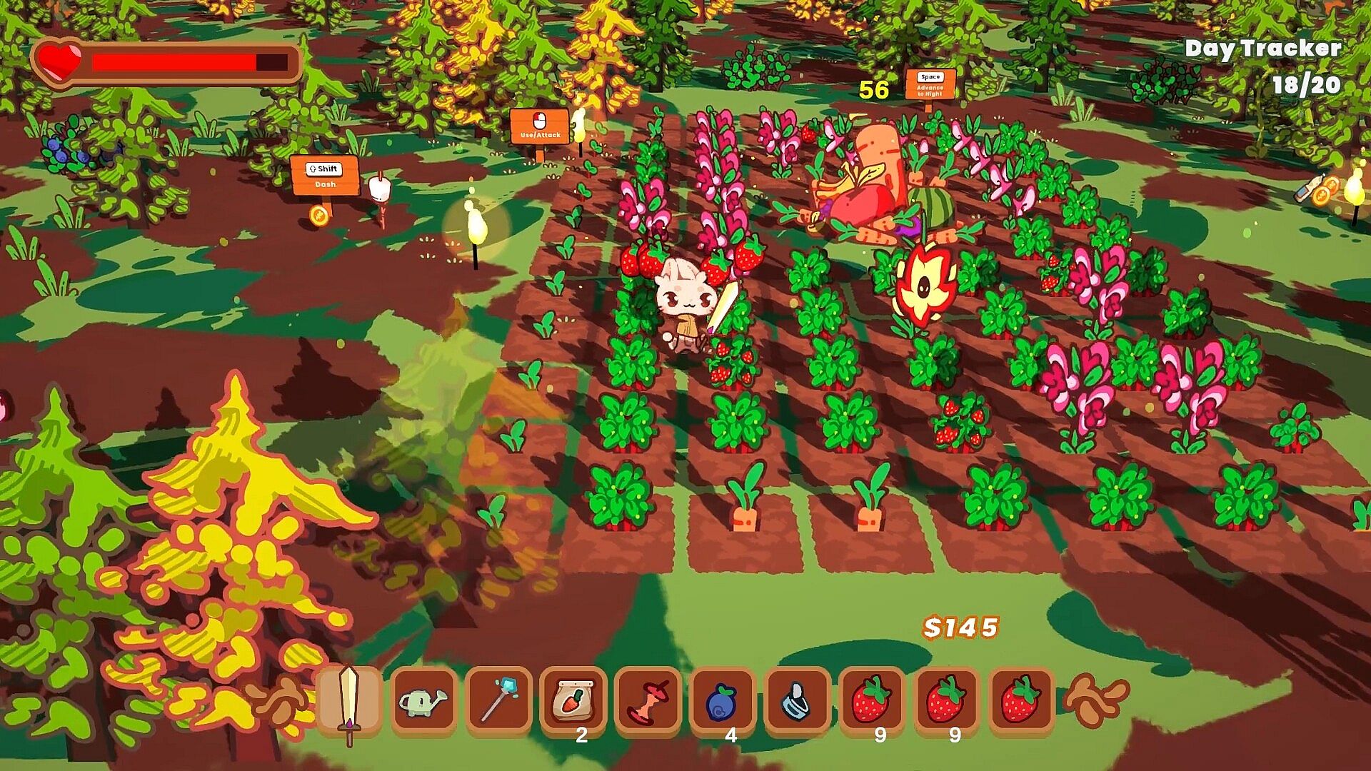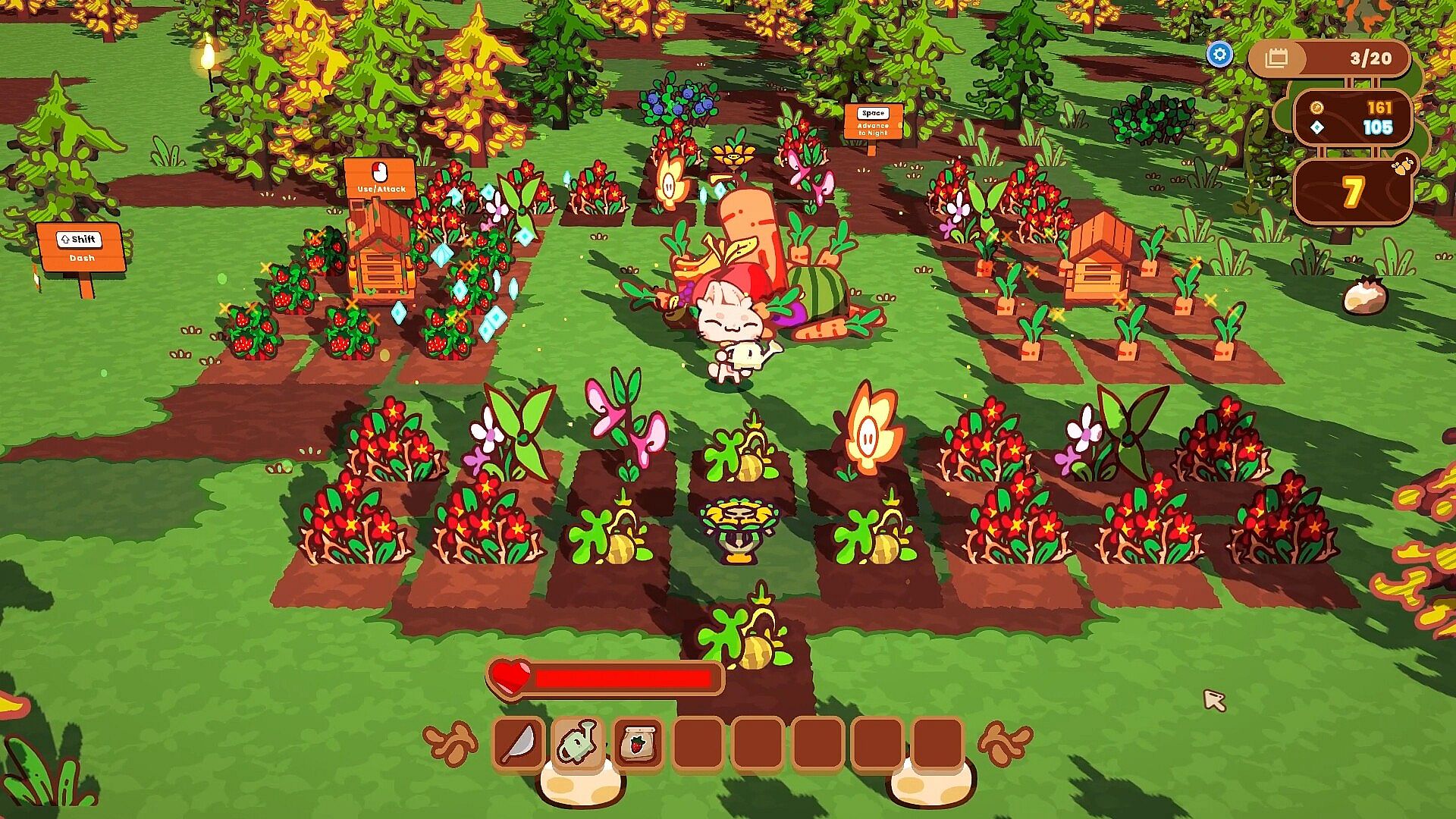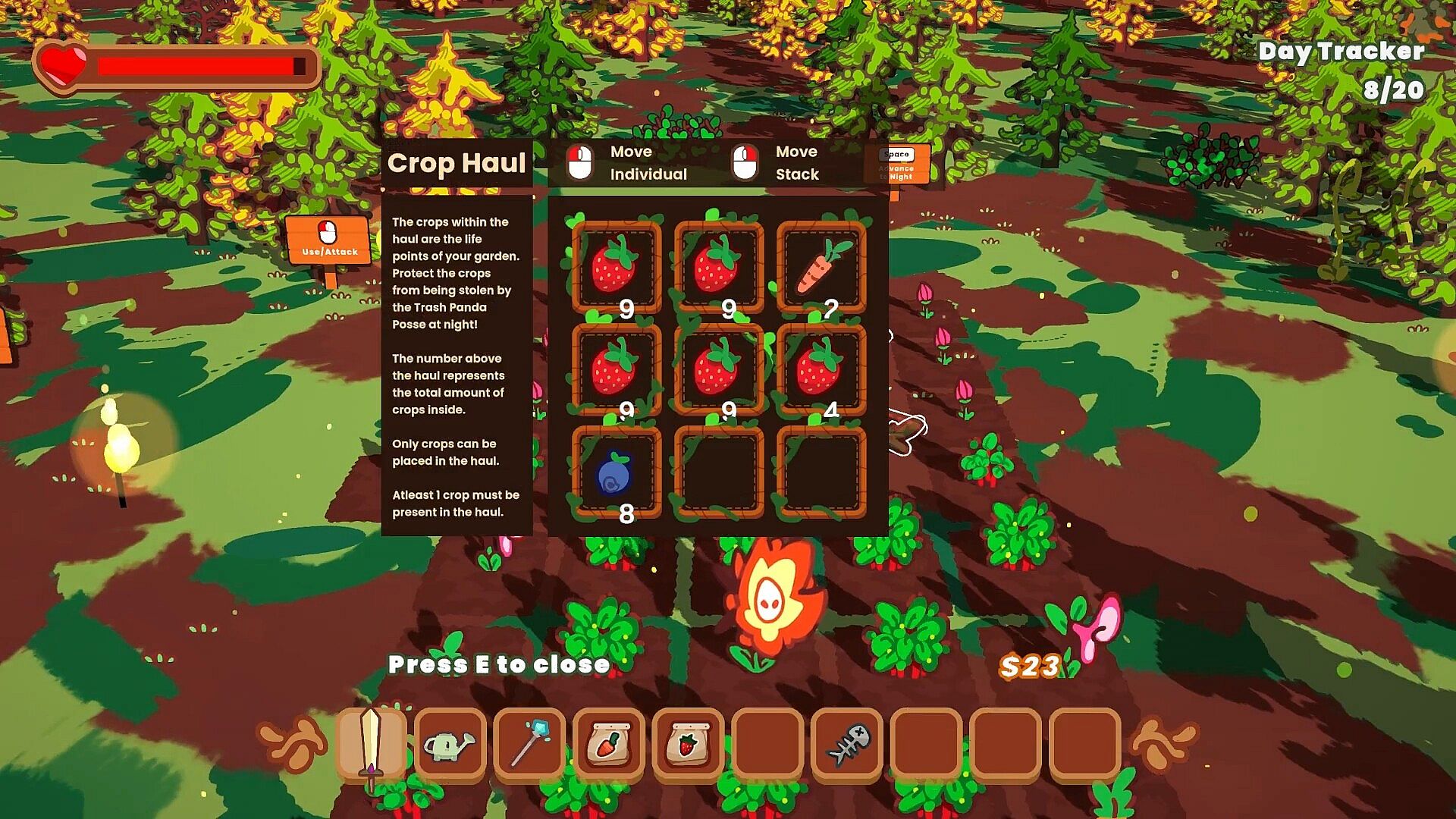 The Rabbit Haul has you playing a cute rabbit trying to rebuild their hometown that’s been ravaged by greedy raccoons. During the day, you are growing crops in your farm and adding them to your food haul to help rebuild your town’s economy and food reserves, as well as planting and growing defensive tower plants that will help defend against the Trash Panda Posse. When you choose, you turn to the night phase to ward off increasingly difficult enemy waves attempting to bring you back to ruin. The cycle continues until you defeat all the waves in the run, and you are rewarded for your progress to rebuild the town and upgrade yourself for the next adventure.