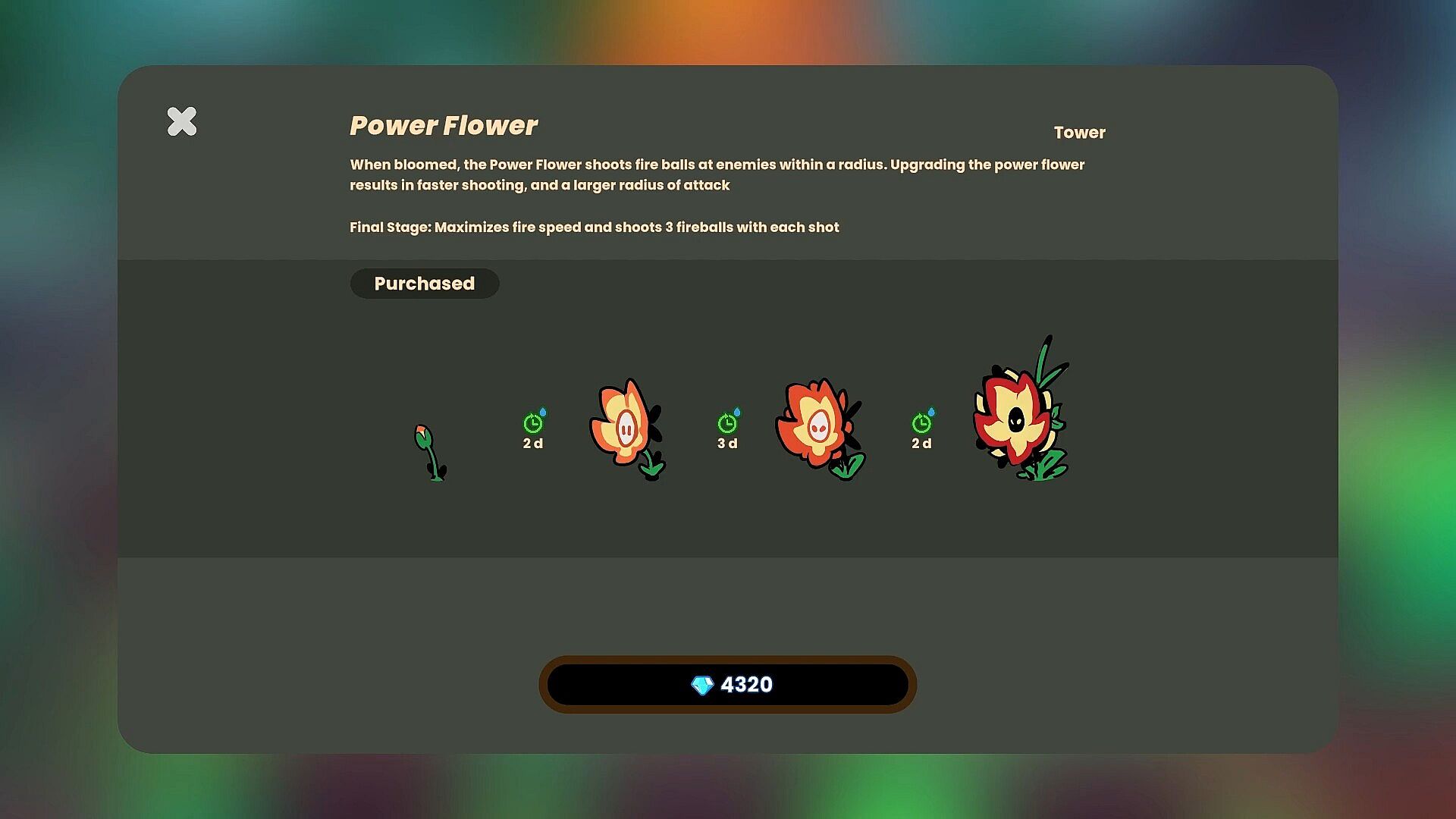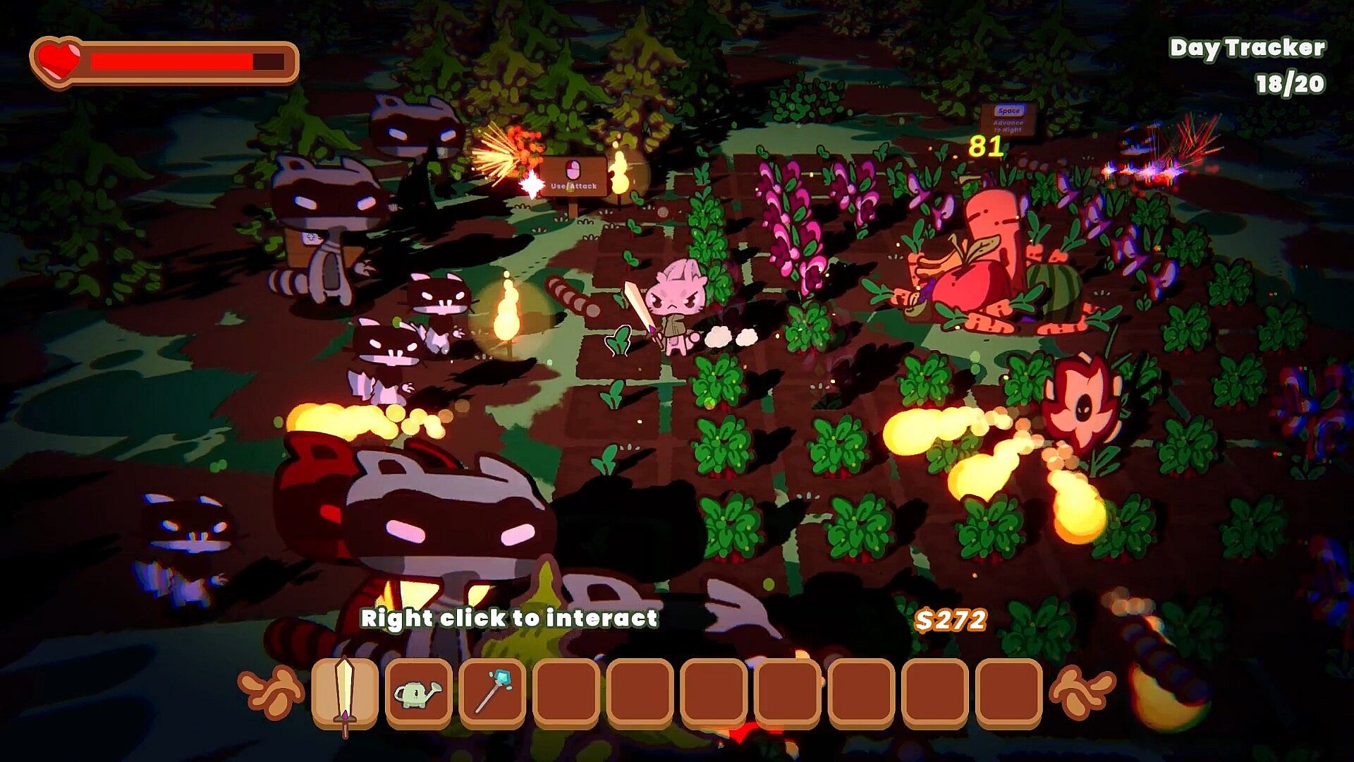 When you choose to go to the night phase, you will defend your haul alongside your flower towers against an increasingly stronger Trash Panda Posse. Each wave gets stronger, with different enemy types attempting to spoil your riches, so you must upgrade your weapons and defenses to ensure you can survive the night and make it to the next day.