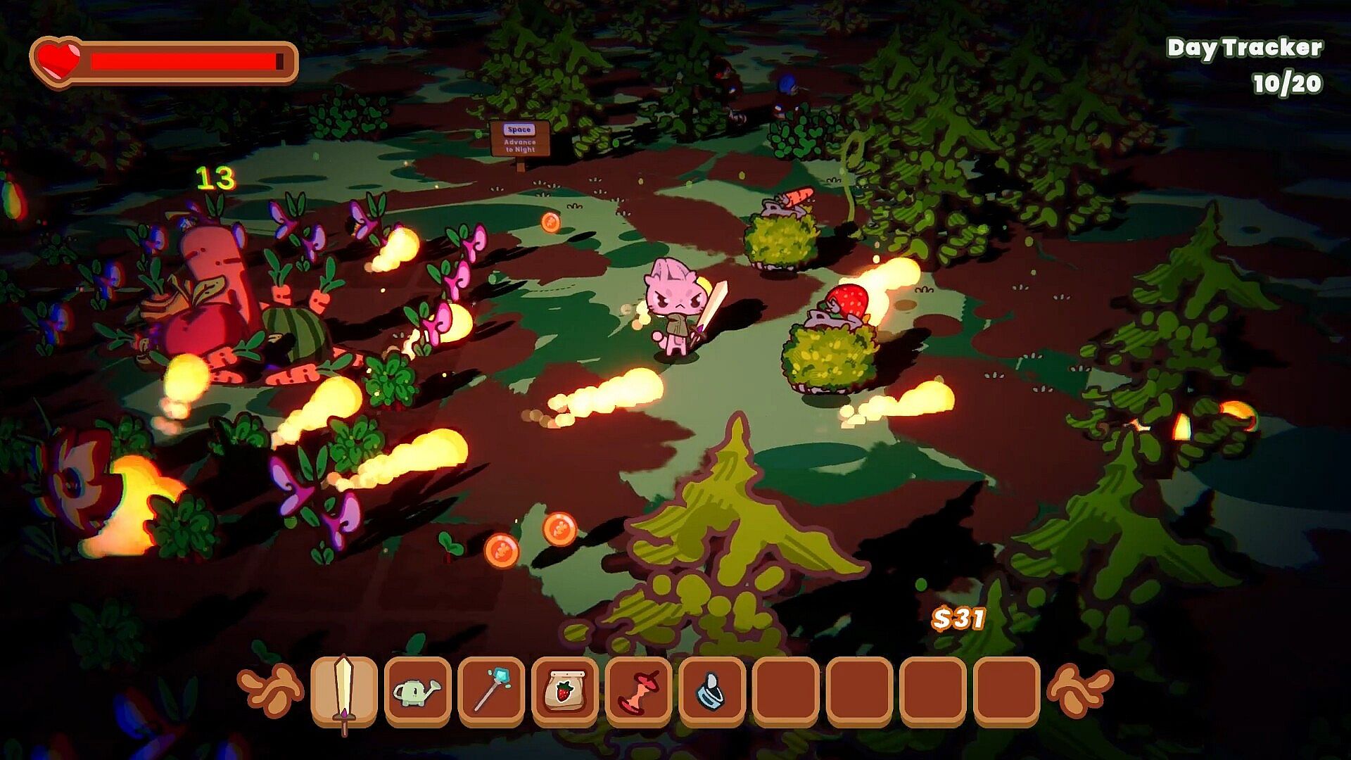 During the day phase, you can spend as much time as you’d like growing your garden. Plant crops and towers, water your farm, upgrade your defenses, and add harvested crops to your haul. Be strategic in your placement - you will be awarded for synergies created between plants - making the best garden possible.