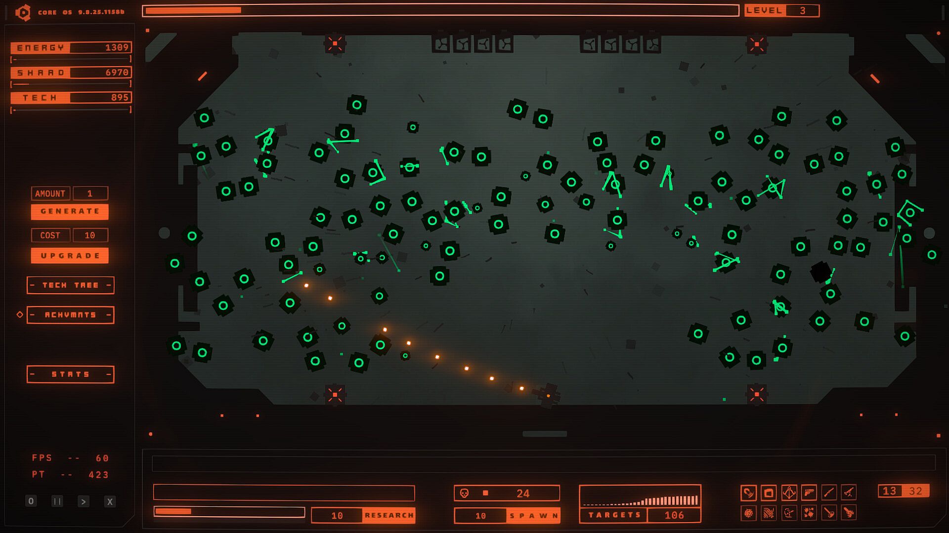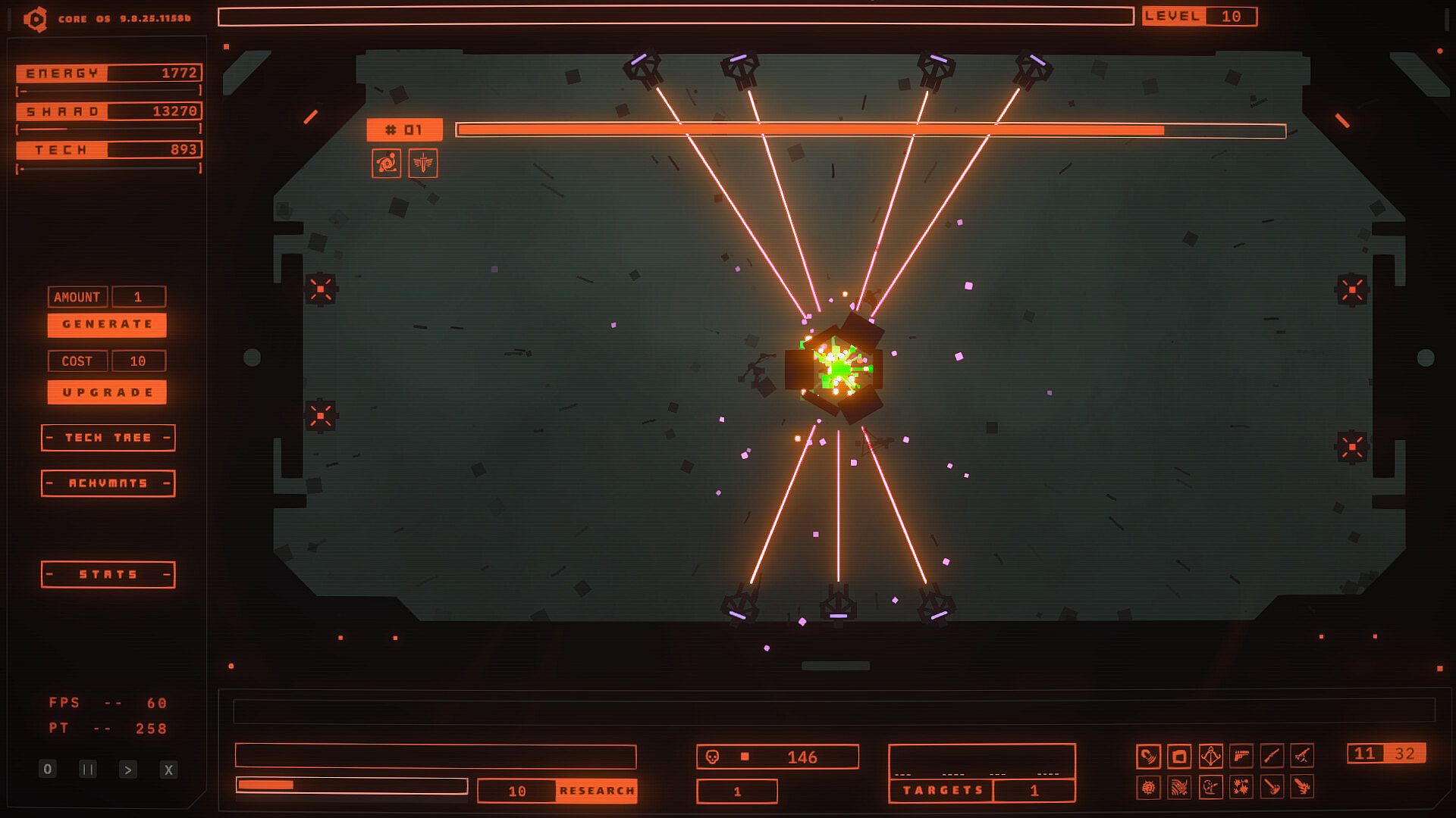 As the anomalies become stronger, you must also invest resources into research and technology. Progress through the tech-tree to unlock new types of weapons and effects, improve resource generation and automate key systems. You can explore different branches, or focus heavily into a specific type of technology.