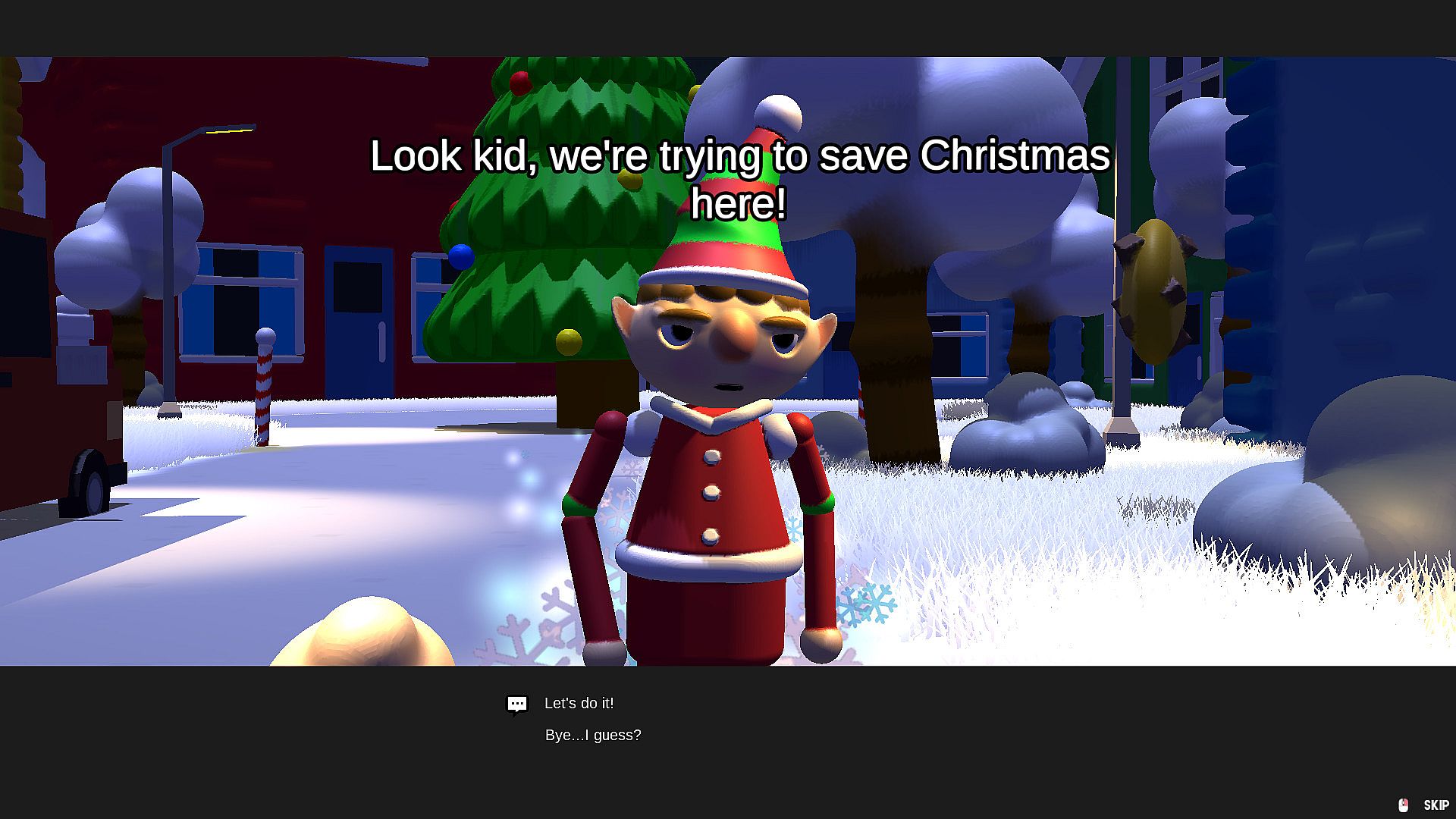 The Santa Paradox is a short, first person adventure game featuring dialogue choices and light puzzle gameplay. Through each of the levels you need to create as much happiness as possible, either by helping others or engaging in activities that you find fun as a kid!