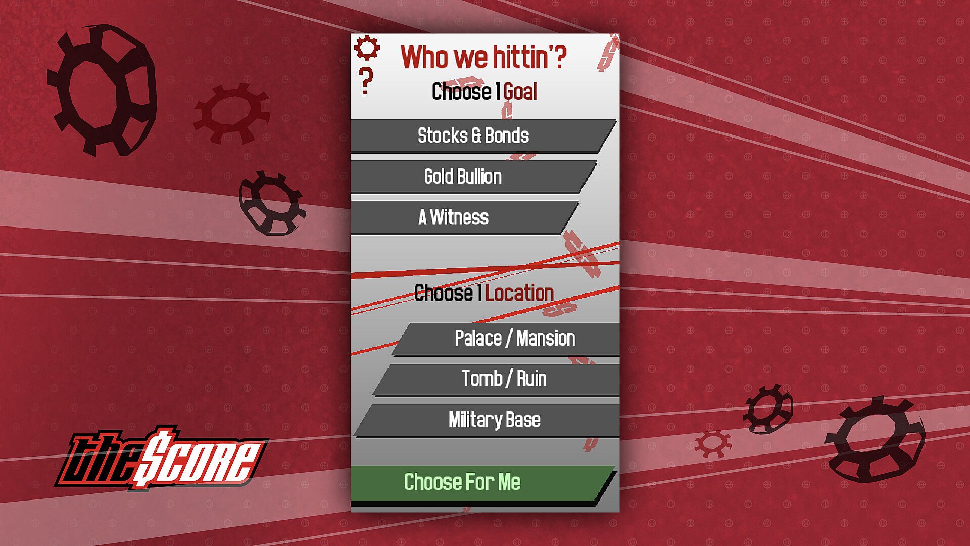 First, you'll pick a location you're breaking into and a thing you're trying to steal. Pick anything that sounds cool!