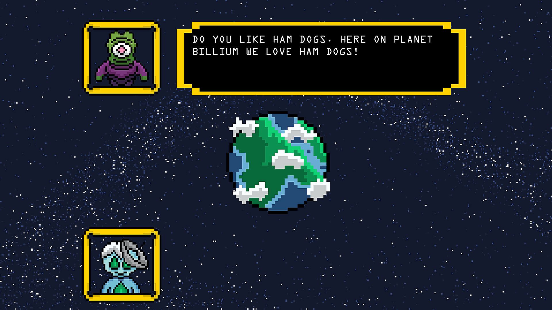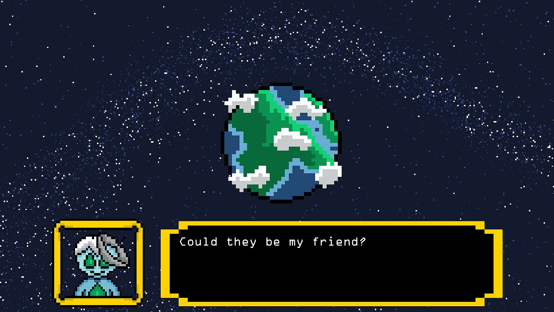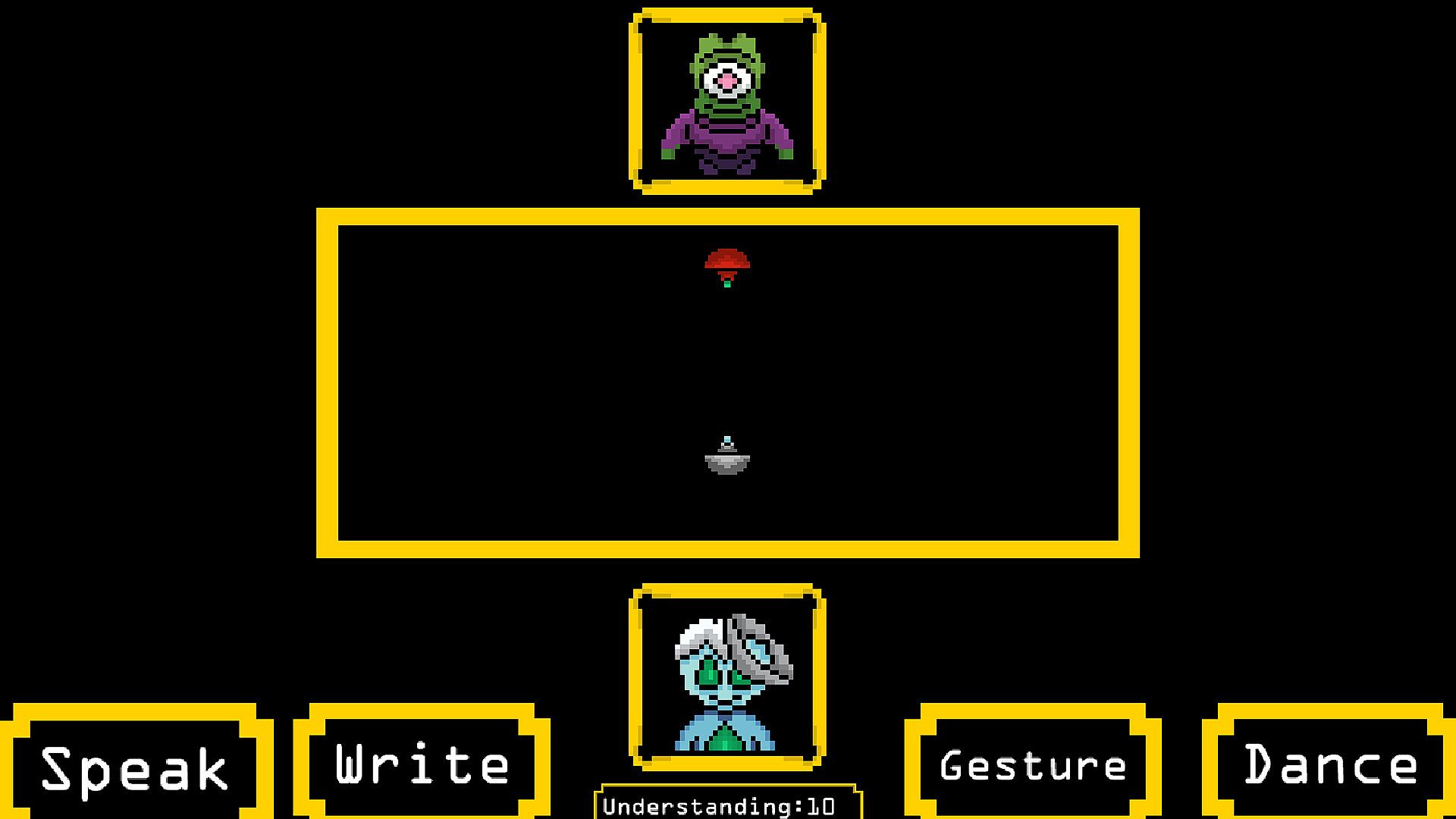 Choose how to communicate—Speak, Write, Gesture, or Dance—then dodge red “misunderstanding” projectiles and collect green “understanding” to build trust. Expand your star map, meet eccentric aliens, unlock hints, and discover what it means to find life that’s truly above average.