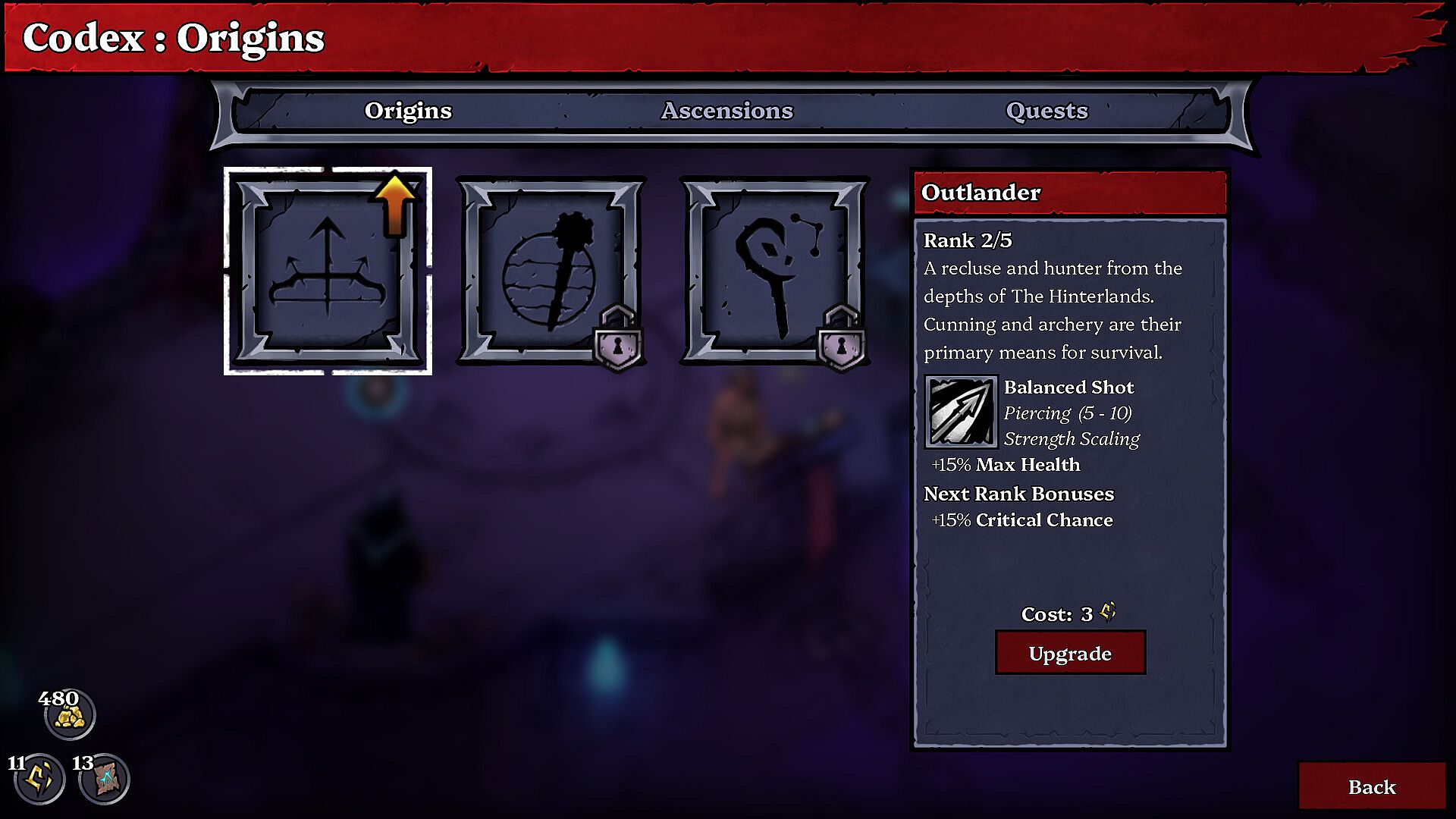 Each run will start by choosing a character Origin. This Origin will decide the starting weapon, skill, and stats of your character for the run. After completing two stages in the run you will select an Ascension for the remainder of the run. This Ascension will increase and specialize your stats. Additionally, a powerful Ascension Aura will be created around your character. Origins and Ascensions can be permanently upgraded through the Codex at your hub.