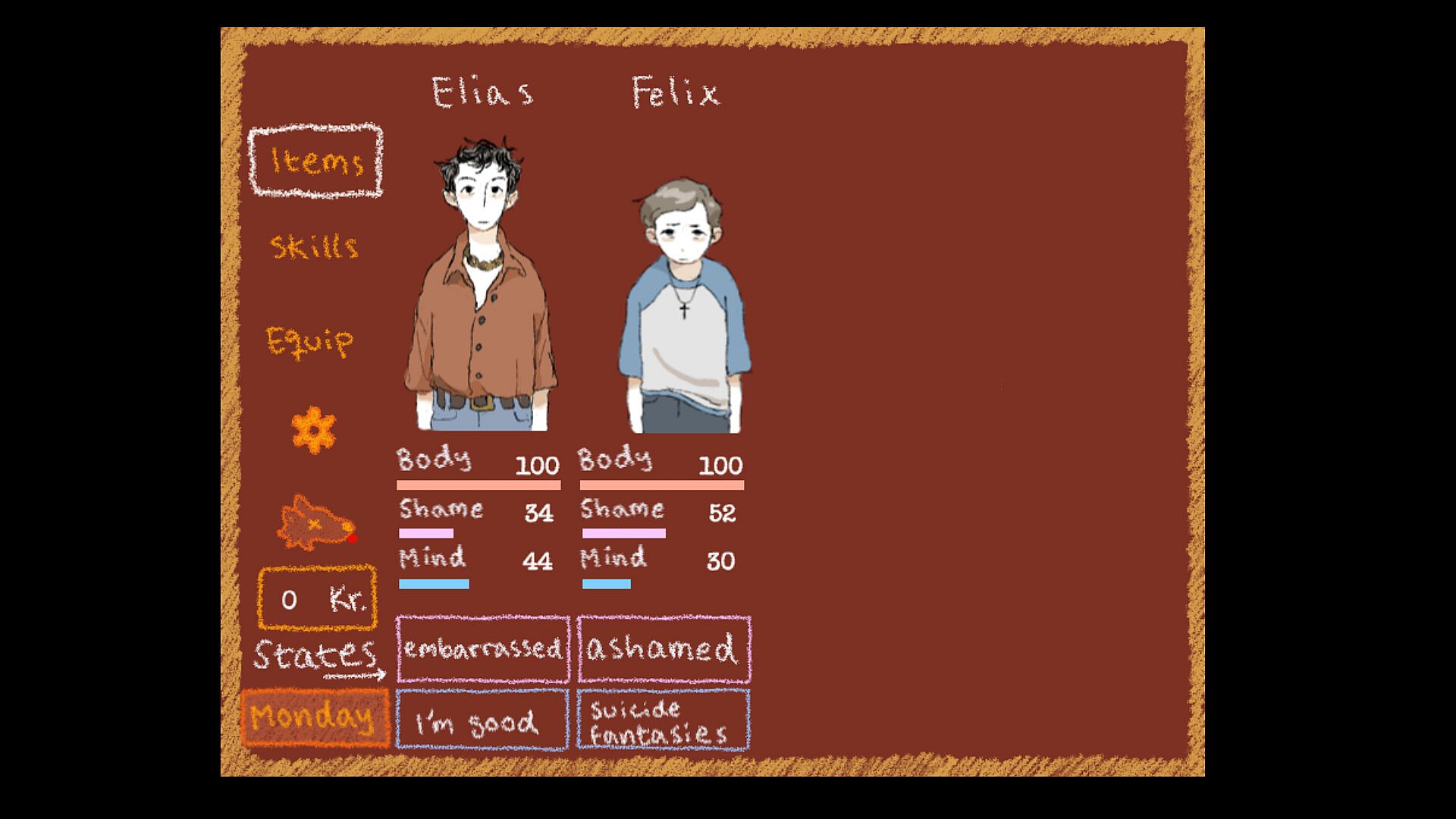 Prevent a looming apocalypse in the mind of a daydreamer by navigating interactions with morally grey characters in a colorful, hand-drawn small Swedish town that conceals otherworldly secrets. This indie RPG unfolds over six days across two playable characters, each offering distinct content that shapes a complex story with branching paths and multiple endings. A unique mechanic ties shame and mindset to gameplay, driving dialogue-heavy choices where both good and bad decisions unlock consequences, knowledge, and varied scenarios. Players switch between vessels of shame like warm-yet-suspicious Elias, his towering father Elliott, or enigmatic figures such as Alice, Felix, Levi, and Sebastian to reveal hidden connections and avert dead ends. Choices ripple through a web of variables, blending repression, longing, and perverse undertones in a reading-intensive experience. Fans of choice-driven indie RPGs with deep narrative consequences will uncover the fullest picture by replaying both characters.