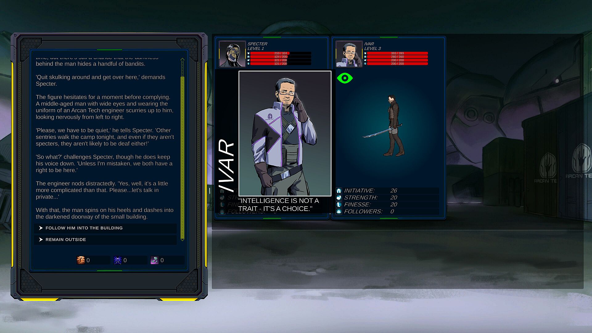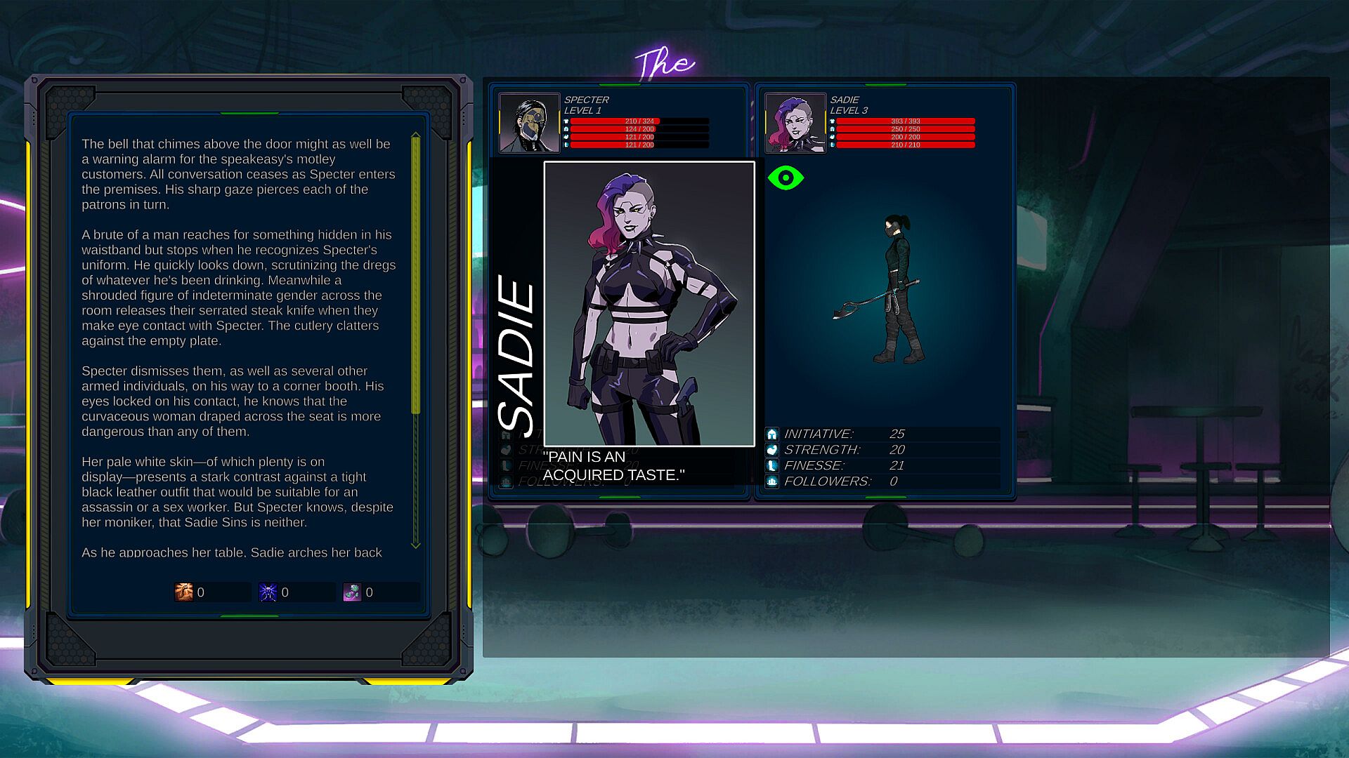 The Specter Chronicles is a cyberpunk visual novel that combines text-based adventure with turn-based tactical combat.
