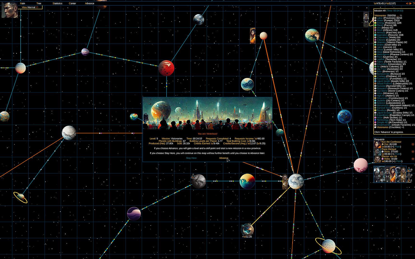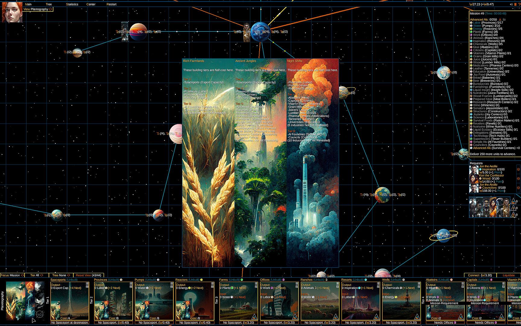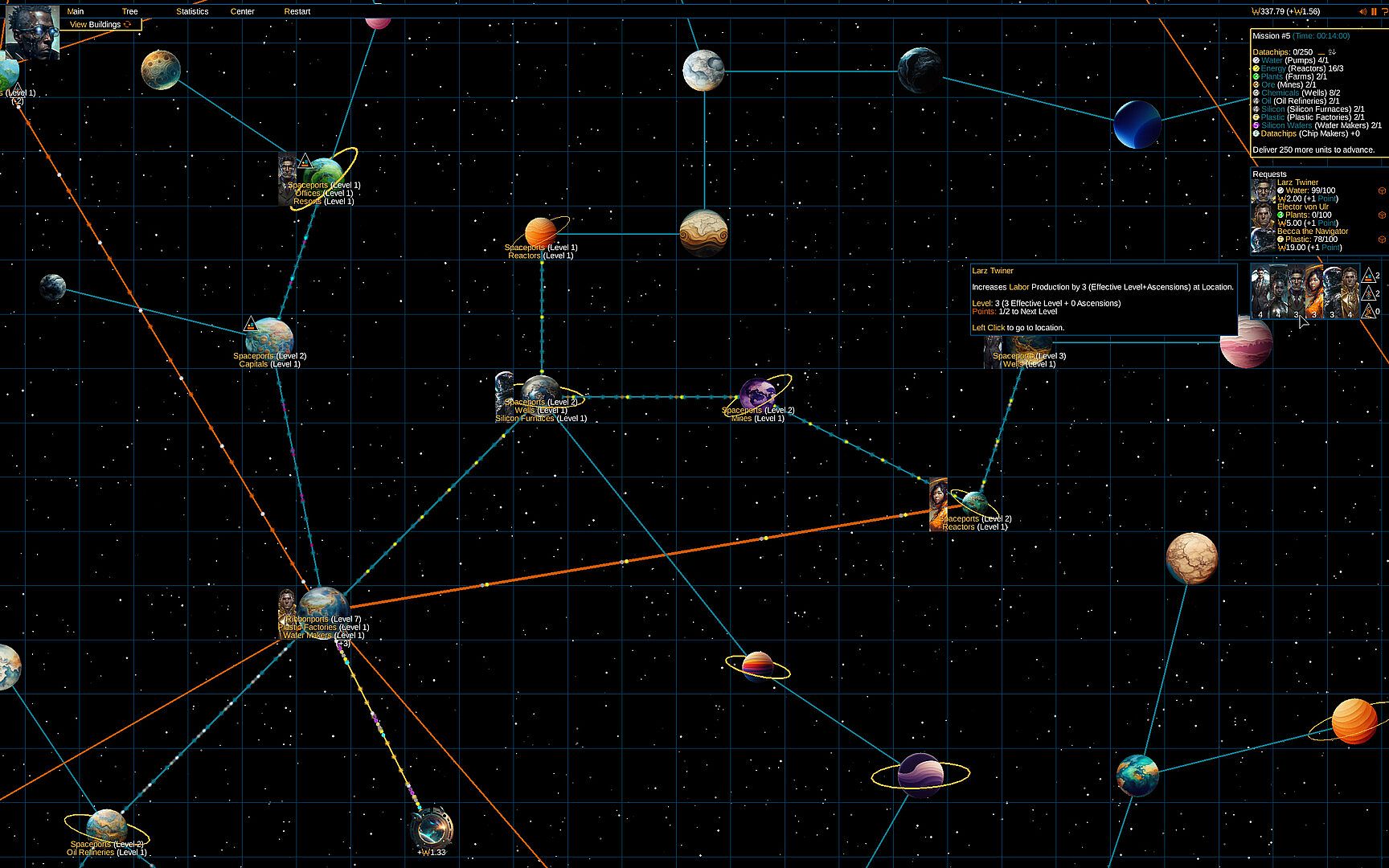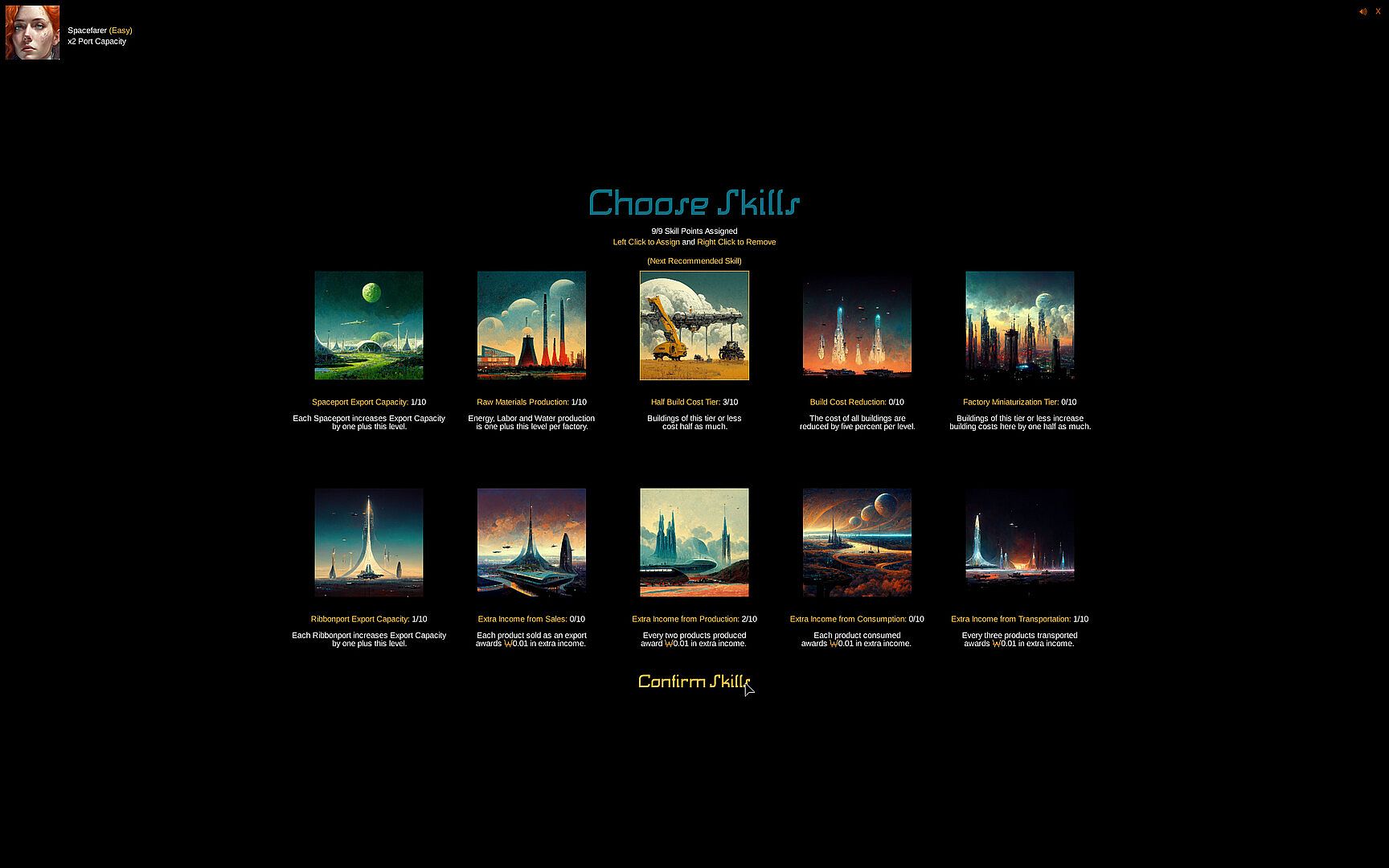 When you complete a Mission, you will gain a level and a skill point. Skill points can be used to increase production, increase export capacity, decrease building costs and to increase and optimize your income from the goods you produce, transport, consume and sell. Ascend through the levels and change the economic course of the galaxy!