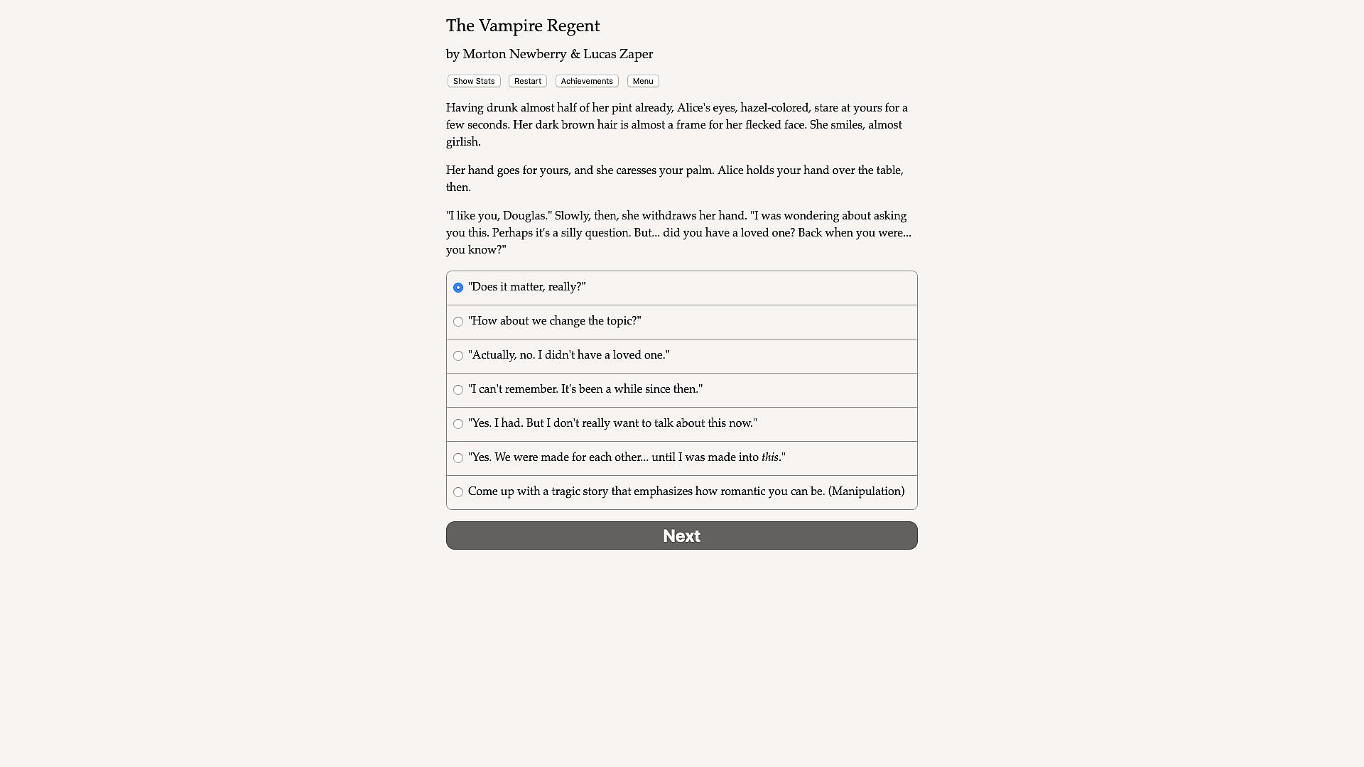 The Vampire Regent is a 460,000-word interactive dark fantasy novel by Morton Newberry and Lucas Zaper, where occult political disputes and clashing loyalties tell the twisted story of a town