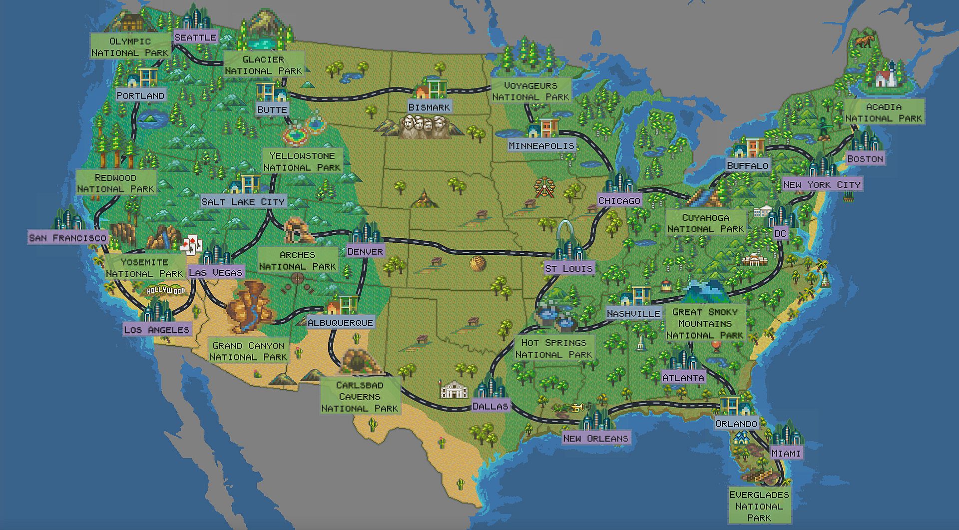 Embark on a retro-style road trip across the USA in a pixel-art van adventure. Explore 14 national parks while tackling dozens of choose-your-own-adventure encounters with police, eccentric locals, and other travelers. Play through 7 mini-games and manage money, food, gas, and crew morale to keep the journey going. Contract any of 12 illnesses like dysentery and upgrade your customizable van to handle the challenges. Collect stamps in your park passport along the way. This indie casual game suits fans of resource management and lighthearted Oregon Trail-inspired travel sims.
