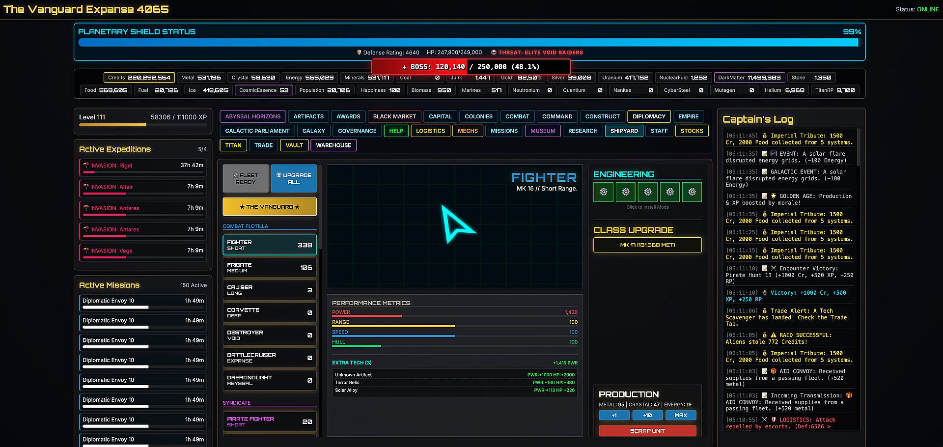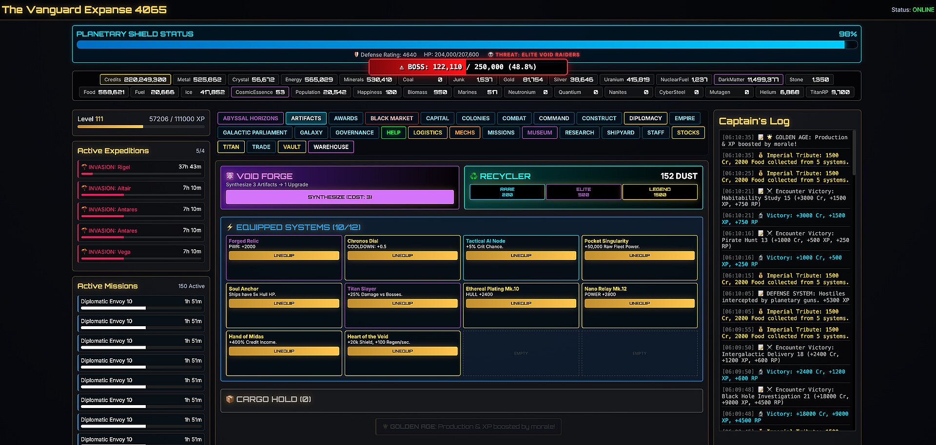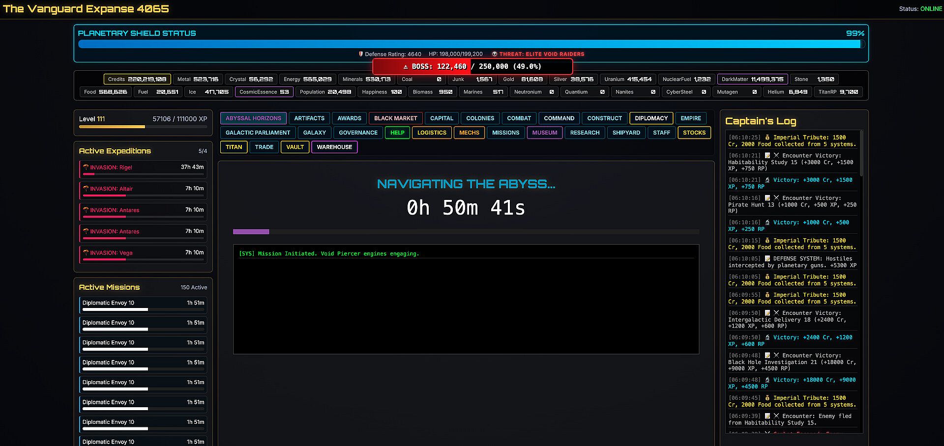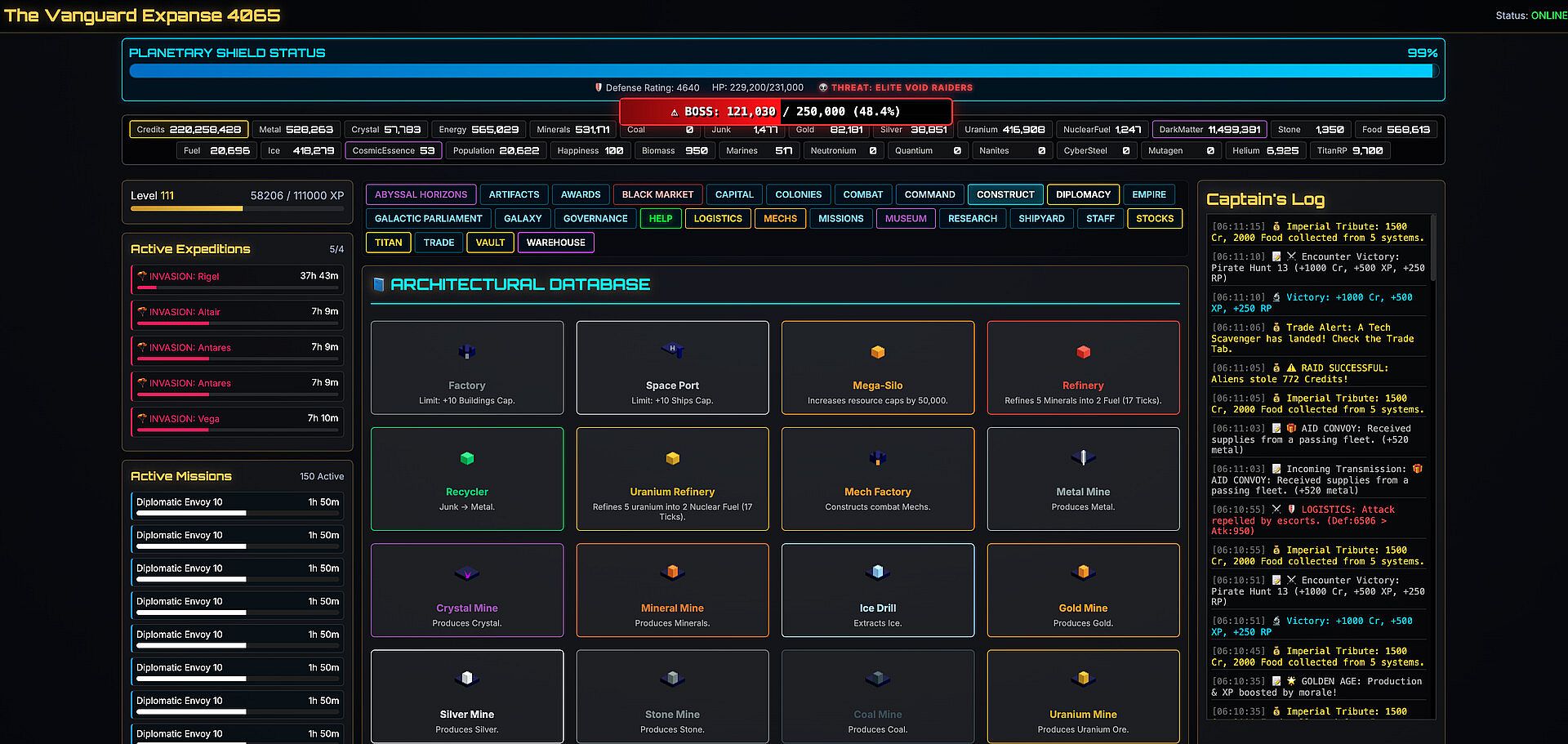 The Vanguard Expanse 4065 is a text-based incremental strategy RPG that fuses deep 4X empire building with infinite procedural progression. This isn't just about watching numbers go up; it's about adapting to a galaxy that changes every time you blink.