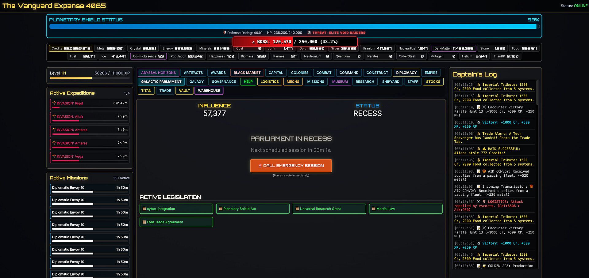 POLITICS & THE BLACK MARKET Join the Galactic Parliament. Use Influence to pass galaxy-wide laws—vote for Martial Law to boost your fleet damage or Free Trade to supercharge your economy. If politics fail, visit the Shadow Exchange to smuggle illegal goods and bribe factions.