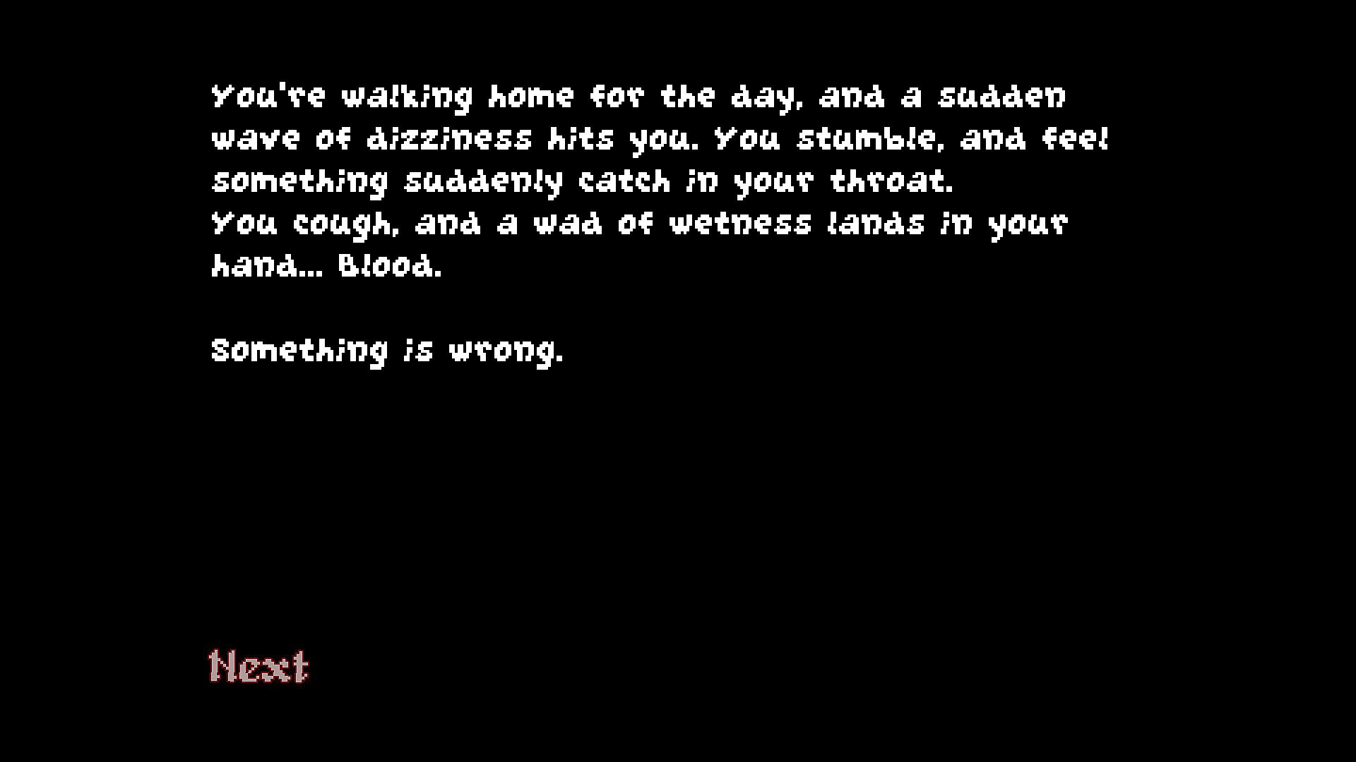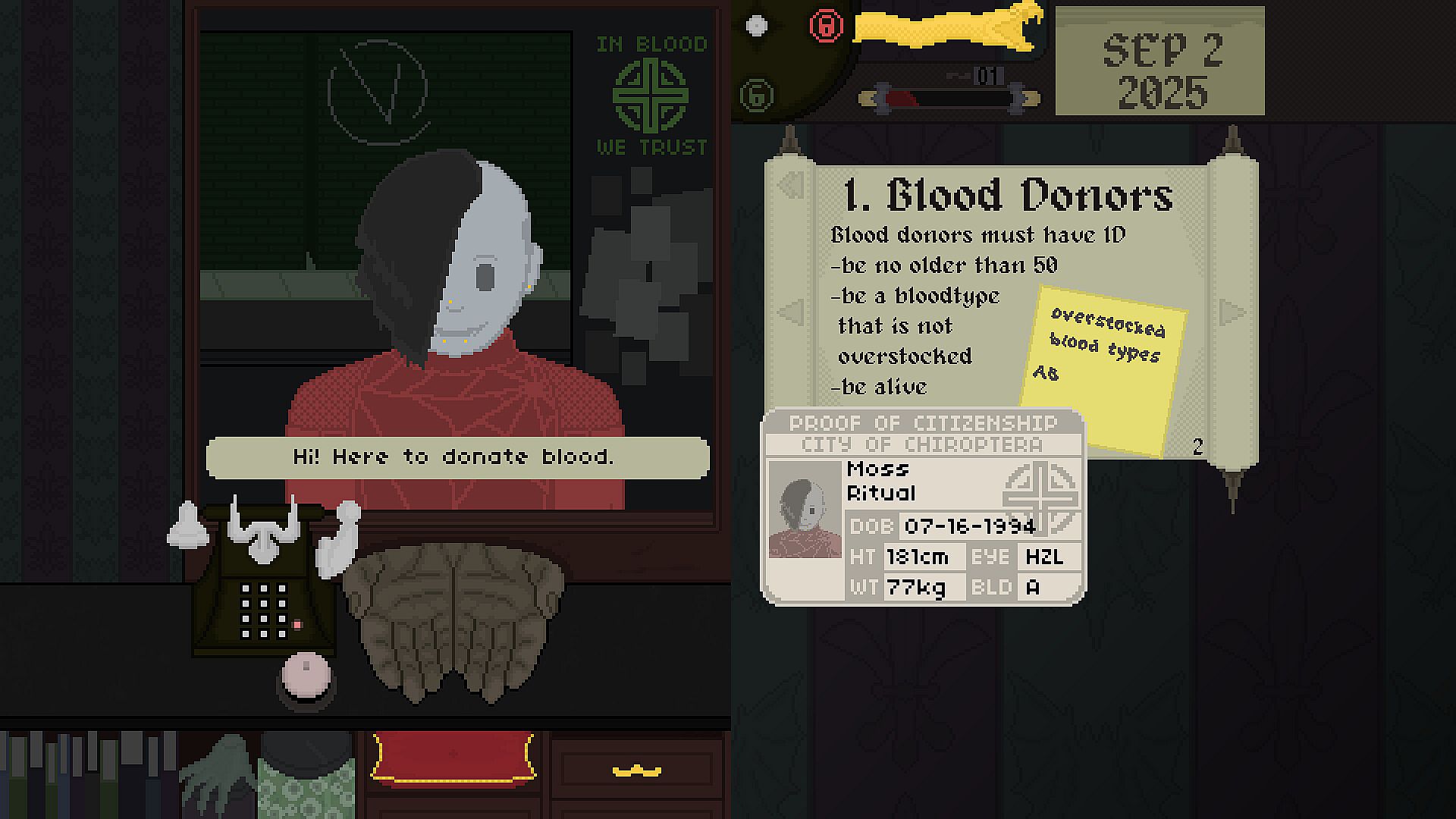 New apartment, new job. Unbothered working nights, you're taking the night shift at your local blood bank. All you need to do is make sure the donors fit the right requirements and let them in.